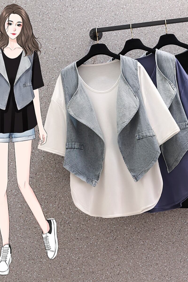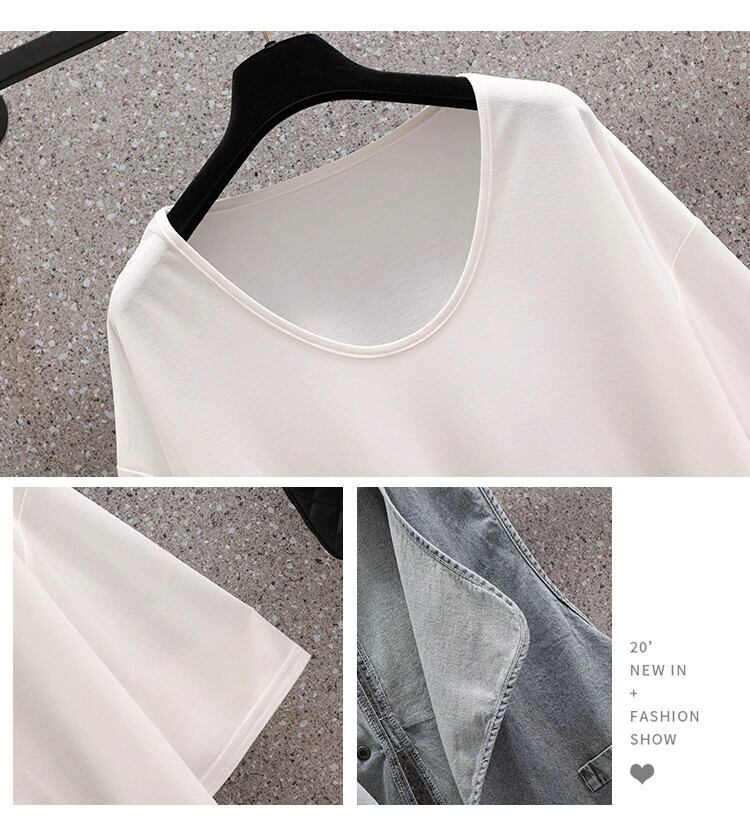 プラスサイズの婦人服 2023 ファットシスター夏の新 Tシャツ半袖デニムベスト痩身西洋スタイルツーピーススーツ 大きめサイズ サマー 夏物 888412962360986