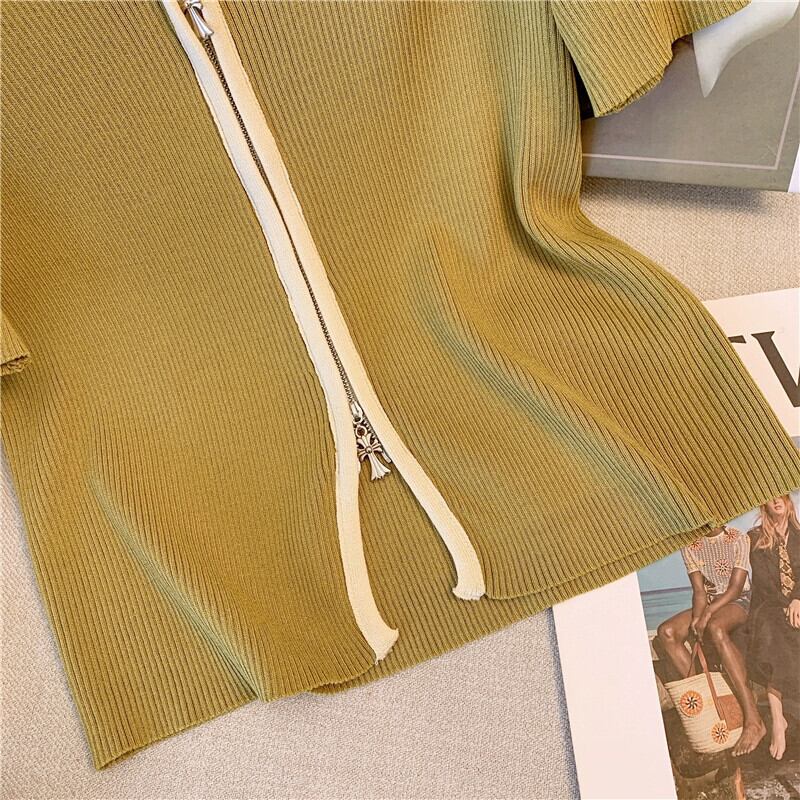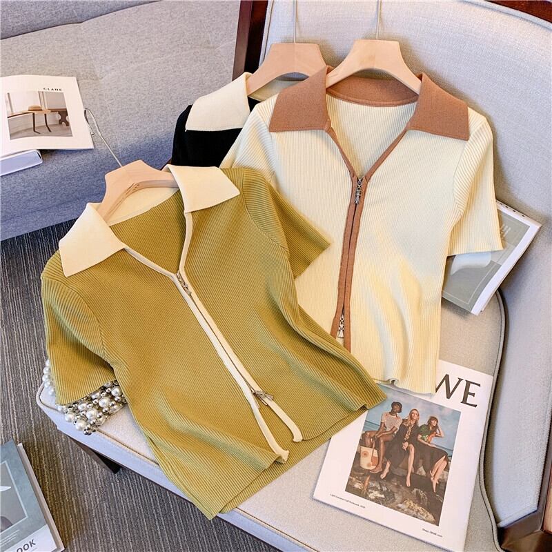 プラスサイズの婦人服 2023 流行の女性の夏の新しいファットシスターファッション気質痩身オールマッチニットジッパー半袖 T シャツ 大きめサイズ サマー 夏物 Tシャツ 8884146298614444