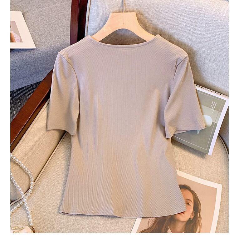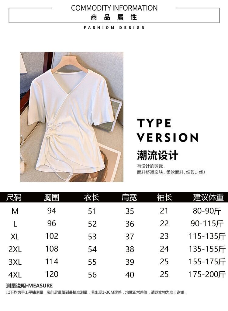 プラスサイズの婦人服 2023 流行の女性の夏の新しいファットシスターファッション V ネック巾着プリーツデザイン感の薄い半袖 T シャツ 大きめサイズ サマー 夏物 Vネック Tシャツ 8884117193294560