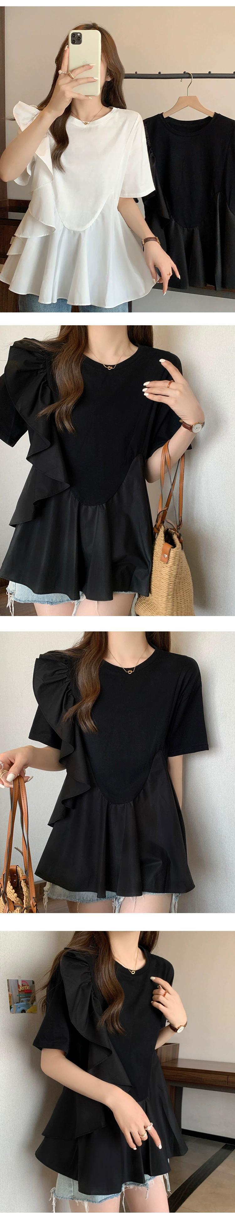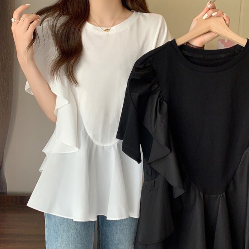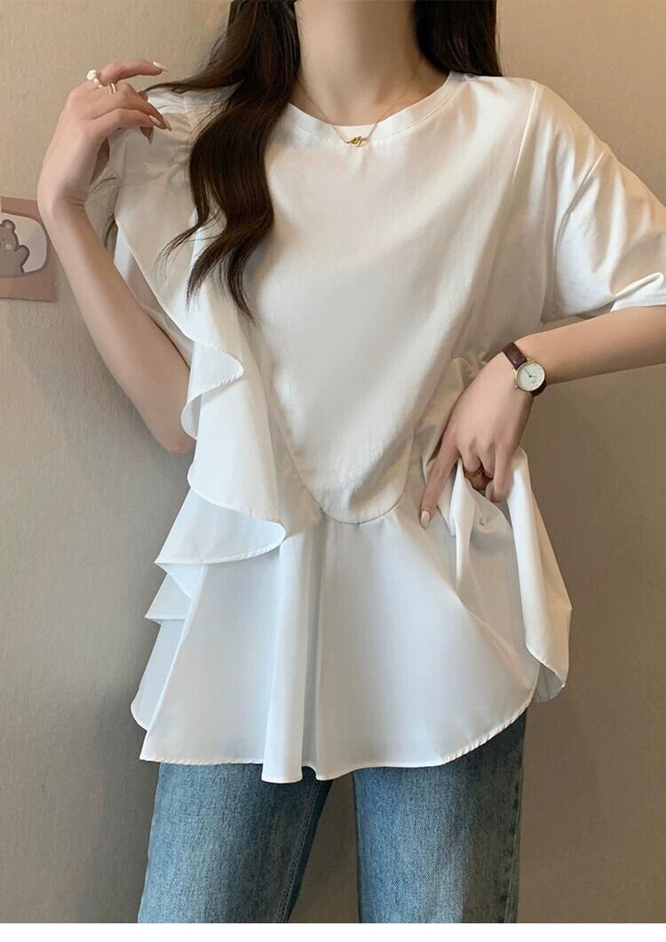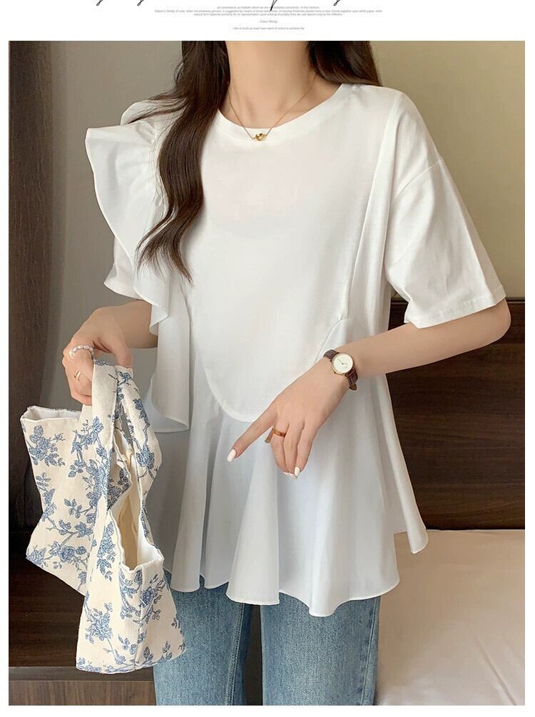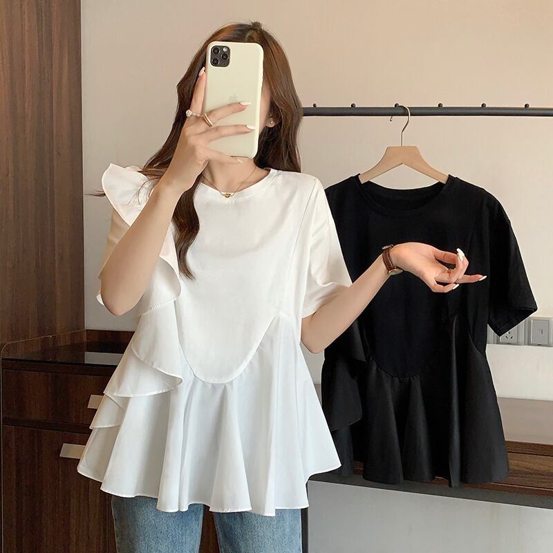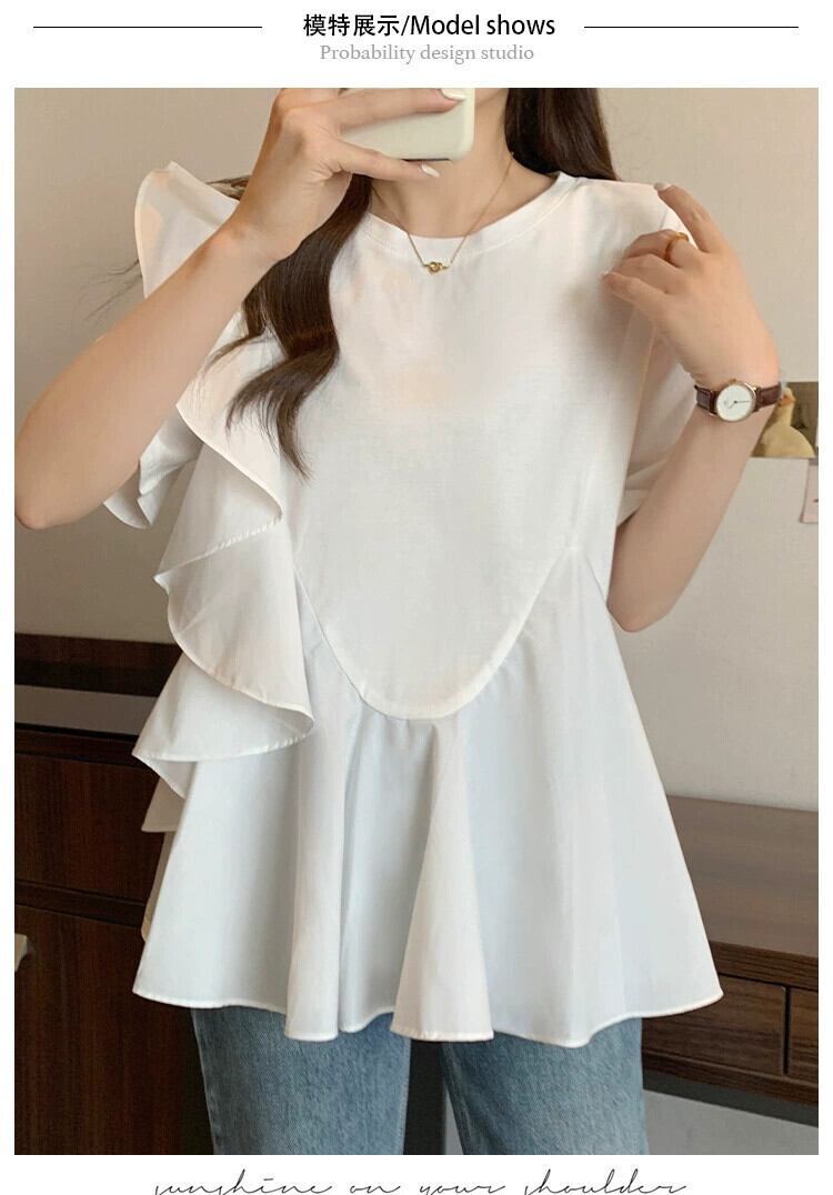 プラスサイズの婦人服 2023 流行の女性の夏の新しいファットシスターファッションフリルステッチ半袖腹カバー年齢軽減 Tシャツ女性 大きめサイズ サマー 夏物 8884128764319366