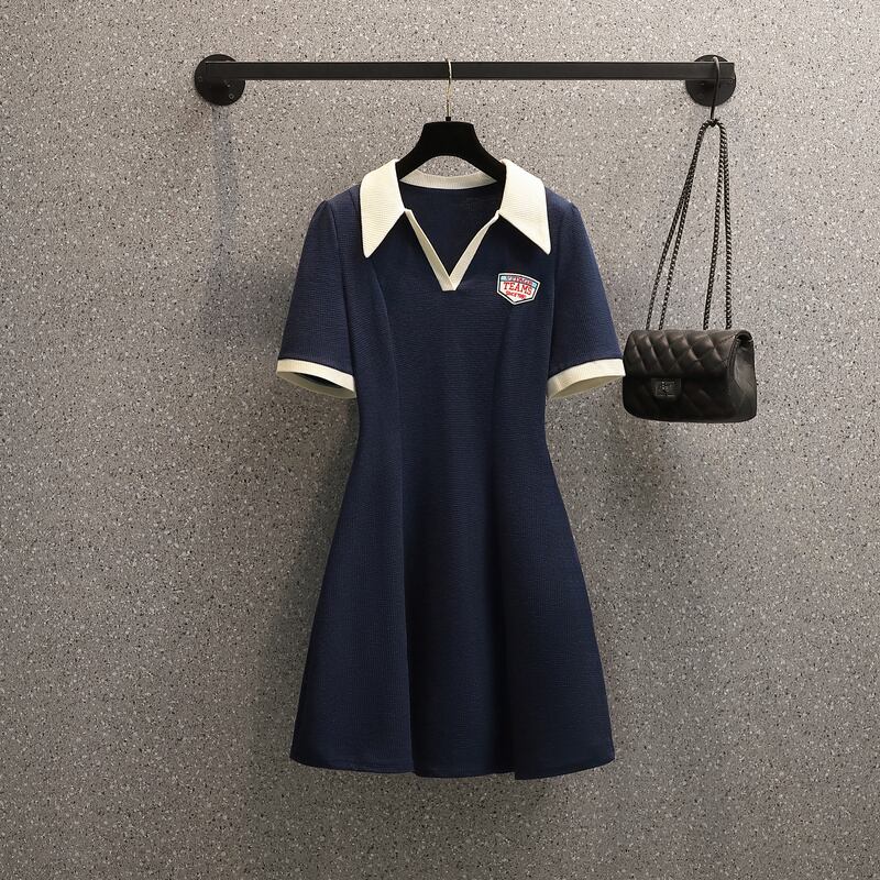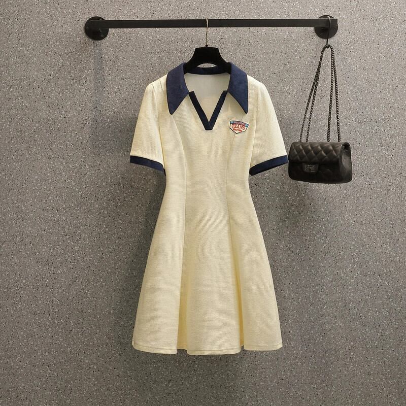 プラスサイズの婦人服 2023 夏の新しいスタイルの太った妹は細く見えますポロカラーウエストフレンチ半袖カジュアルドレス 大きめサイズ サマー 夏物 8884185461944995