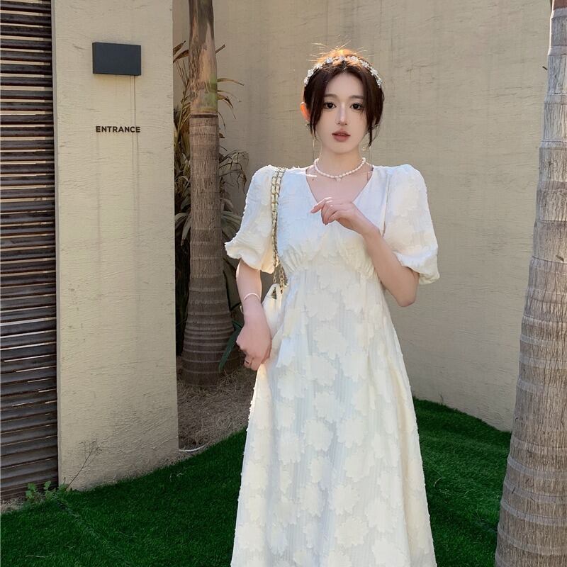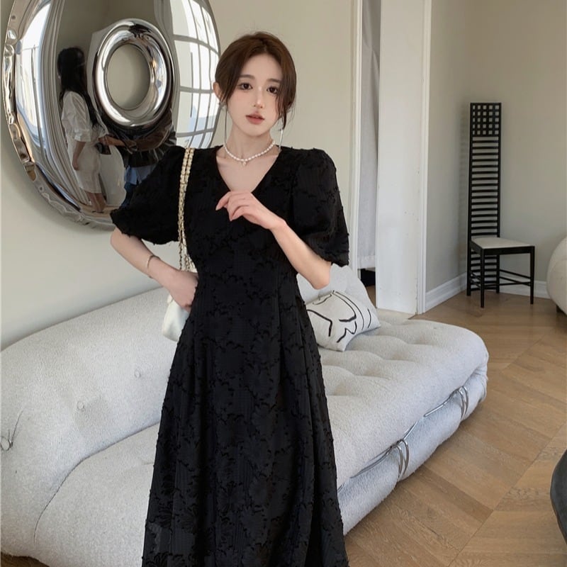 プラスサイズの婦人服 2023 脂肪姉妹夏新レトロ v ネックパフスリーブ甘いミッドレングスのドレスの女性 大きめサイズ 大人ガーリー スウィート キュート カジュアル サマー 夏物 Vネック 8884158184641693
