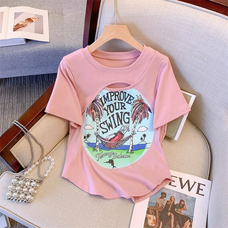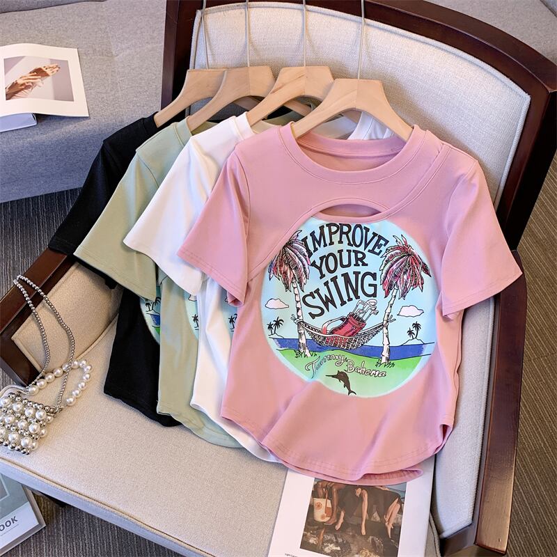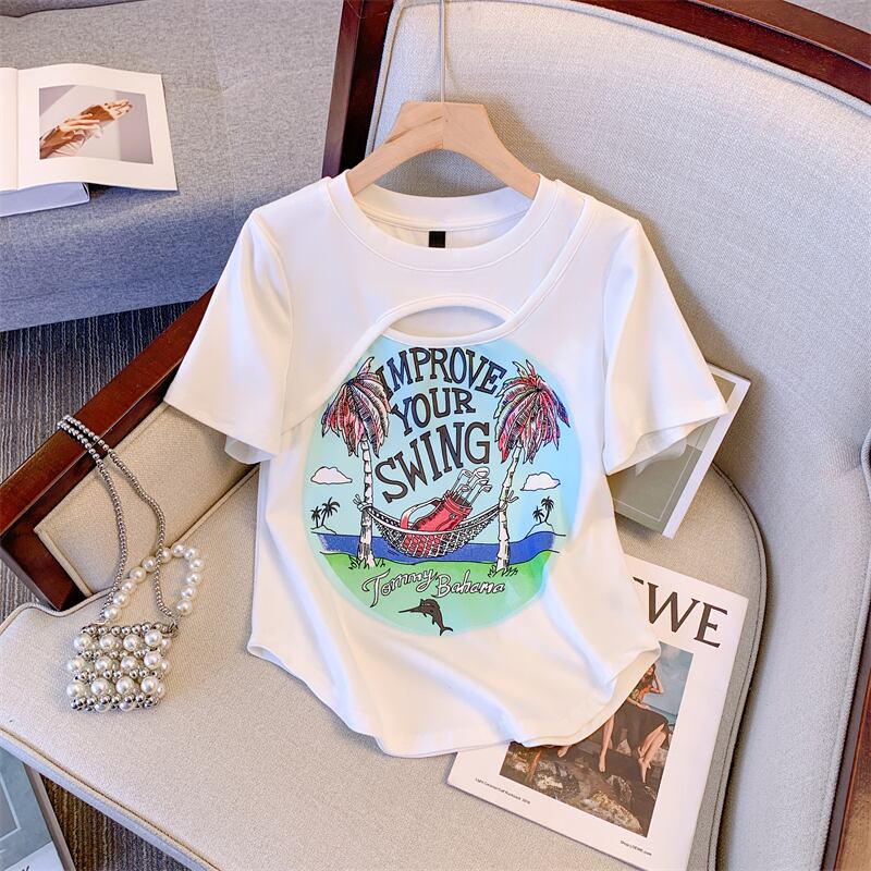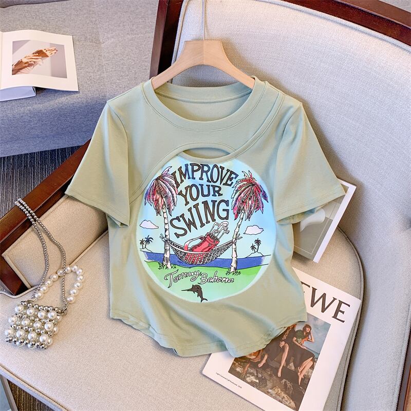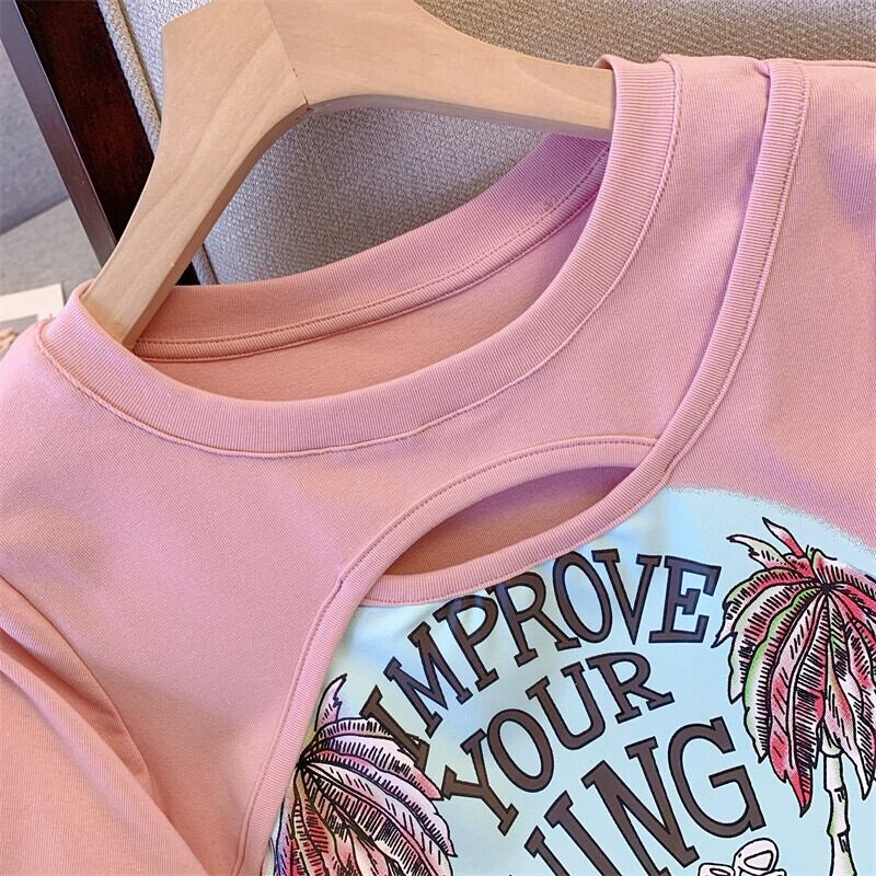 プラスサイズの女性の 2023 夏の新しいファットシスターデザインの空っぽの年齢を減らすプリントトップ痩身 T シャツ 大きめサイズ サマー 夏物 Tシャツ 888413719406343