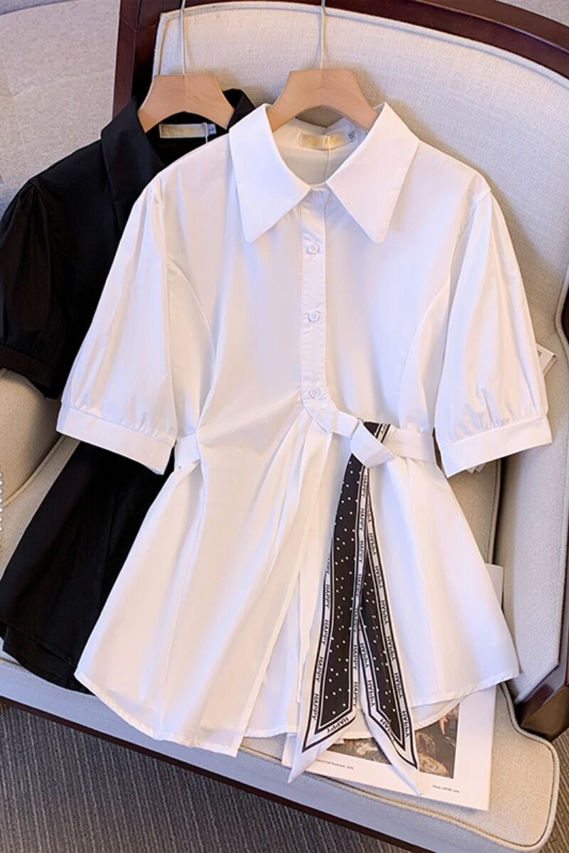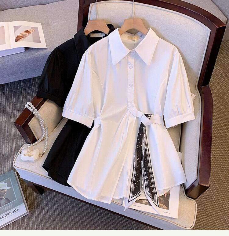 プラスサイズの婦人服 2023 流行の女性の夏の新しいファットシスターファッション痩身西洋スタイルオールマッチストラップウエスト半袖シャツ 大きめサイズ サマー 夏物 8884131432907623