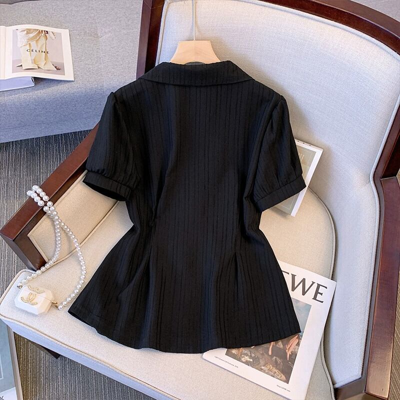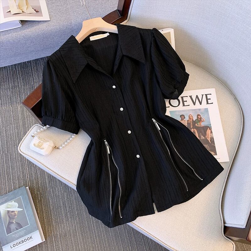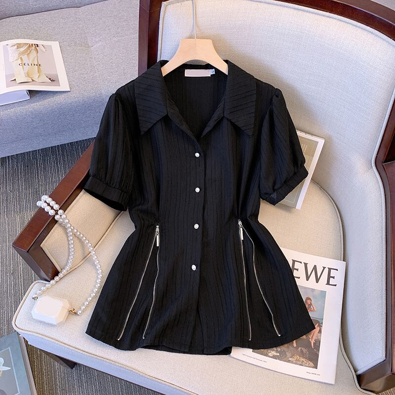 プラスサイズの婦人服 2023 脂肪姉妹夏新黒ポロ襟ウエスト痩身ジッパーシャツトップ女性 ブラック 大きめサイズ サマー 夏物 8884173340032310