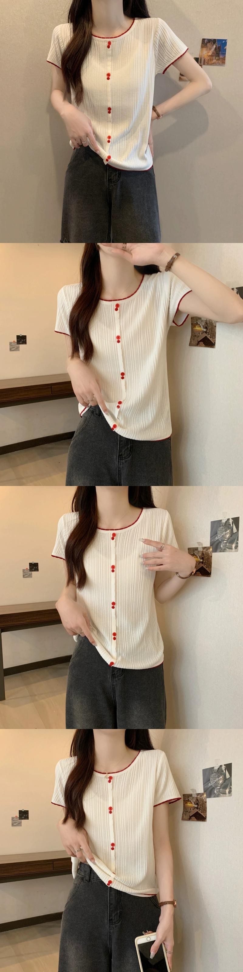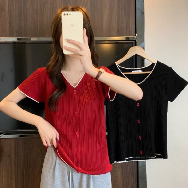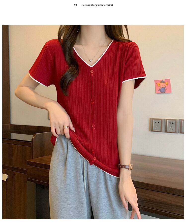 プラスサイズの婦人服 2023 夏の新しい太い姉妹バージョンのボタンは薄くてオールマッチのニット半袖 V ネックトップに見えます 大きめサイズ サマー 夏物 Vネック 8884140117670643