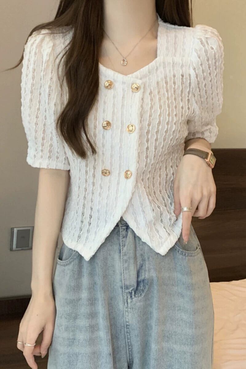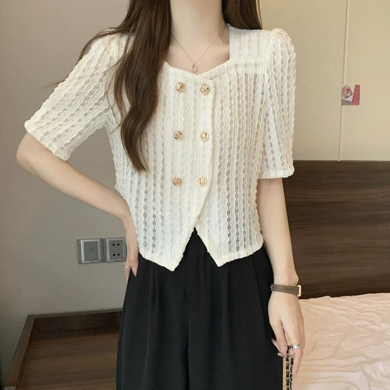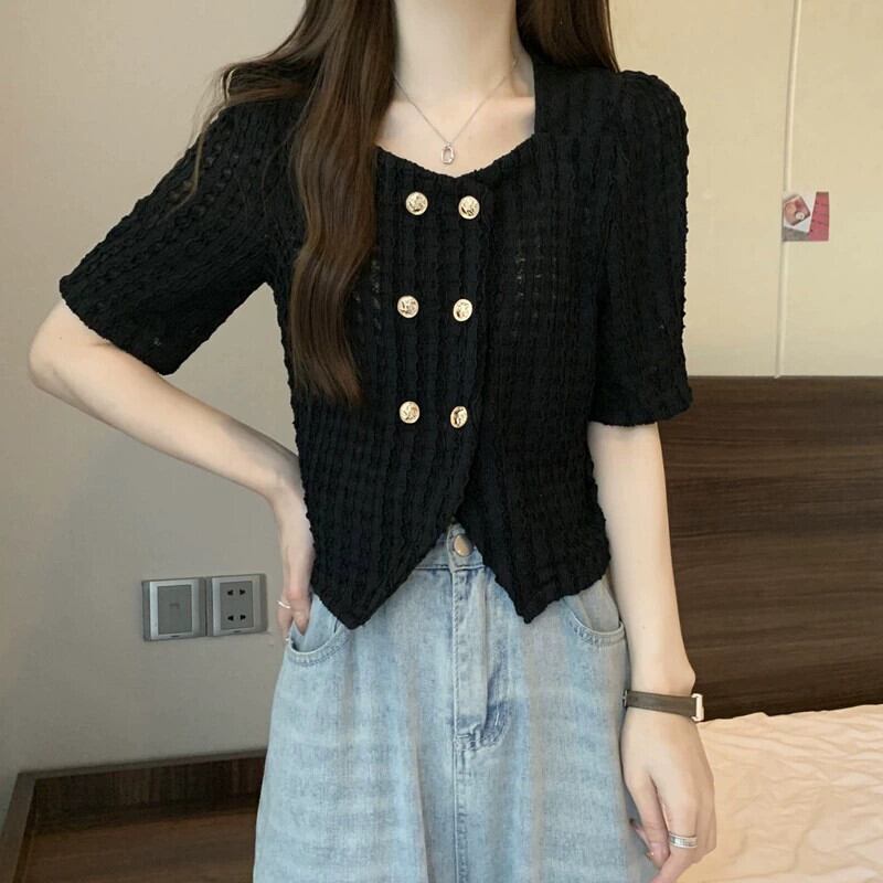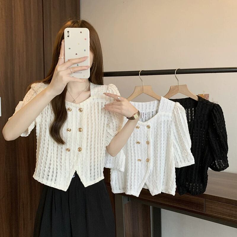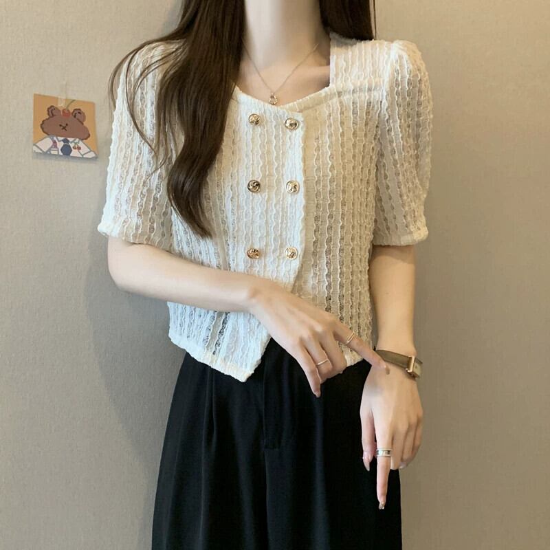 プラスサイズの婦人服 2023 流行の女性の夏の新しいファットシスターフレンチレトロスクエアカラーバブル半袖気質トップ Tシャツ 大きめサイズ サマー 夏物 スクウェア 8884180839333049