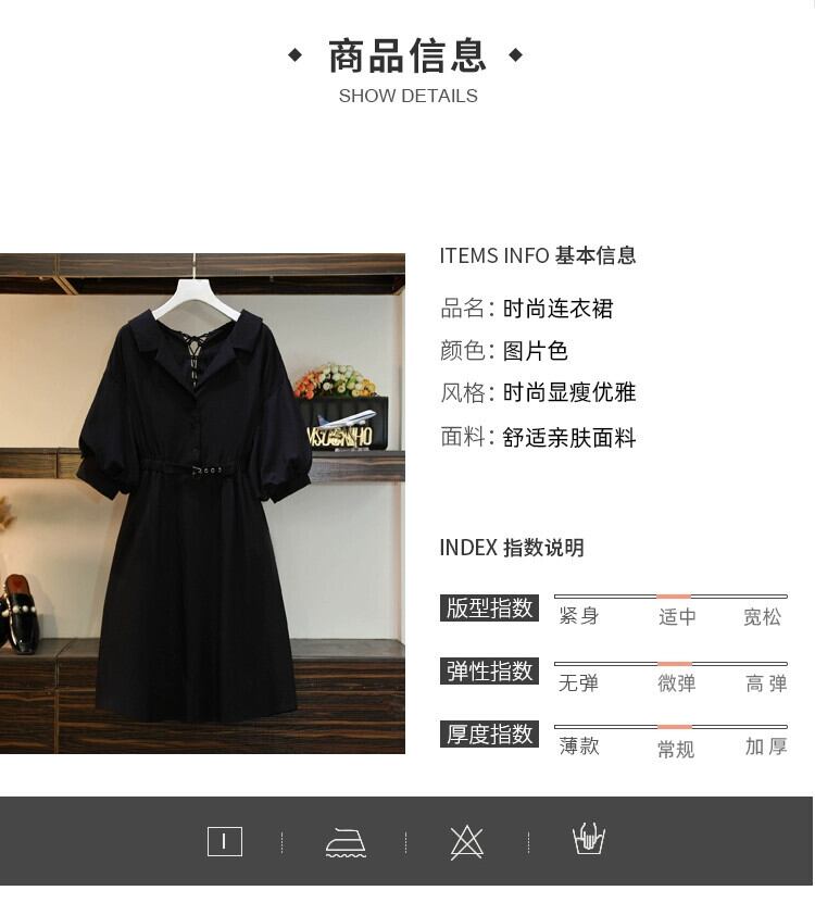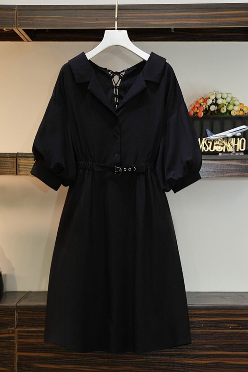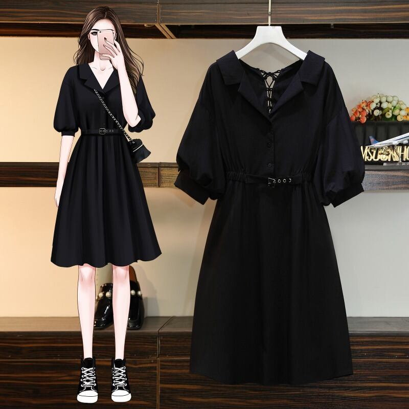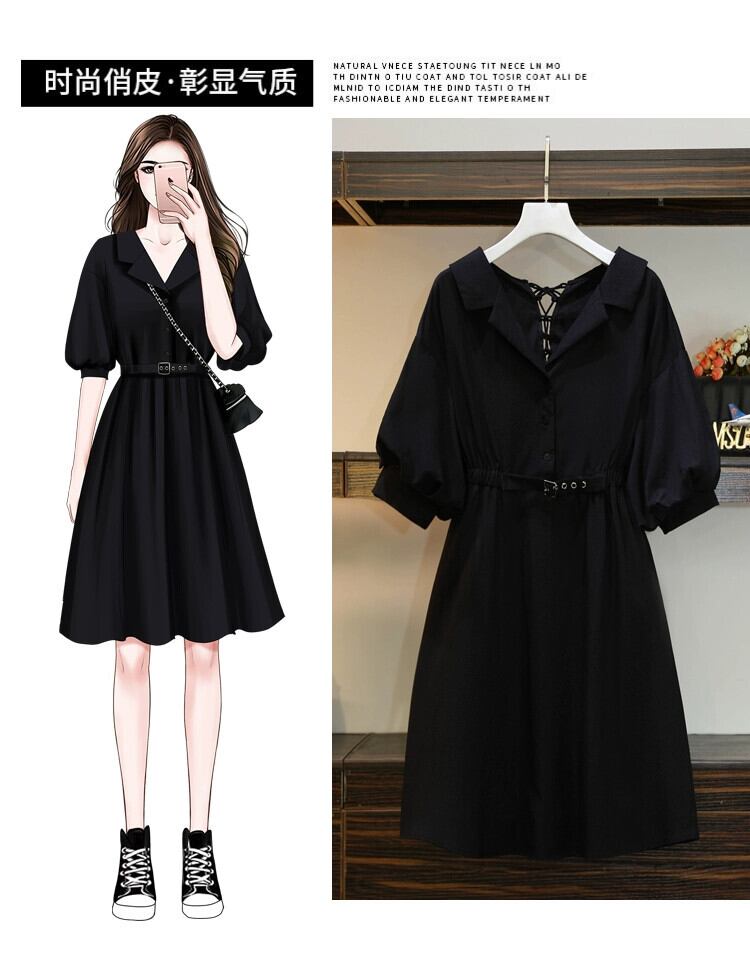 プラスサイズの婦人服 2023 流行の女性の夏の新しいファットシスターウエスト痩身デザインセンス巾着無地半袖ドレス 大きめサイズ サマー 夏物 ソリッドカラー 8884129881842292