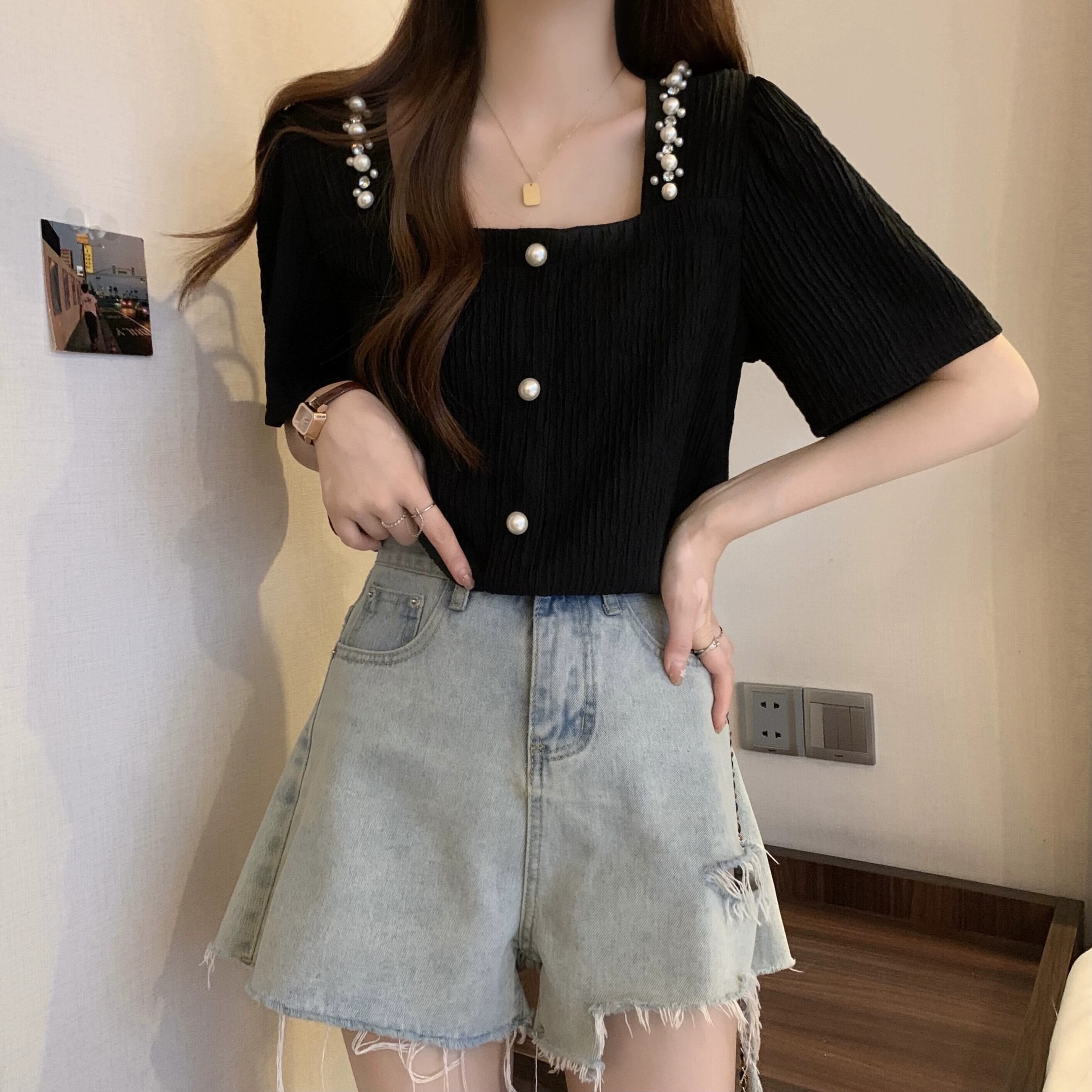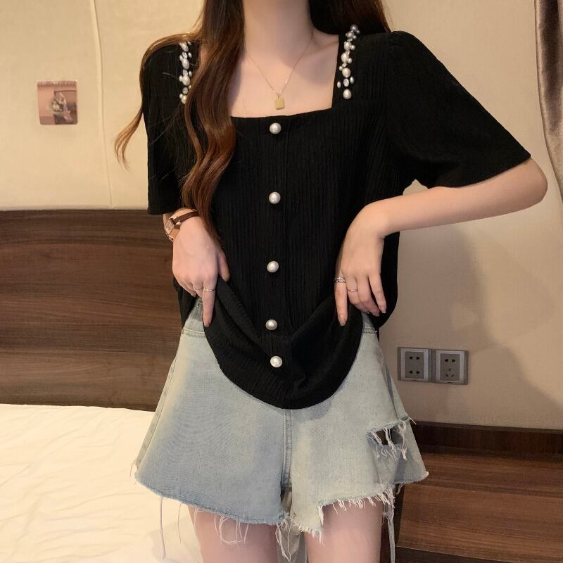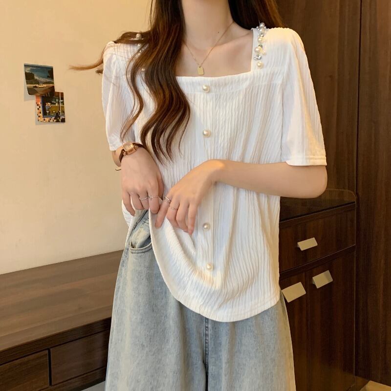 プラスサイズの婦人服 2023 トレンディな女性の夏の新しいスタイルファットシスターファッションオールマッチビーズスクエアカラー肉をカバーし、薄い半袖 T シャツを表示します。 大きめサイズ サマー 夏物 Tシャツ スクウェア 8884124097084496
