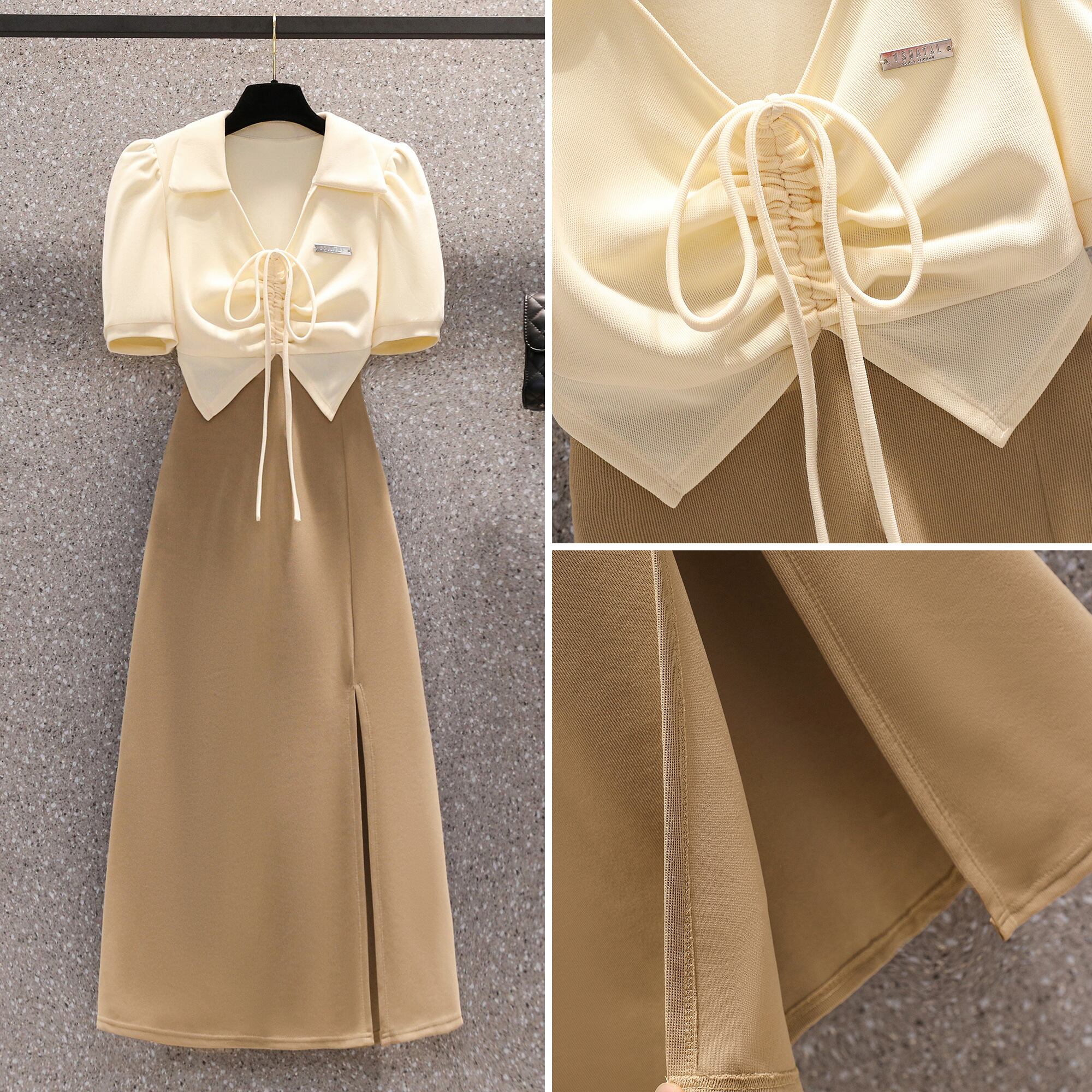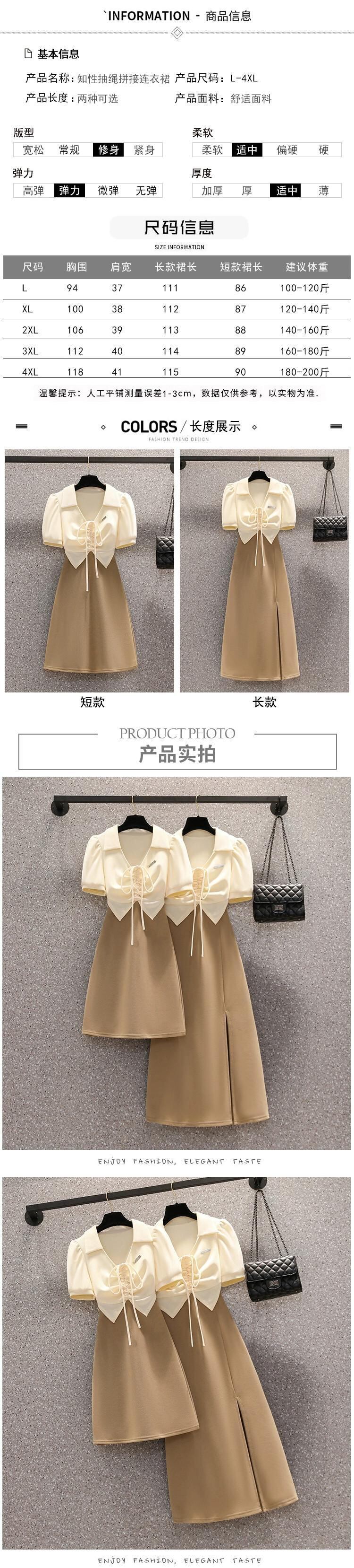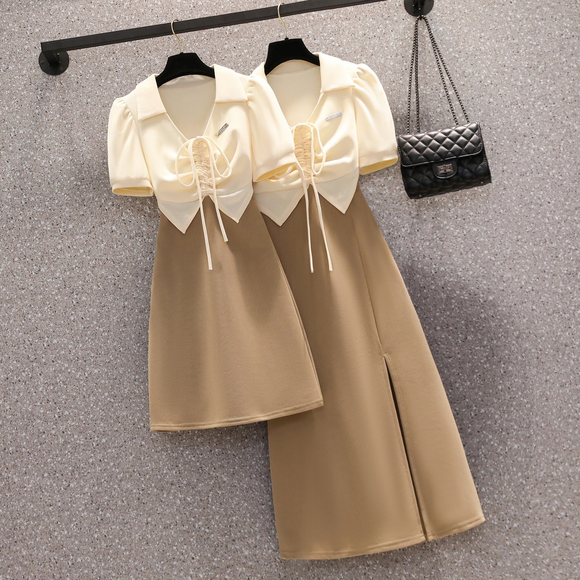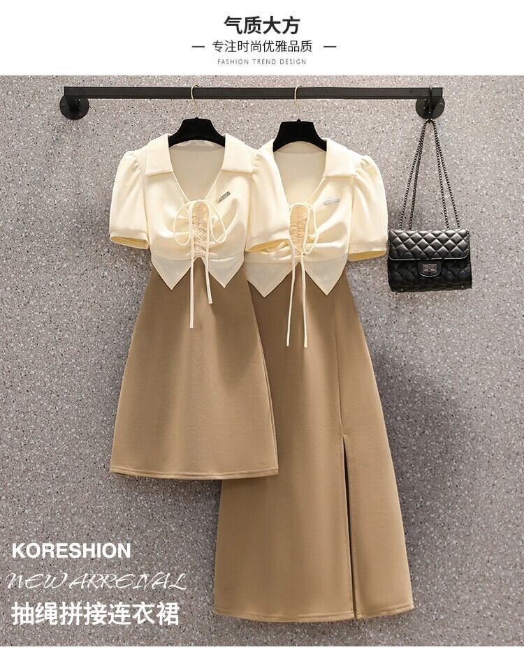 プラスサイズの婦人服 2023 新しい夏服ファットシスターズ新しい偽ツーピースコントラストカラーハイウエストアインスタイルスリム半袖ドレス ハイウェスト 大きめサイズ サマー 夏物 8884136931616156