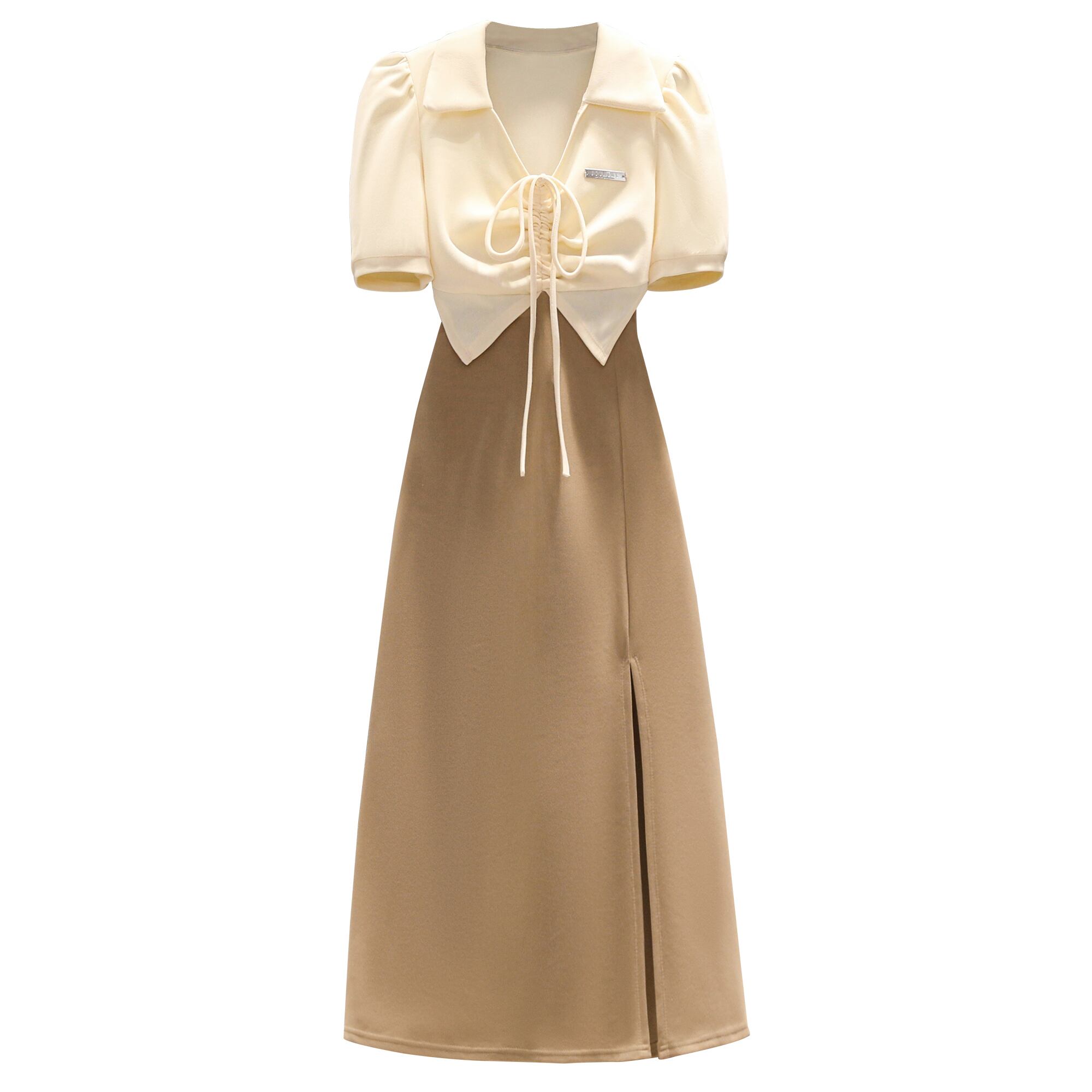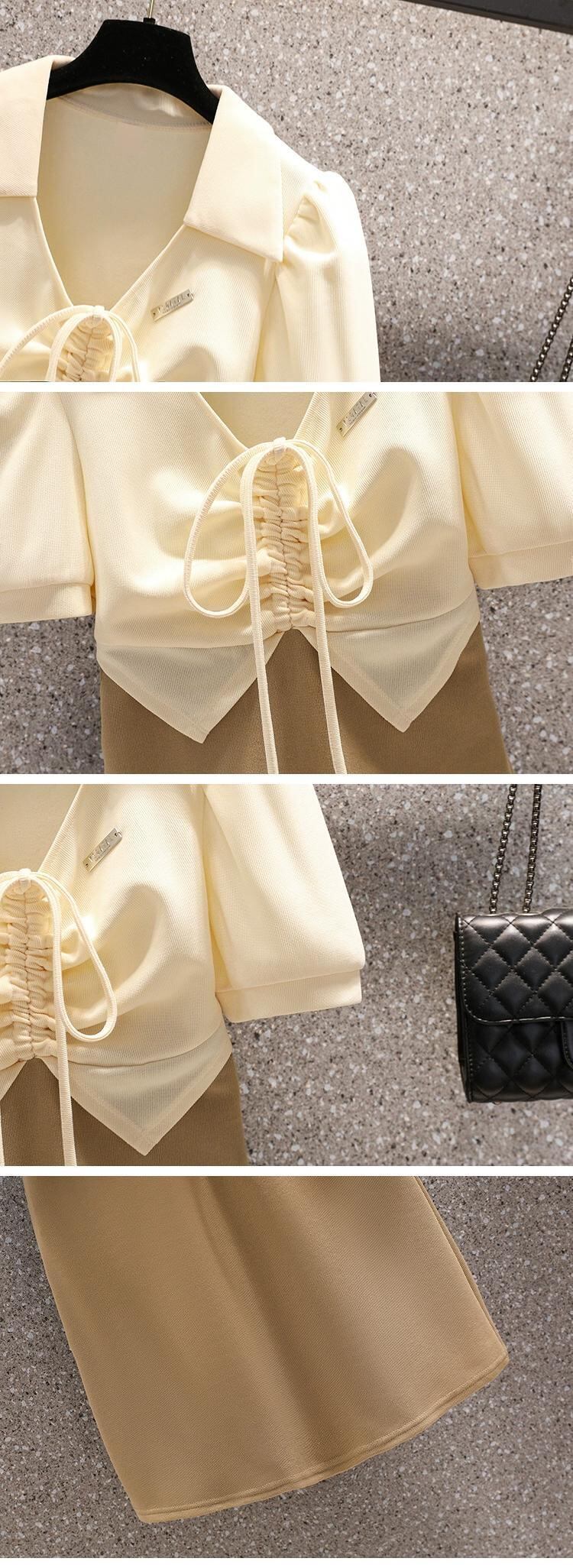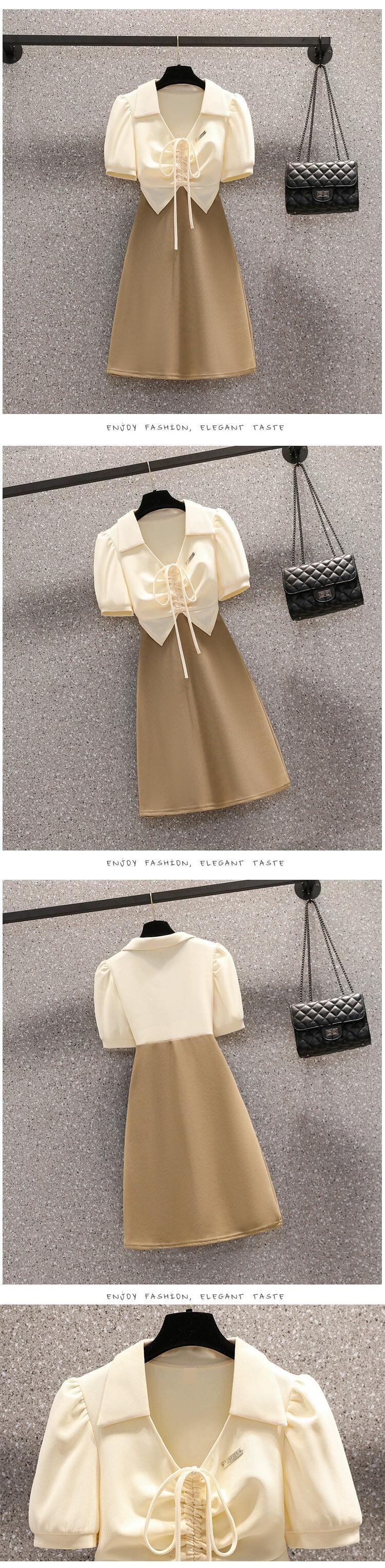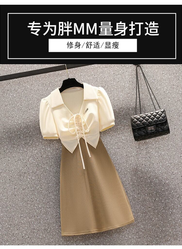 プラスサイズの婦人服 2023 新しい夏服ファットシスターズ新しい偽ツーピースコントラストカラーハイウエストアインスタイルスリム半袖ドレス ハイウェスト 大きめサイズ サマー 夏物 8884136931616156