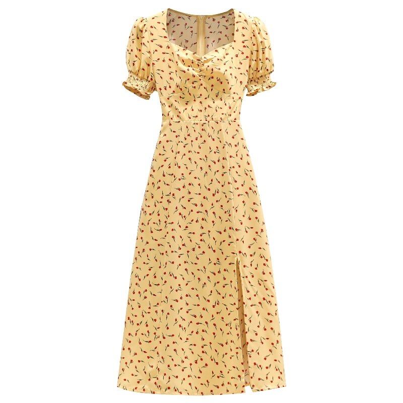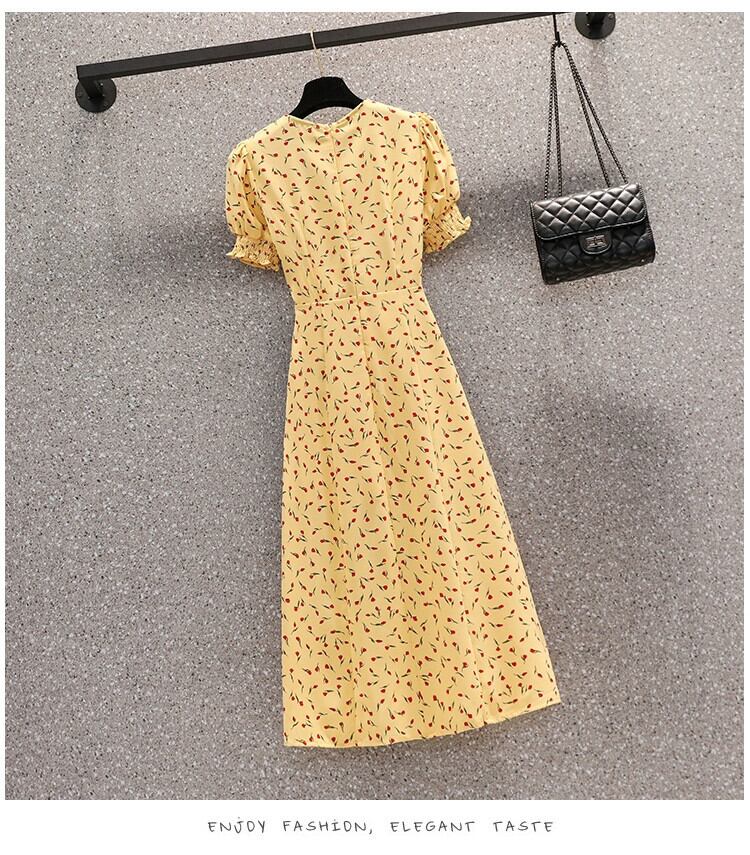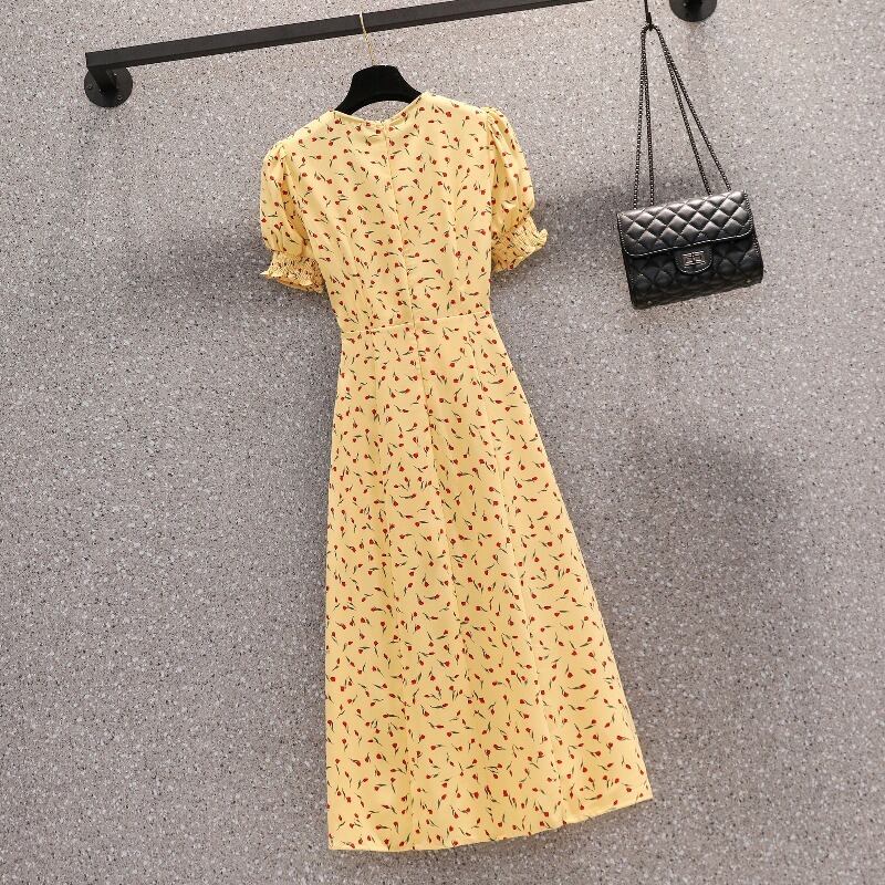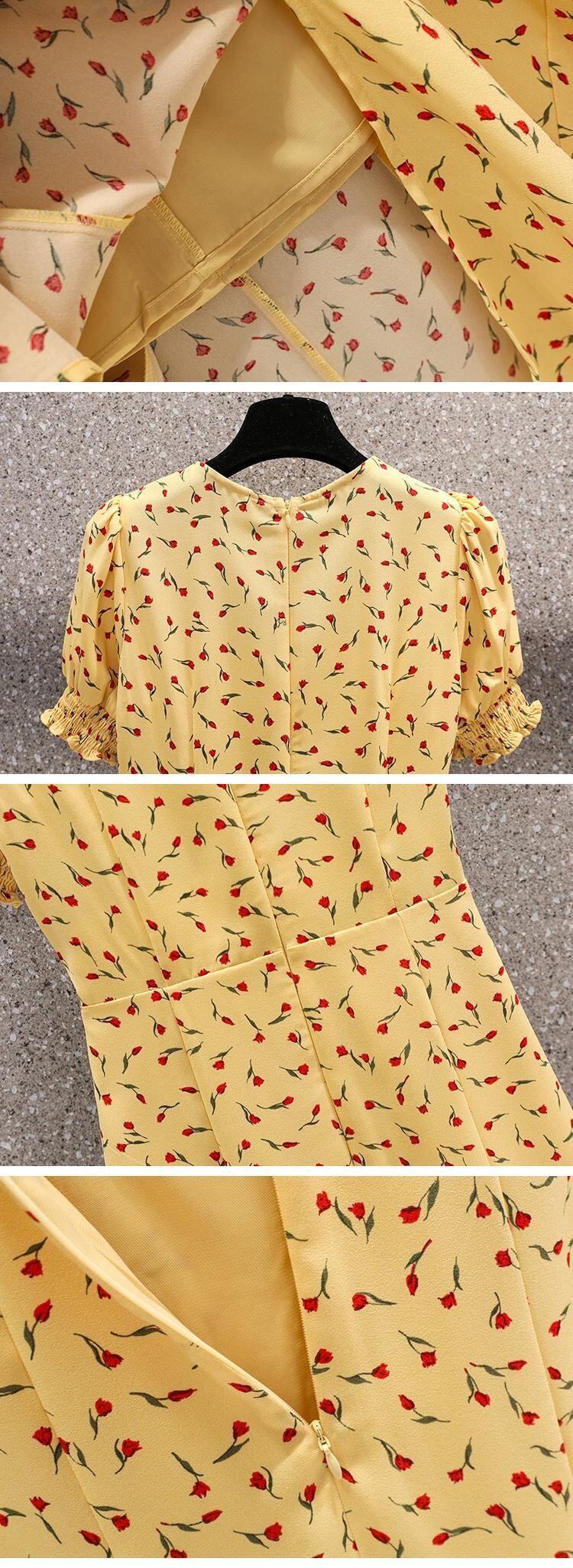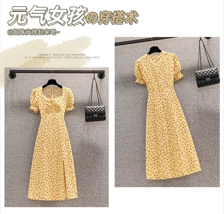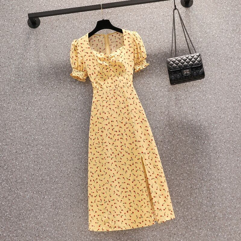 プラスサイズの婦人服 2023 夏の新しいファットシスタースクエアカラー気質花柄パフスリーブウエストフレンチドレス 大きめサイズ サマー 夏物 スクウェア 8884159548278311
