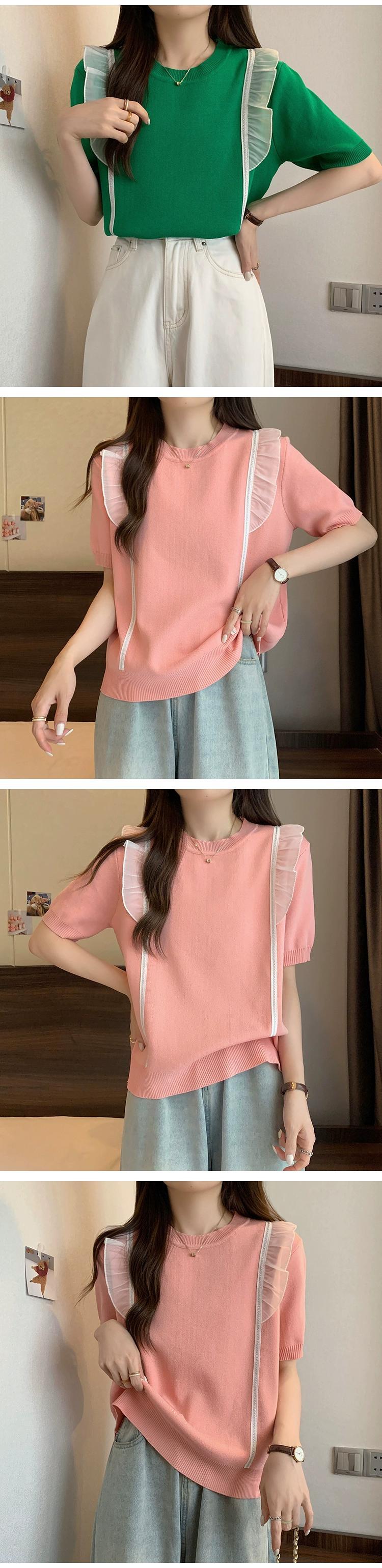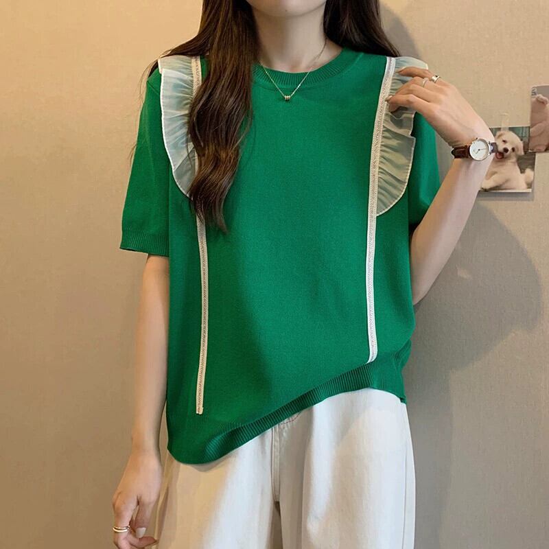 女性のトレンディな女性のファットシスターアインスタイルのレースニット半袖スリムアイスシルクTシャツでお腹をカバーし、肉のトップをカバーするサマードレス 夏物 8884132519934196