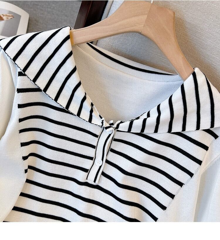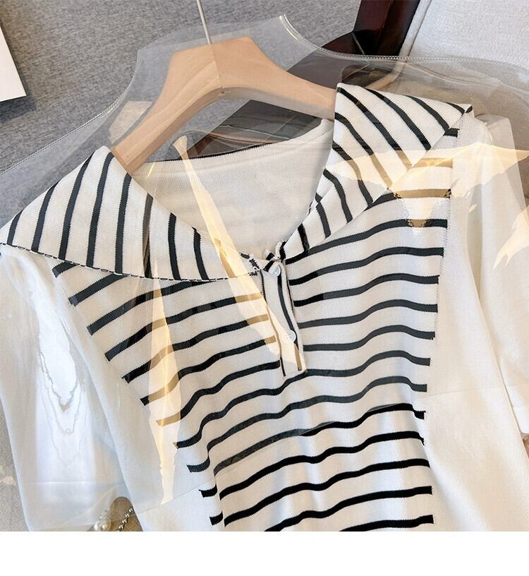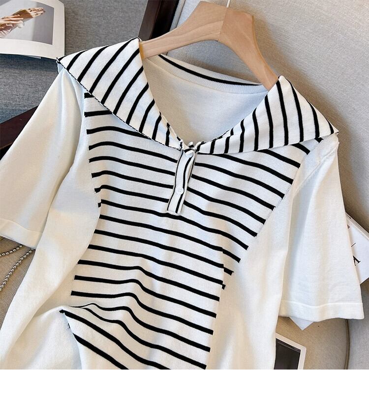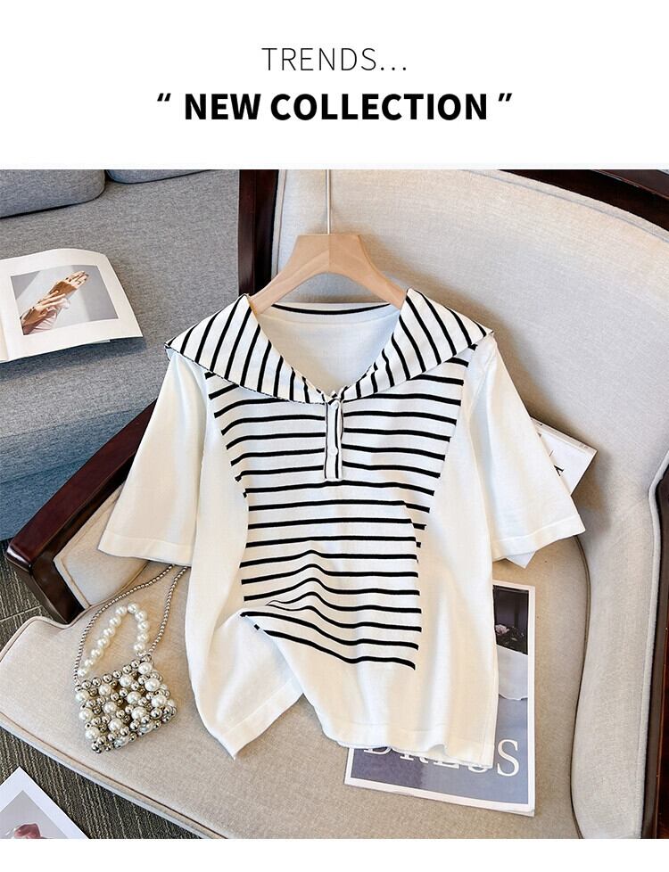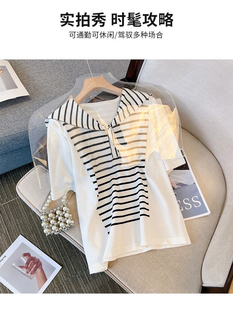 プラスサイズの婦人服 2023 夏の新脂肪姉妹年齢削減ネイビーカラーストライプステッチ半袖ファッショントップ女性 大きめサイズ サマー 夏物 8884145797326790
