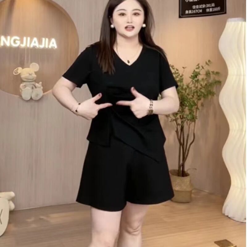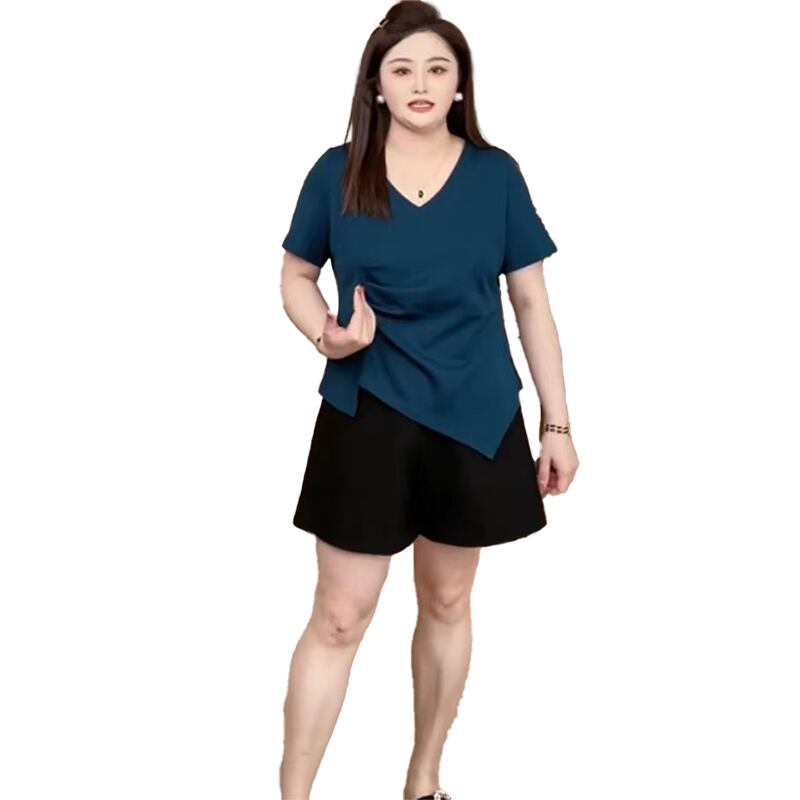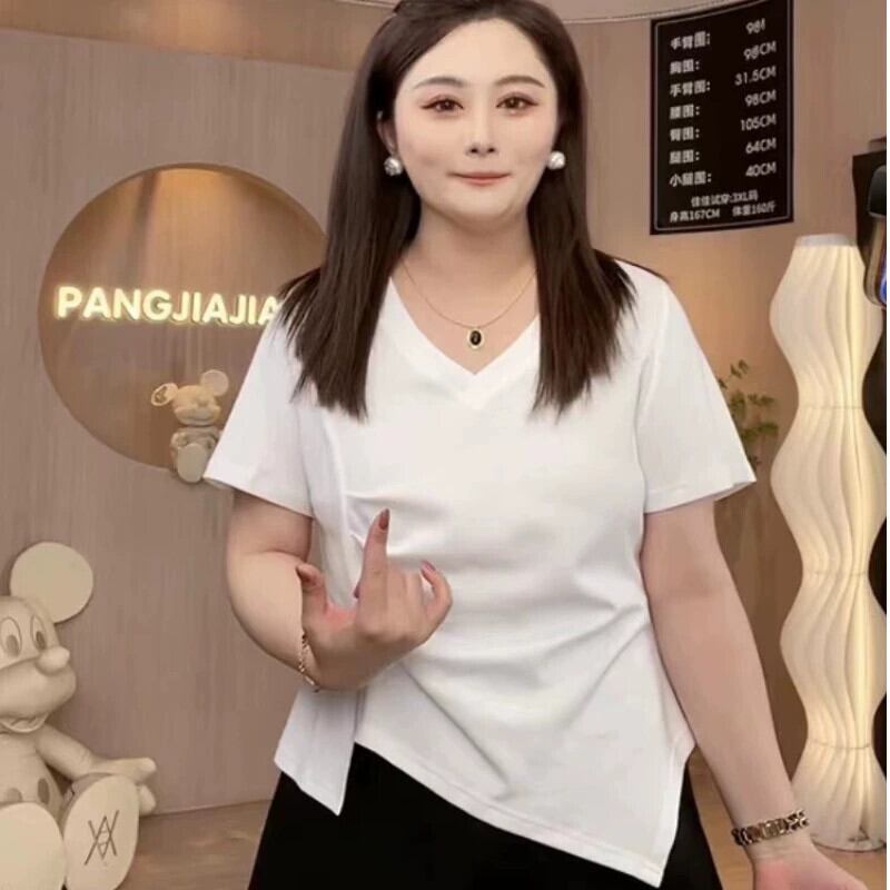 プラスサイズの婦人服 2023 ファットシスター夏の新しい半袖 T シャツスリミングオールマッチ不規則な無地 V ネックトップ 大きめサイズ サマー 夏物 Vネック Tシャツ ソリッドカラー 8884150285680166