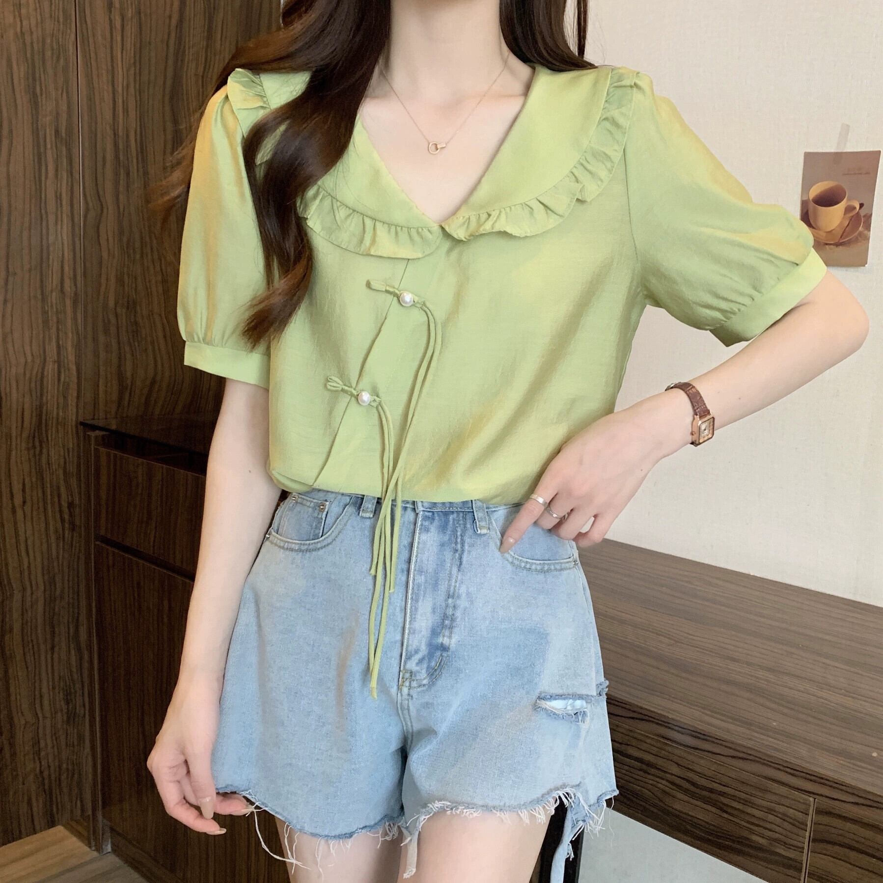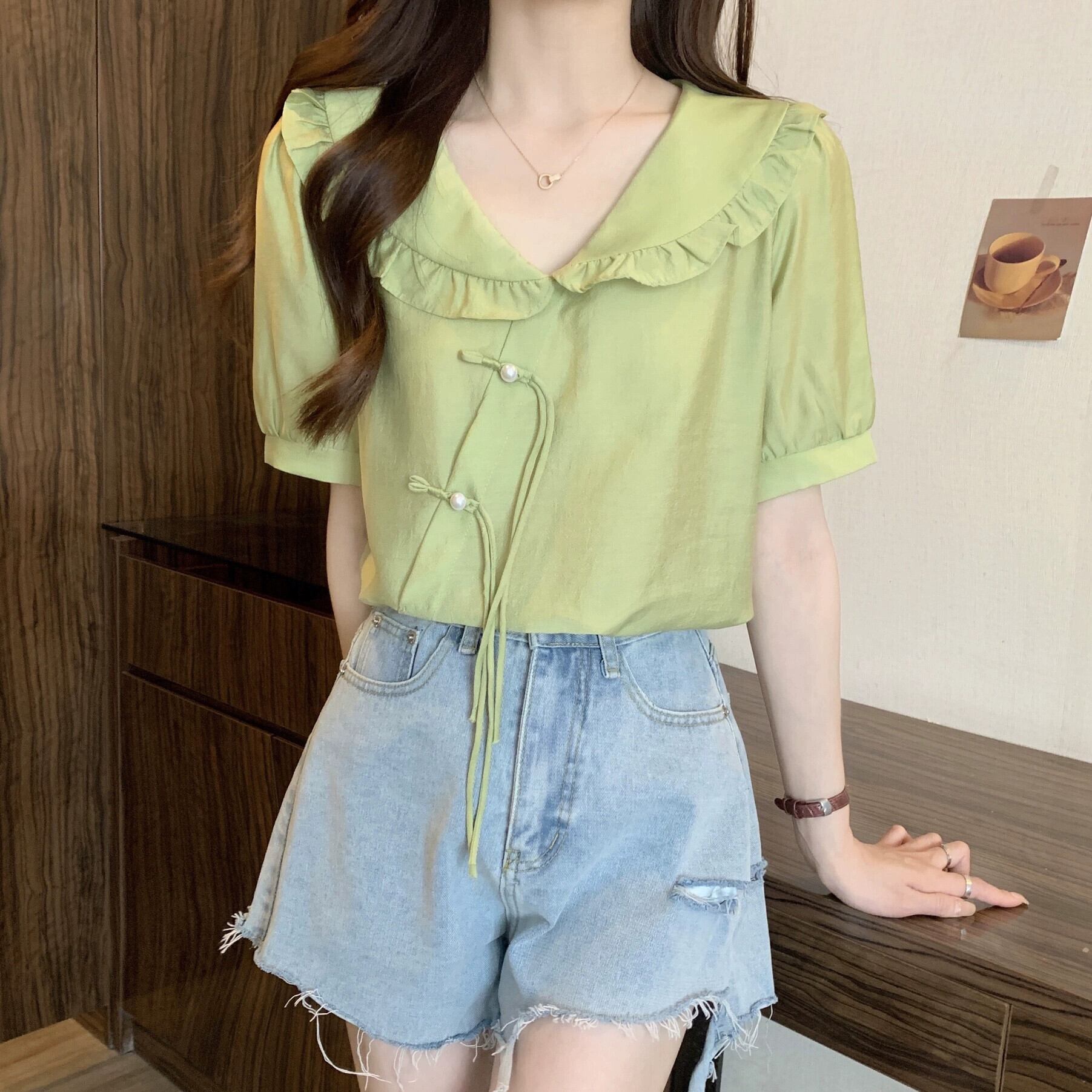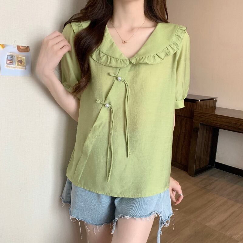 プラスサイズの婦人服 2023 夏服ファットシスタースタイルタイアップフリルシフォンシャツデザインセンスニッチ年齢軽減トップス 大きめサイズ サマー 夏物 8884145548149634
