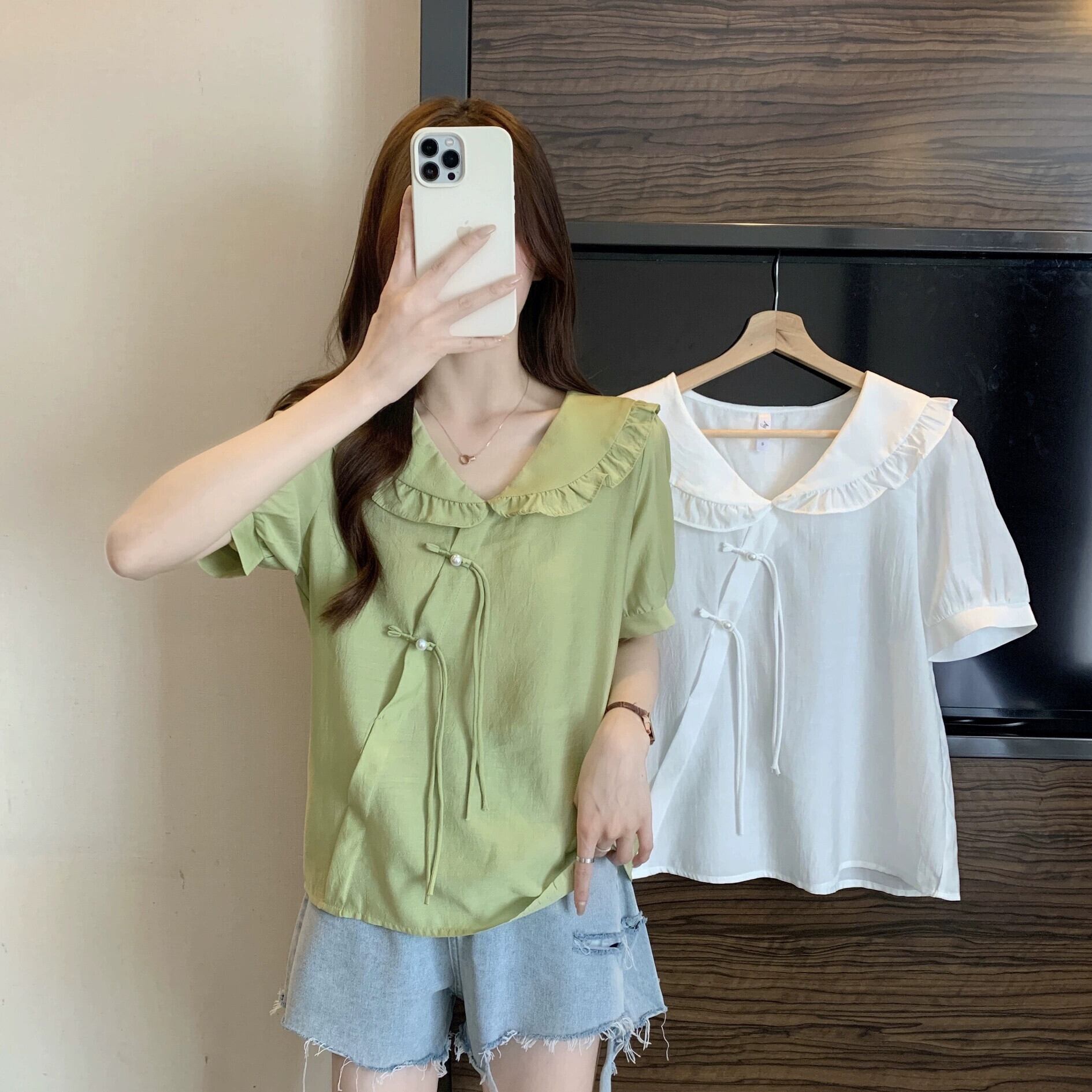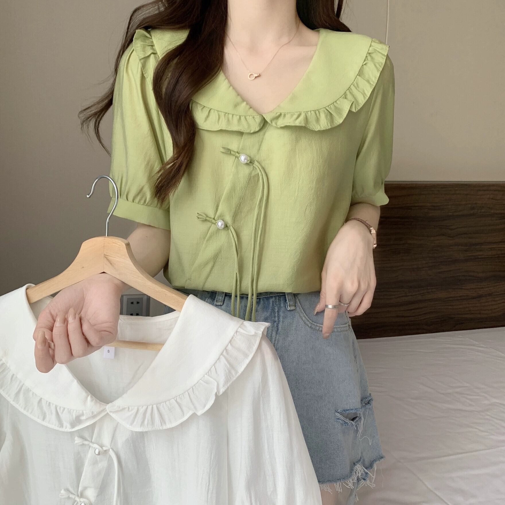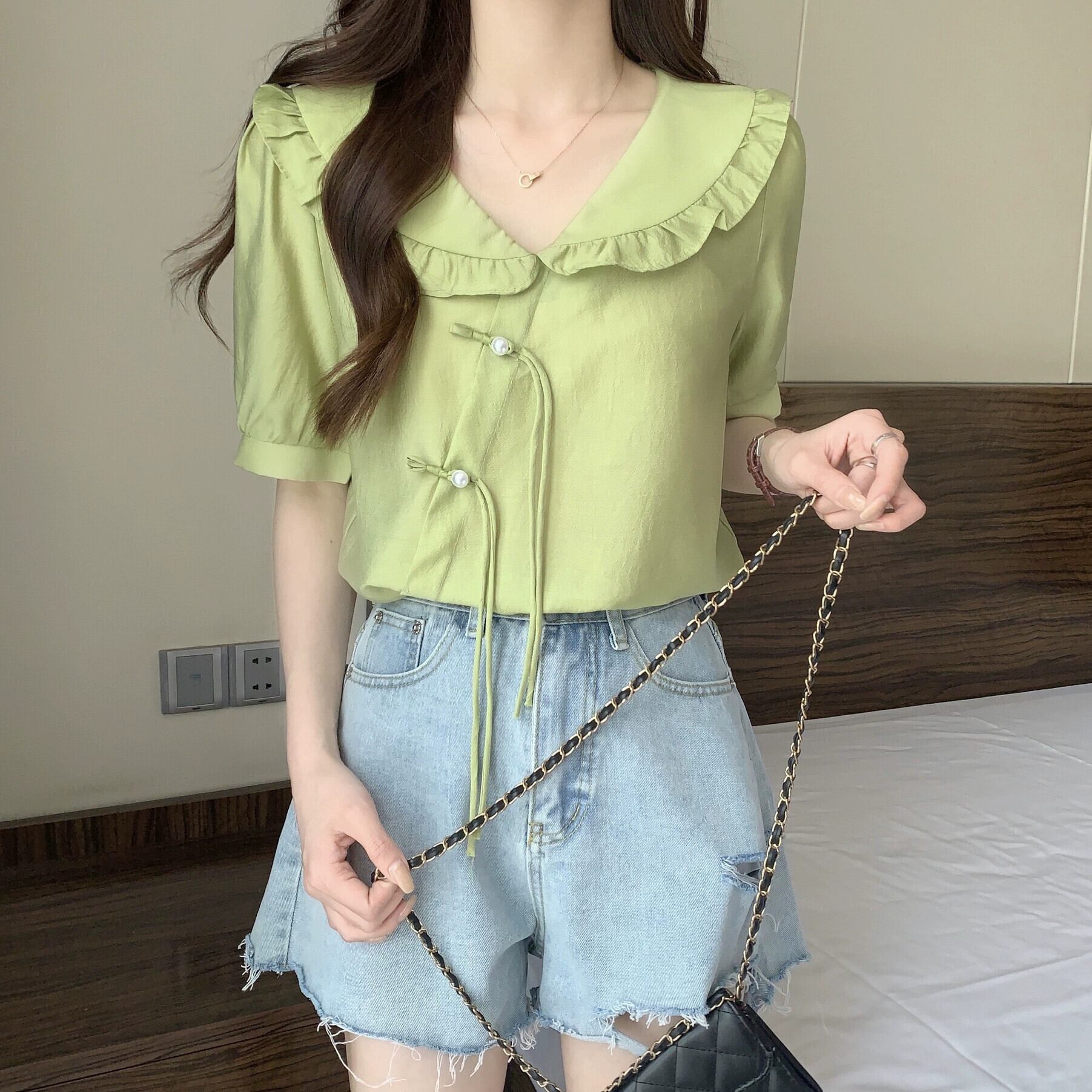 プラスサイズの婦人服 2023 夏服ファットシスタースタイルタイアップフリルシフォンシャツデザインセンスニッチ年齢軽減トップス 大きめサイズ サマー 夏物 8884145548149634