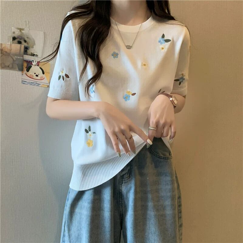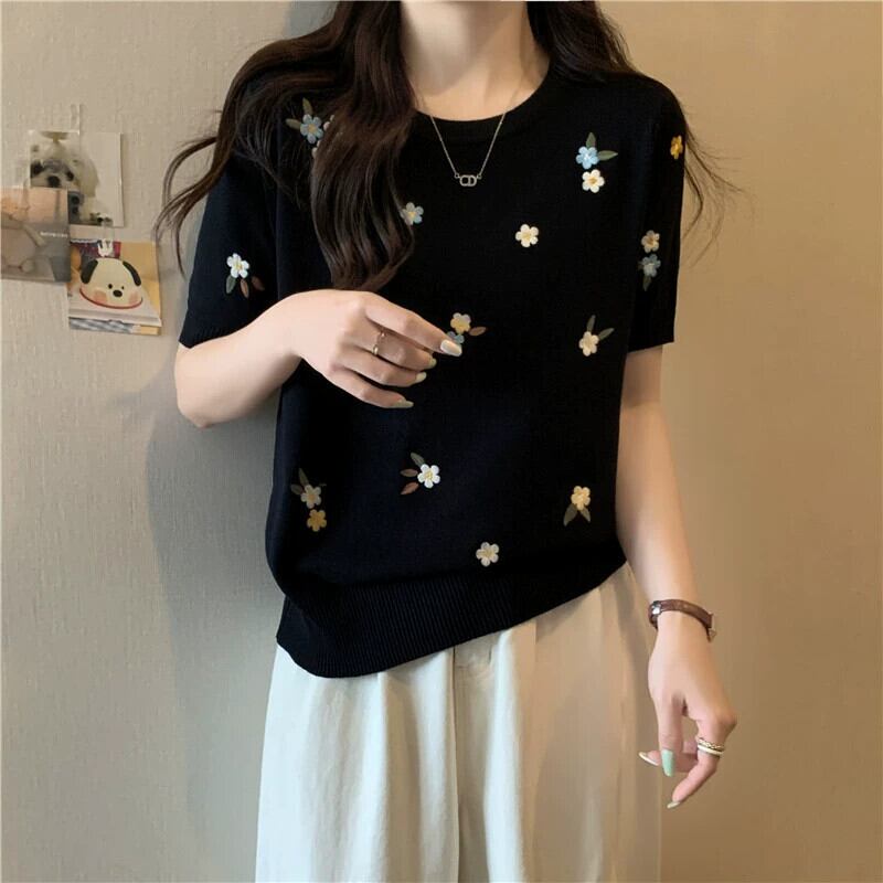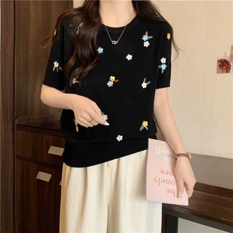プラスサイズの婦人服 2023 流行の夏服新しいファットシスターアイスシルクニット半袖 Tシャツ優しい風ショートトップ 大きめサイズ サマー 夏物 8884133501772983