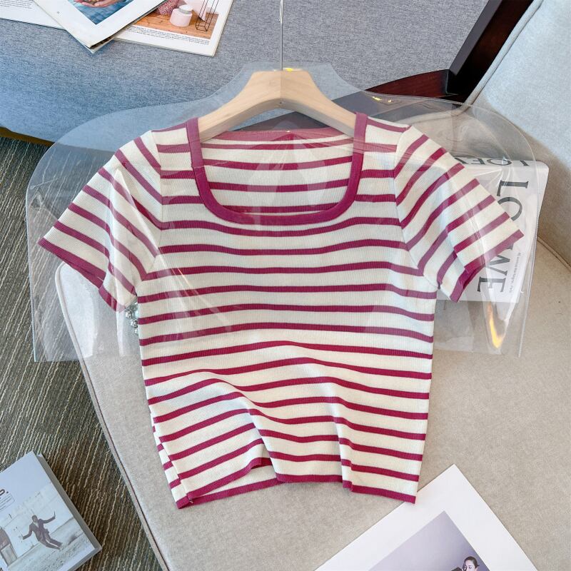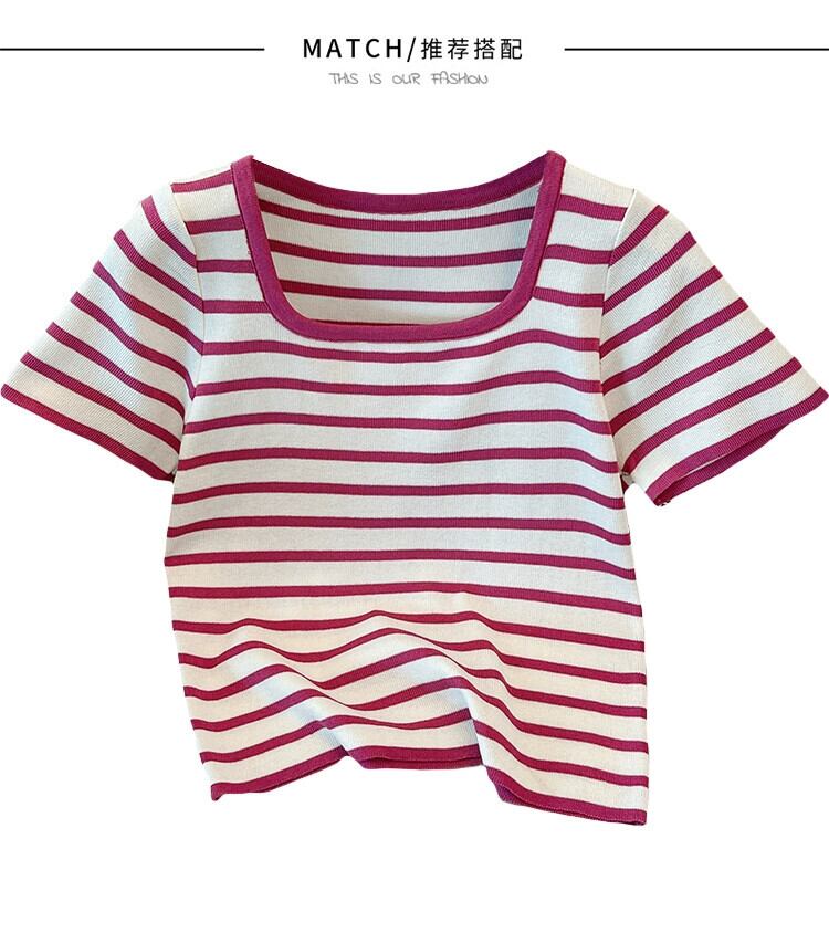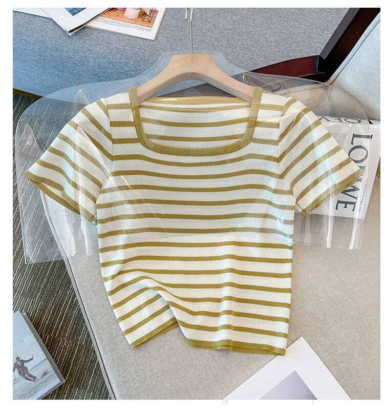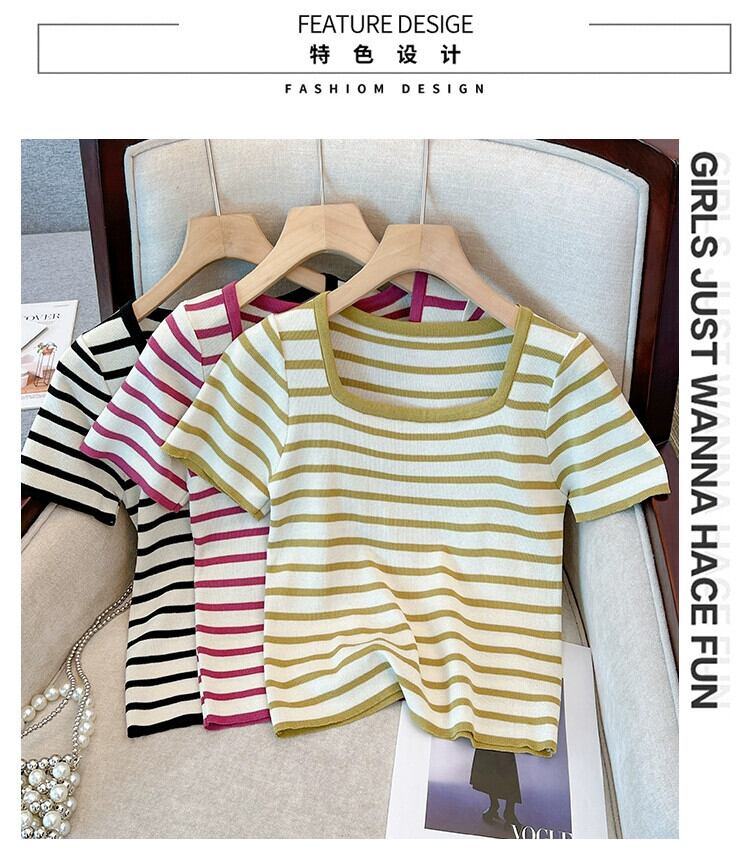 プラスサイズの婦人服 2023 ファットシスター夏新オールマッチルーズショートスクエアカラー半袖ストライプニット Tシャツ 大きめサイズ サマー 夏物 スクウェア 8884164278620915