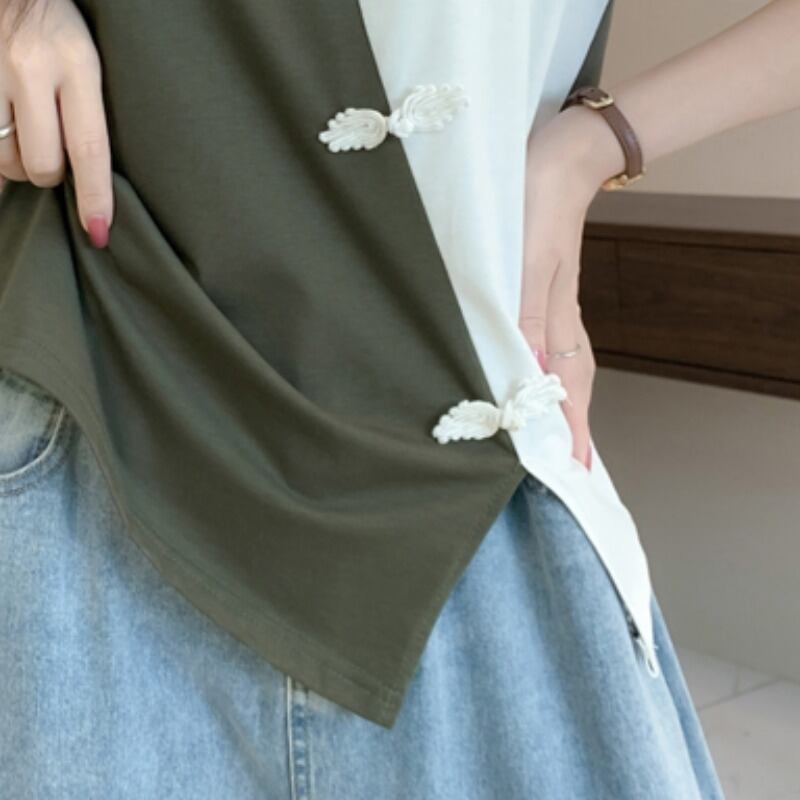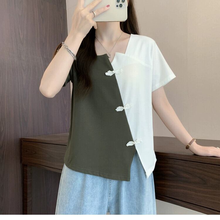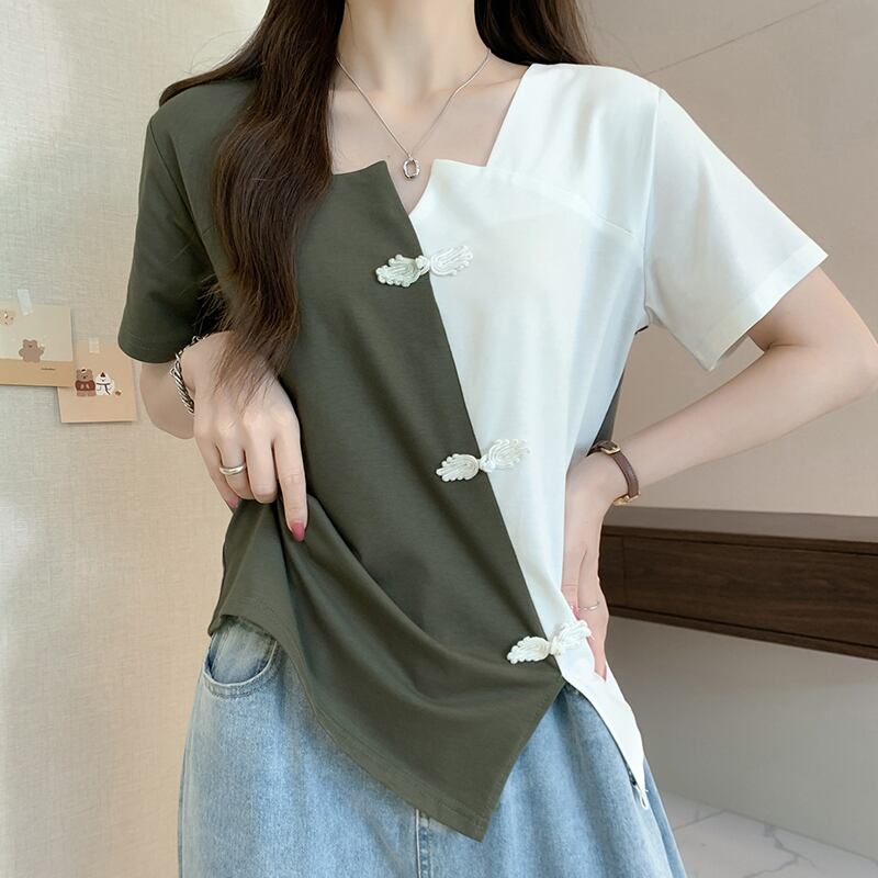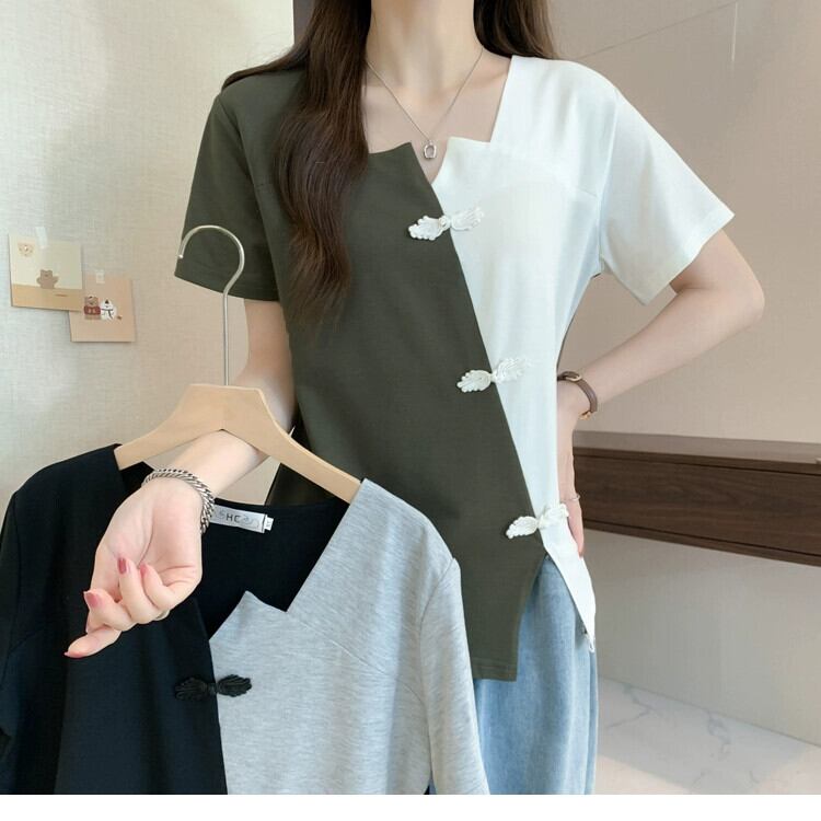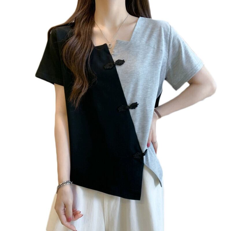 プラスサイズの婦人服 2023 夏服 スタイリッシュなデザインと、肉をカバーするスリットと半袖を備えた多用途の斜めボタントップを備えた太った T シャツ ショート ハーフスリーブ 大きめサイズ サマー 夏物 Tシャツ 8884145410192863