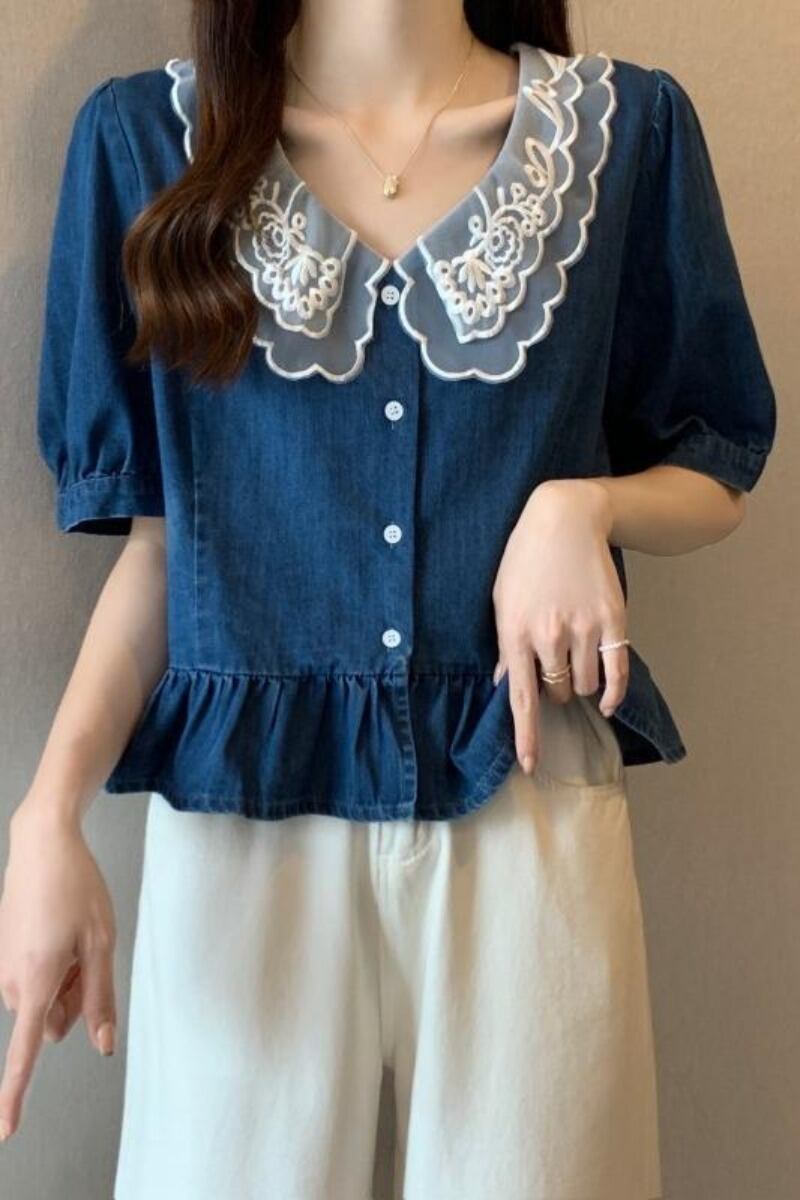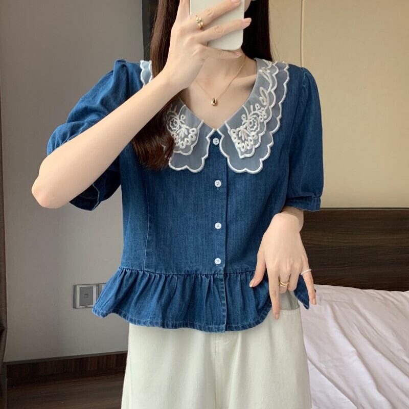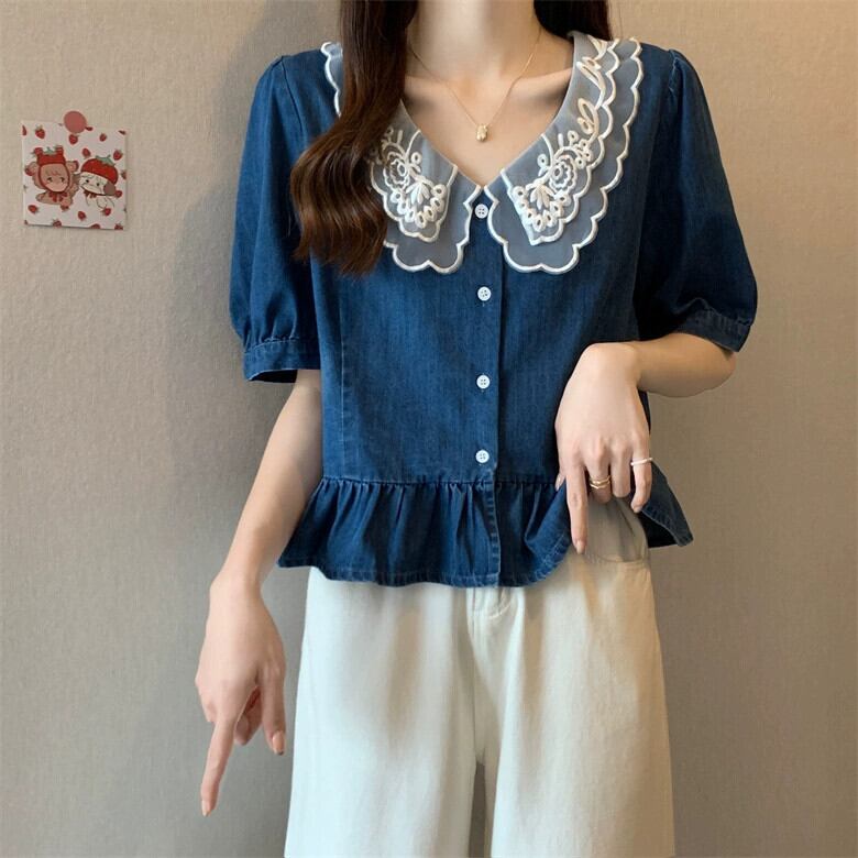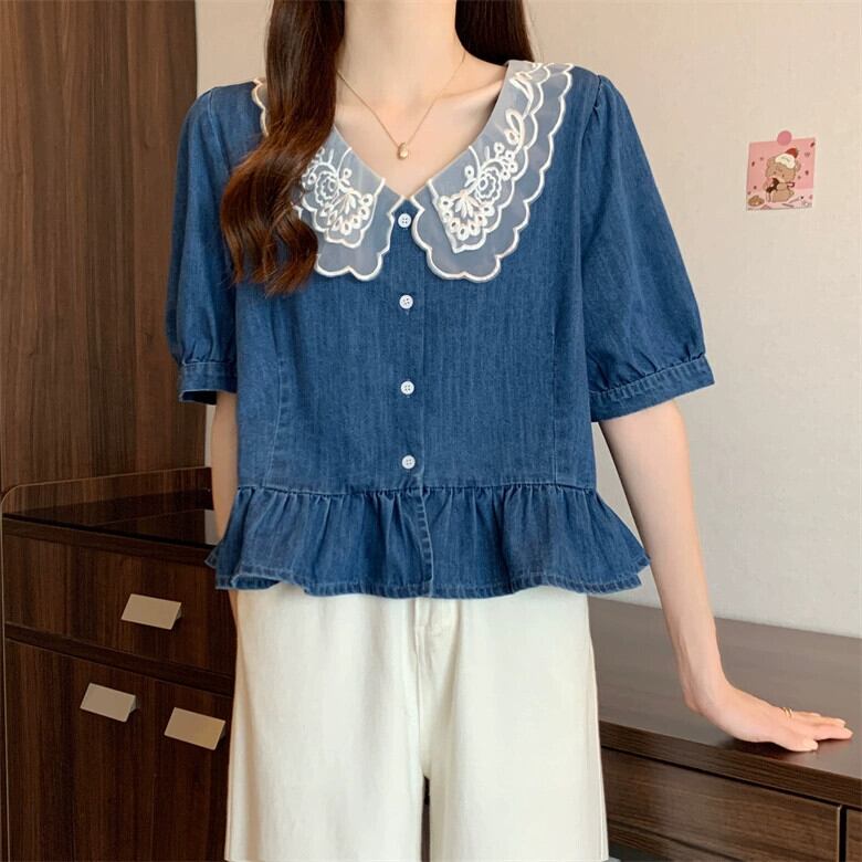 プラスサイズの婦人服 2023 夏服ファットシスターカジュアルバージョンルーズ薄いトップレース人形襟デニムシャツ 大きめサイズ サマー 夏物 8884152686562561