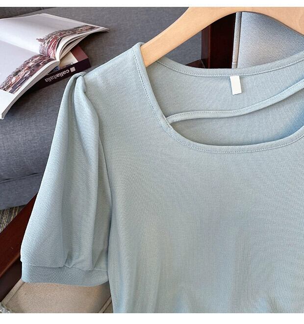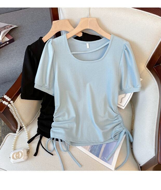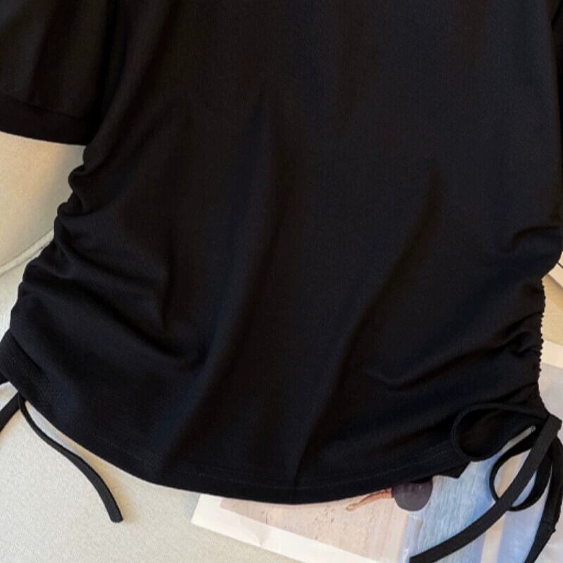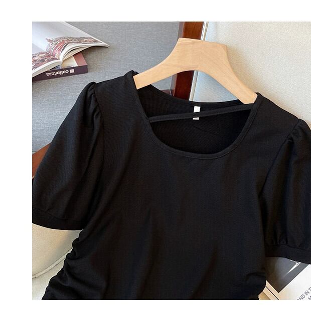 プラスサイズの婦人服 2023 夏服脂肪ファッションオールマッチ薄い巾着 Tシャツカバー腹無地半袖トップ 大きめサイズ サマー 夏物 ソリッドカラー 888417315784868