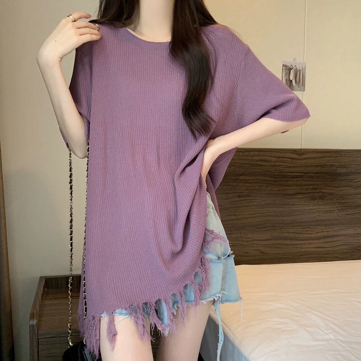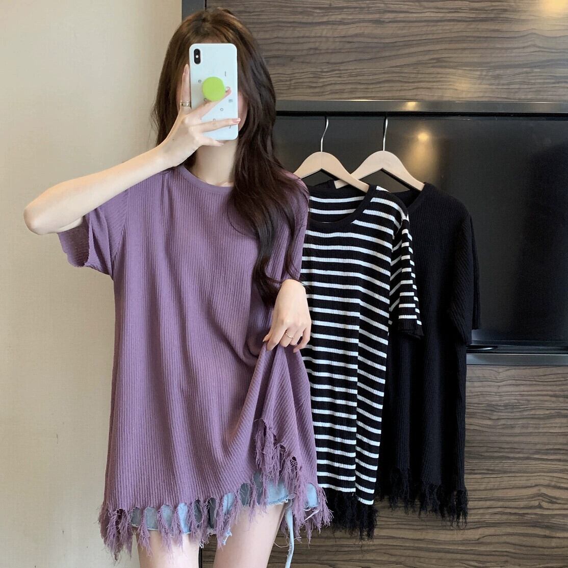プラスサイズの婦人服 2023 夏服ファットシスターミディアムレングスラウンドネックルーズ Tシャツスリミング無地オールマッチニットトップ 大きめサイズ サマー 夏物 Oネック ソリッドカラー 8884177462830864