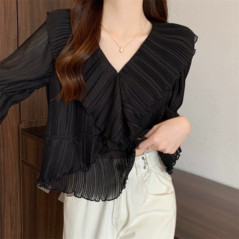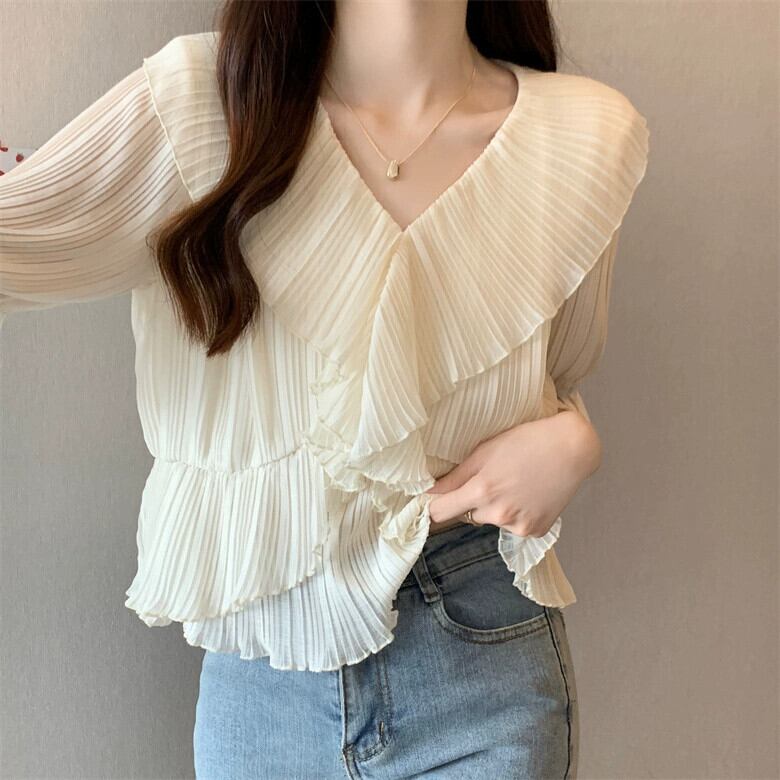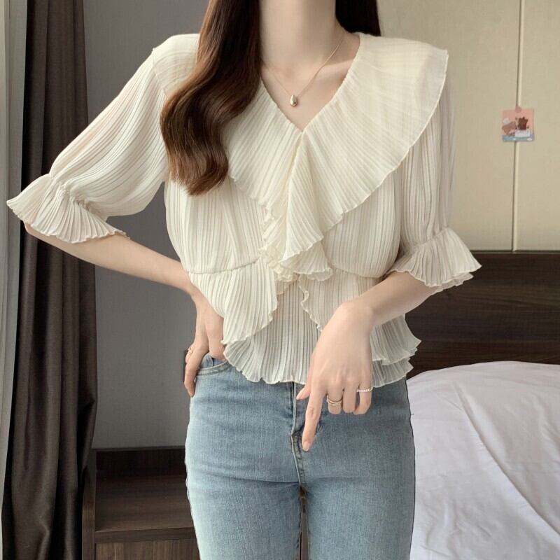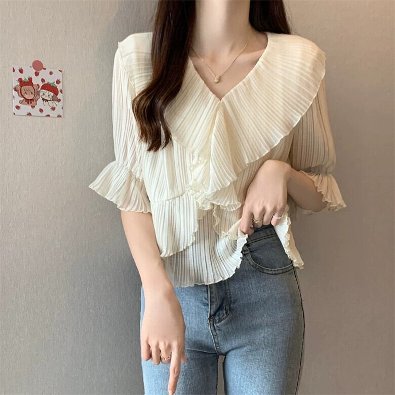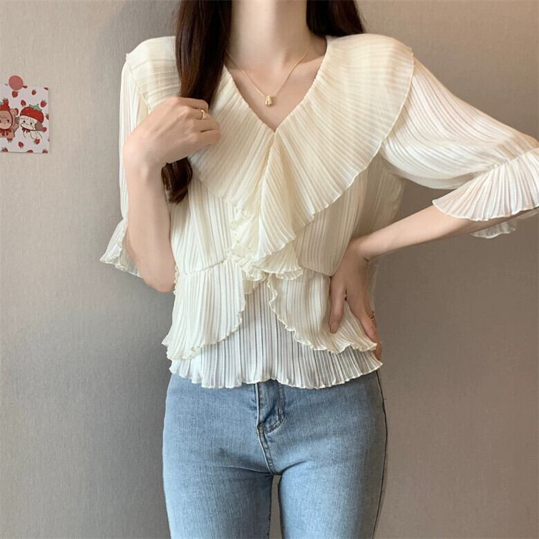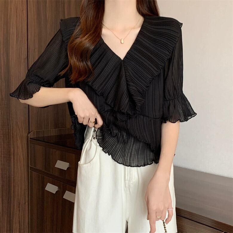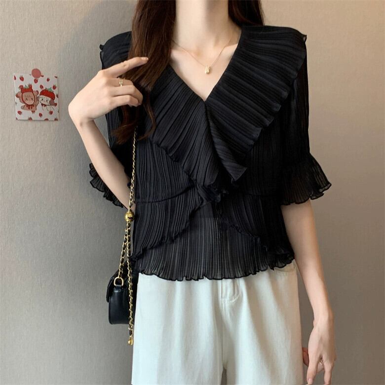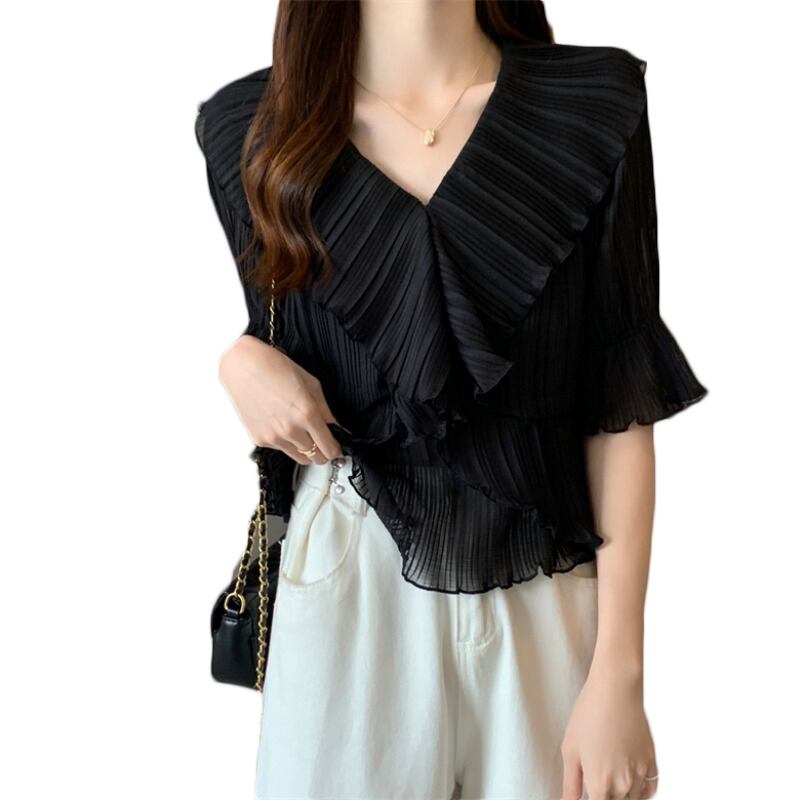 プラスサイズの婦人服 2023 夏服ファットシスターハイエンドデザインプリーツトップフリル V ネック腹カバーシャツ 大きめサイズ サマー 夏物 Vネック 8884142457837537