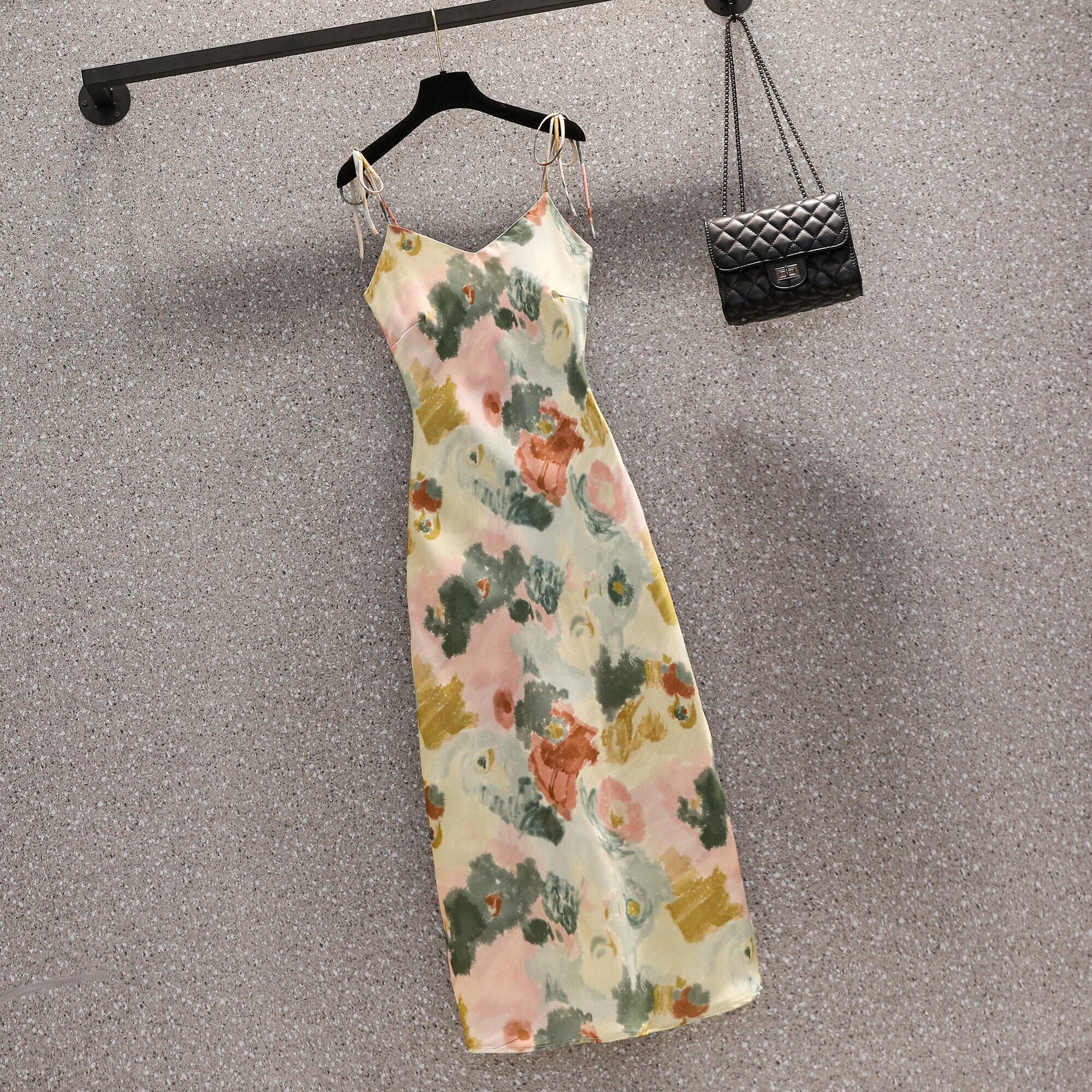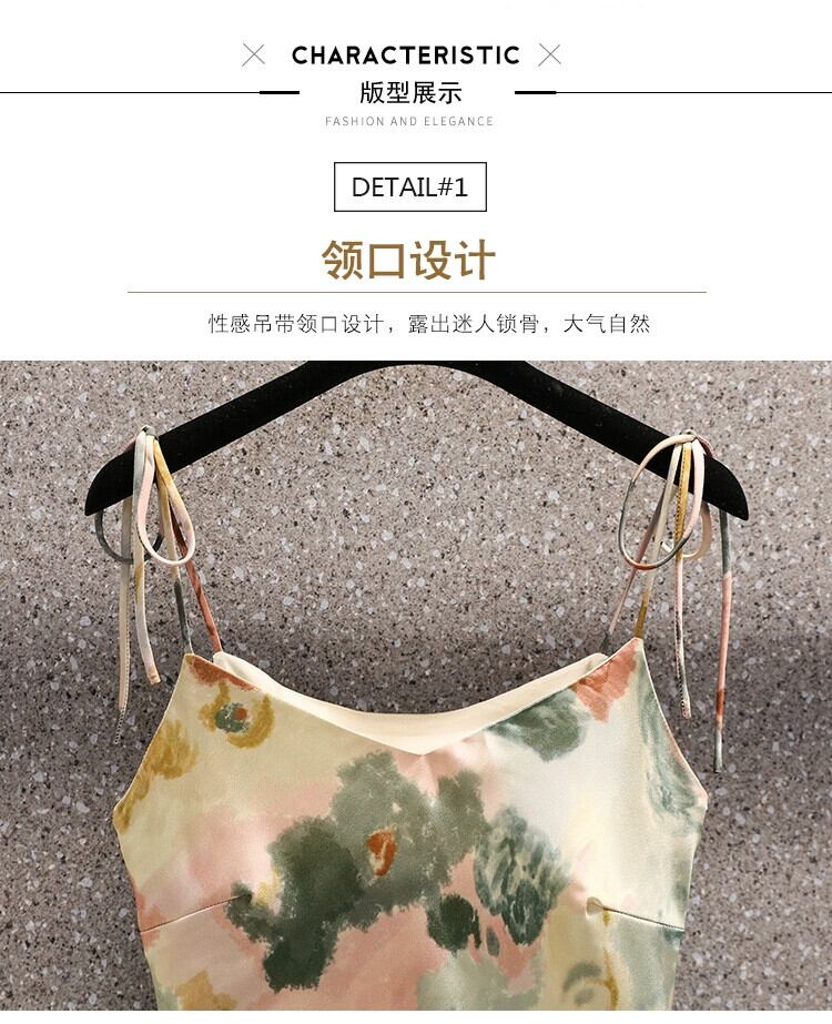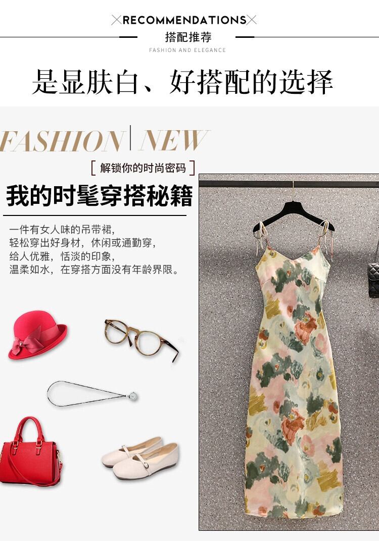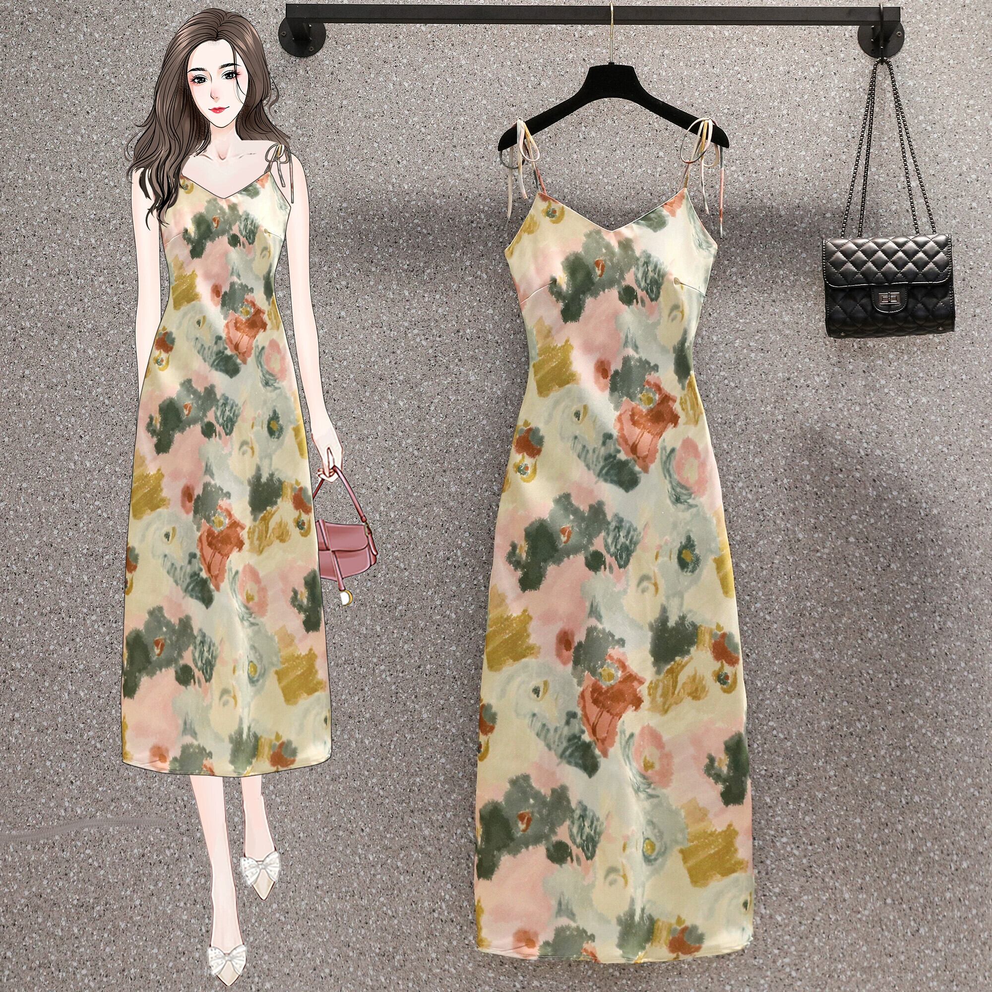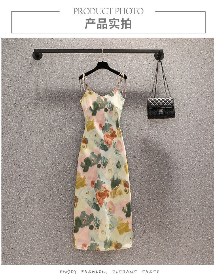 プラスサイズの婦人服 2023 脂肪姉妹夏の新 V ネック薄いストラップスリムフィットプリントサスペンダーロングドレス女性 大きめサイズ サマー 夏物 Vネック 8884132046641832