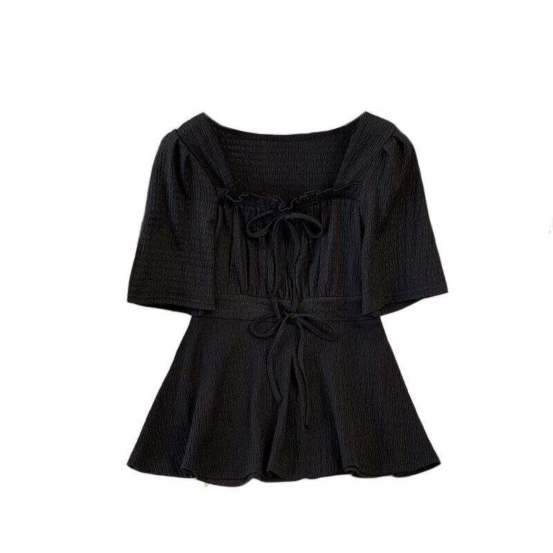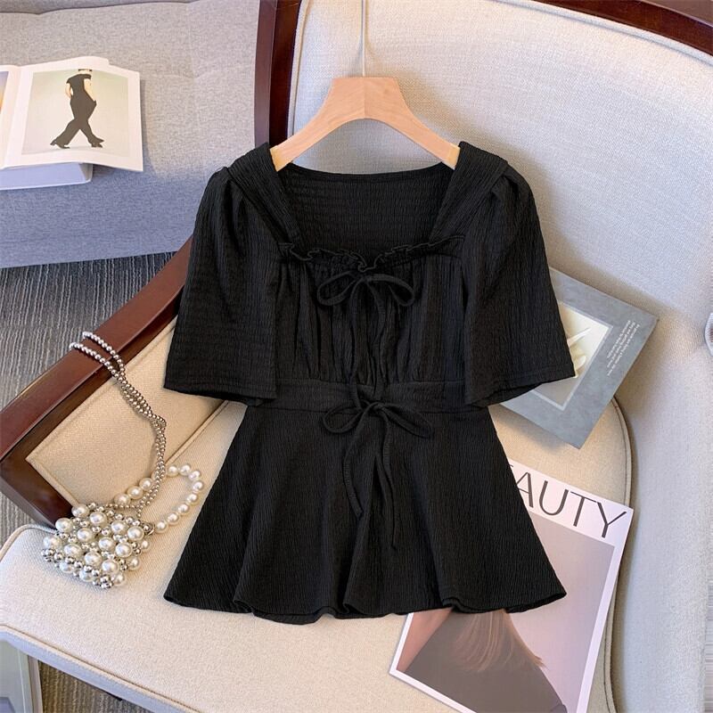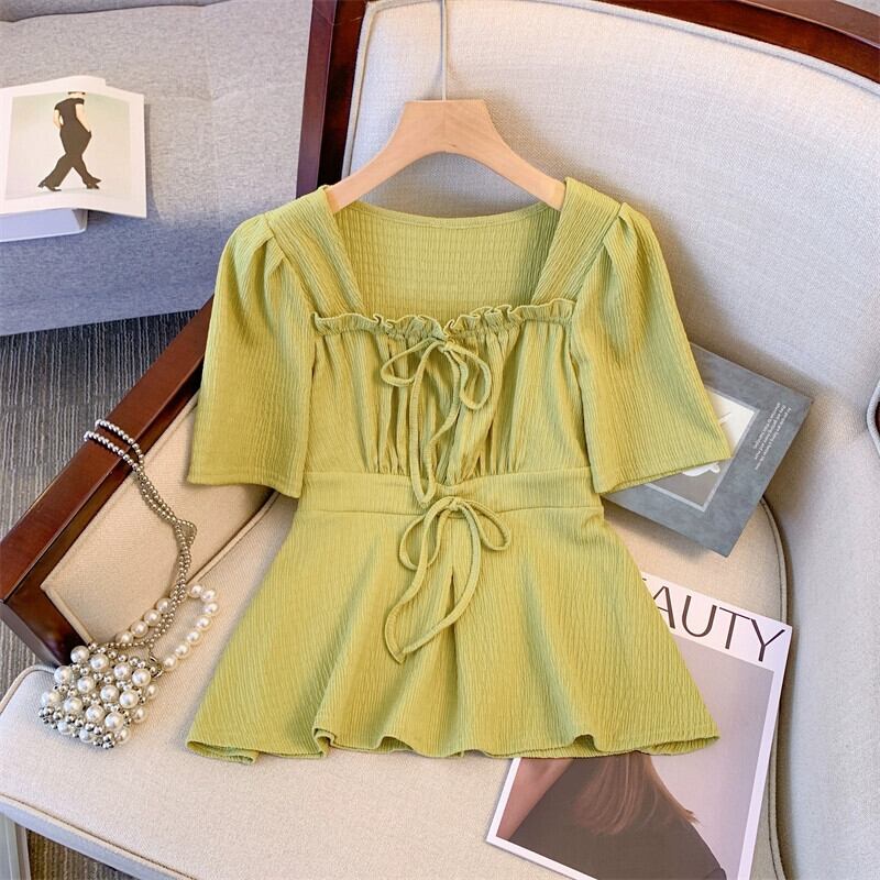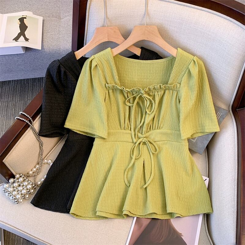 プラスサイズの婦人服 2023 夏服ファットシスターファッションスクエアカラー半袖プリーツシフォンシャツ気質半袖カジュアルトップ 大きめサイズ サマー 夏物 スクウェア 8884141247850725