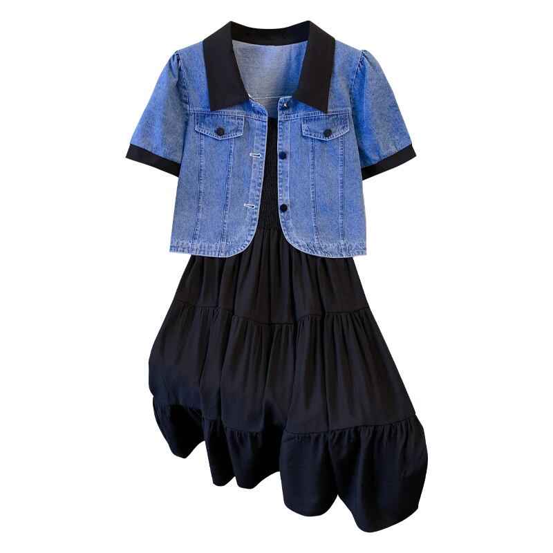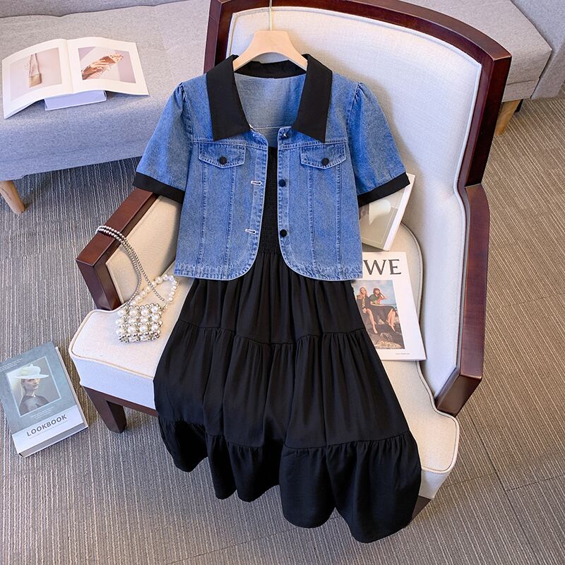 プラスサイズの婦人服 2023 脂肪姉妹アモイファッションスーツ半袖デニムトップサスペンダースカートドレス 2 点セット 大きめサイズ 8884198895161634