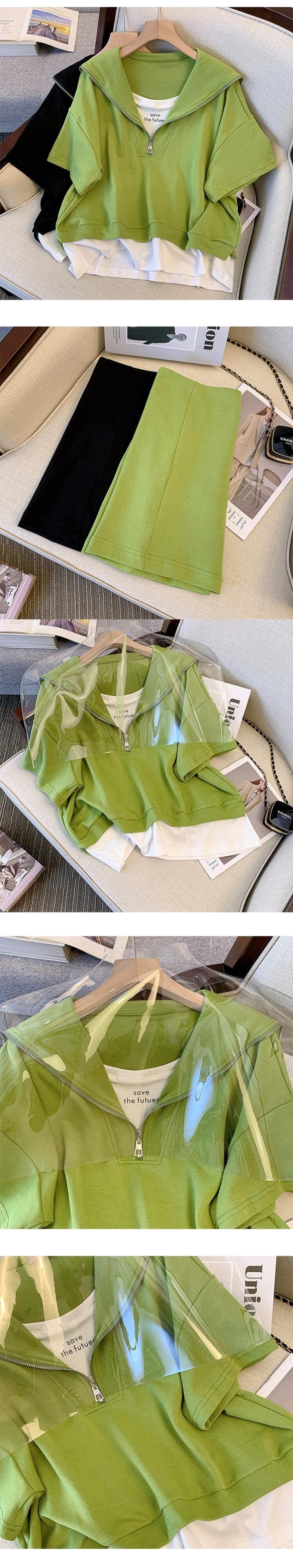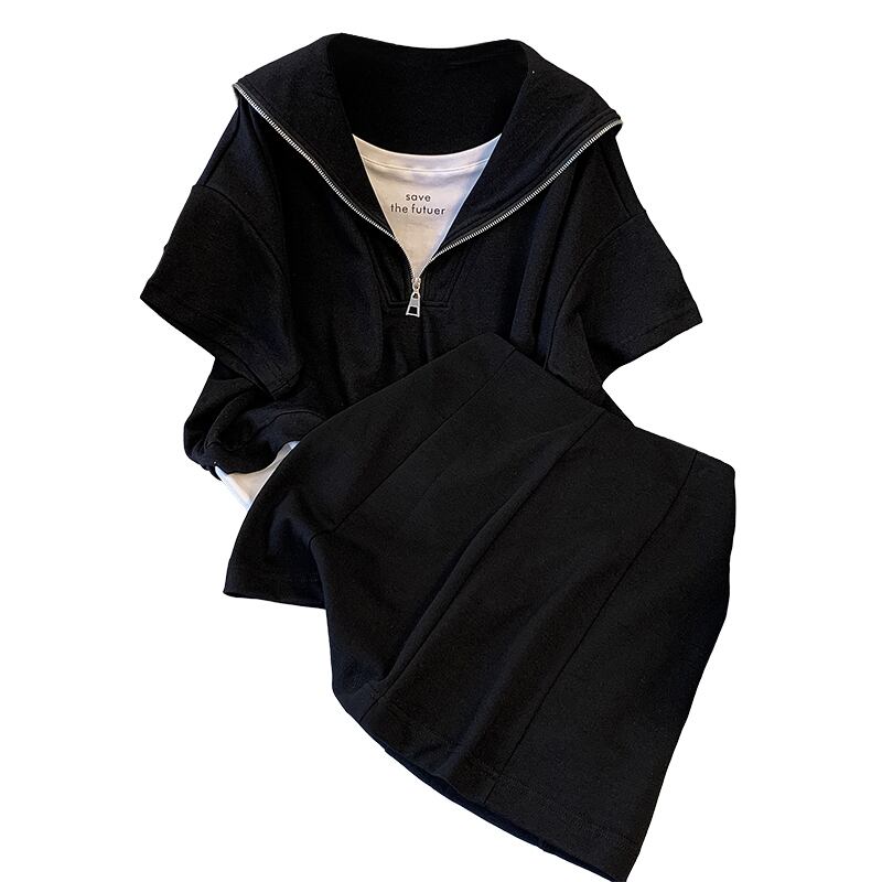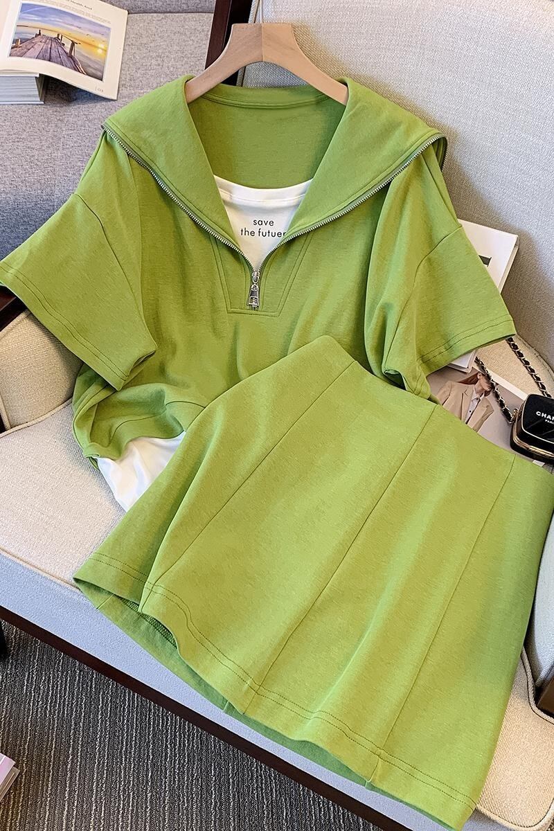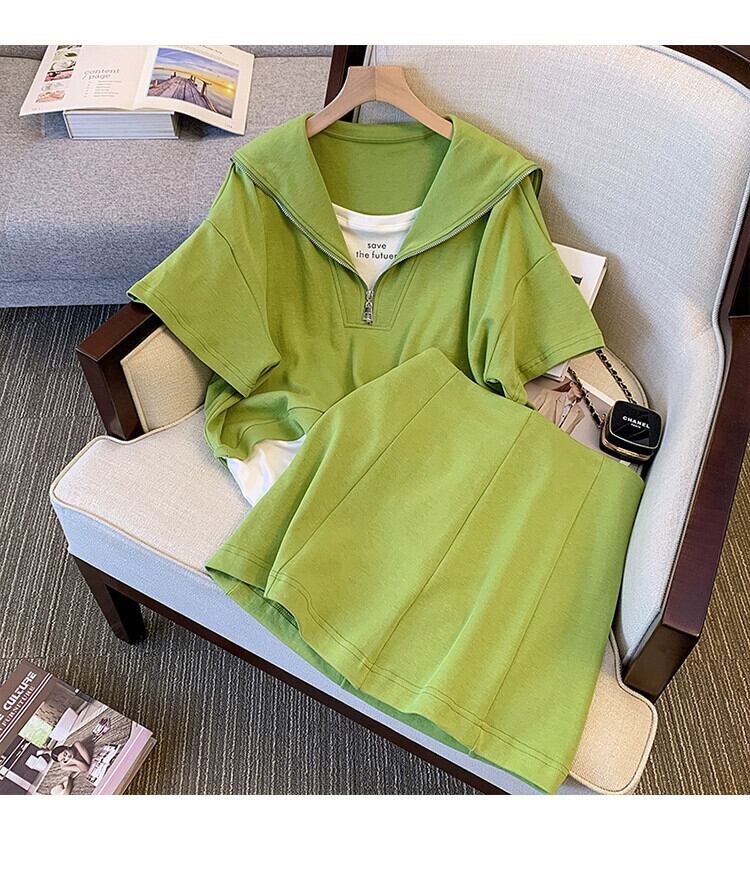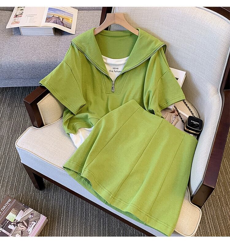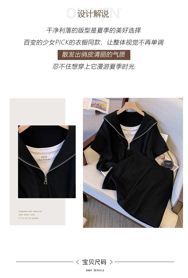 プラスサイズの婦人服 2023 ファットシスター夏のファッションスーツネイビーカラーパッチワークトップ弾性ウエストスカート 2 点セット エラスティック 伸縮 大きめサイズ サマー 夏物 8884154409876784