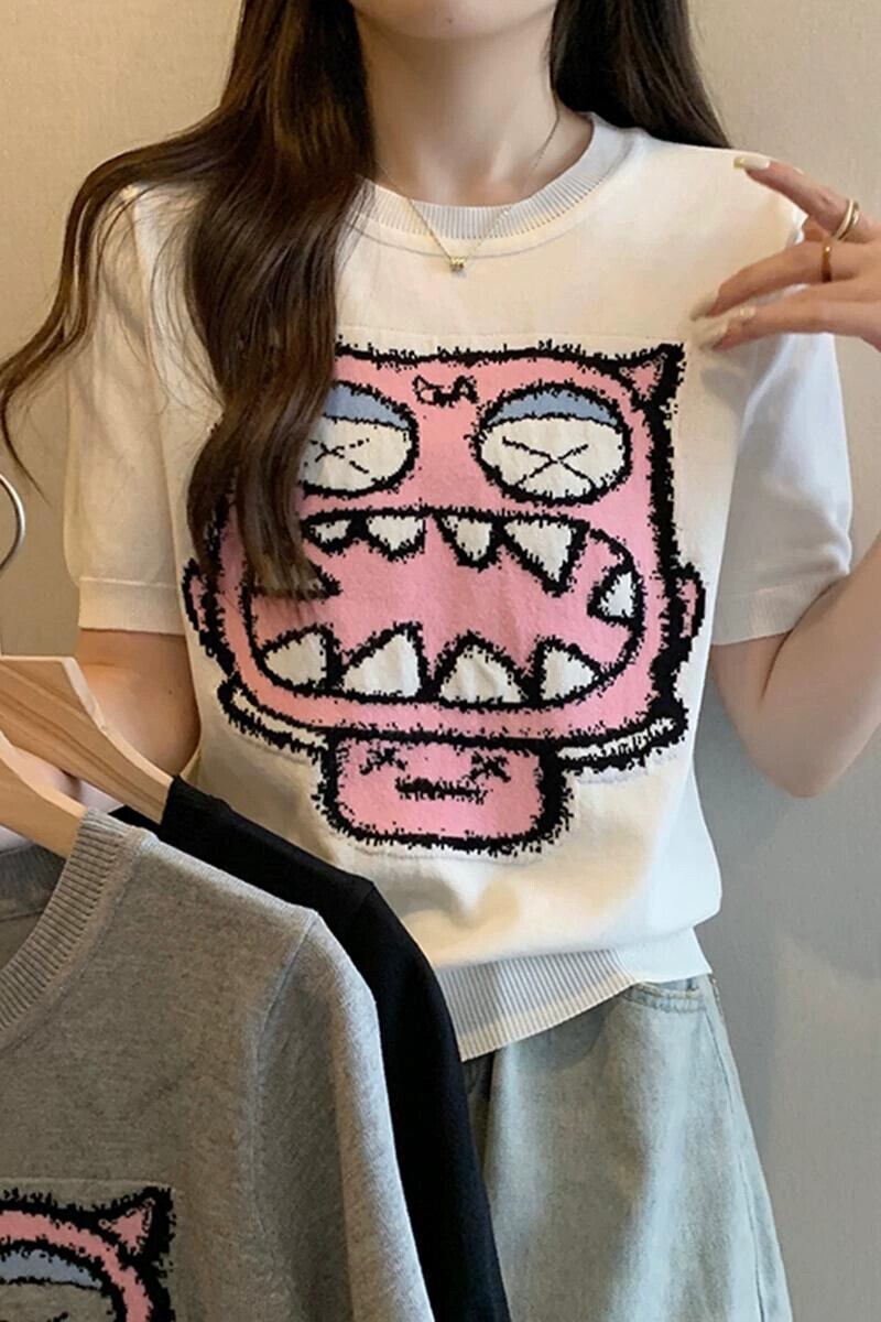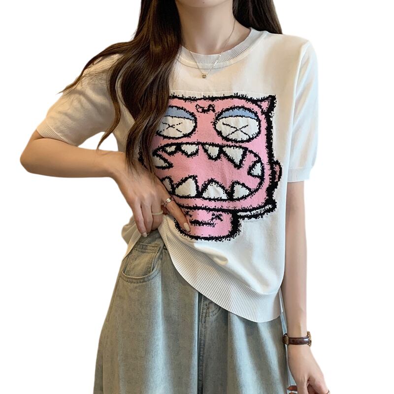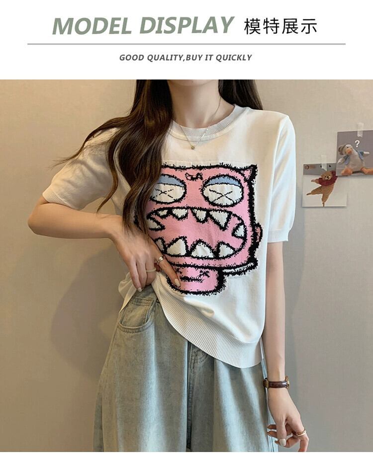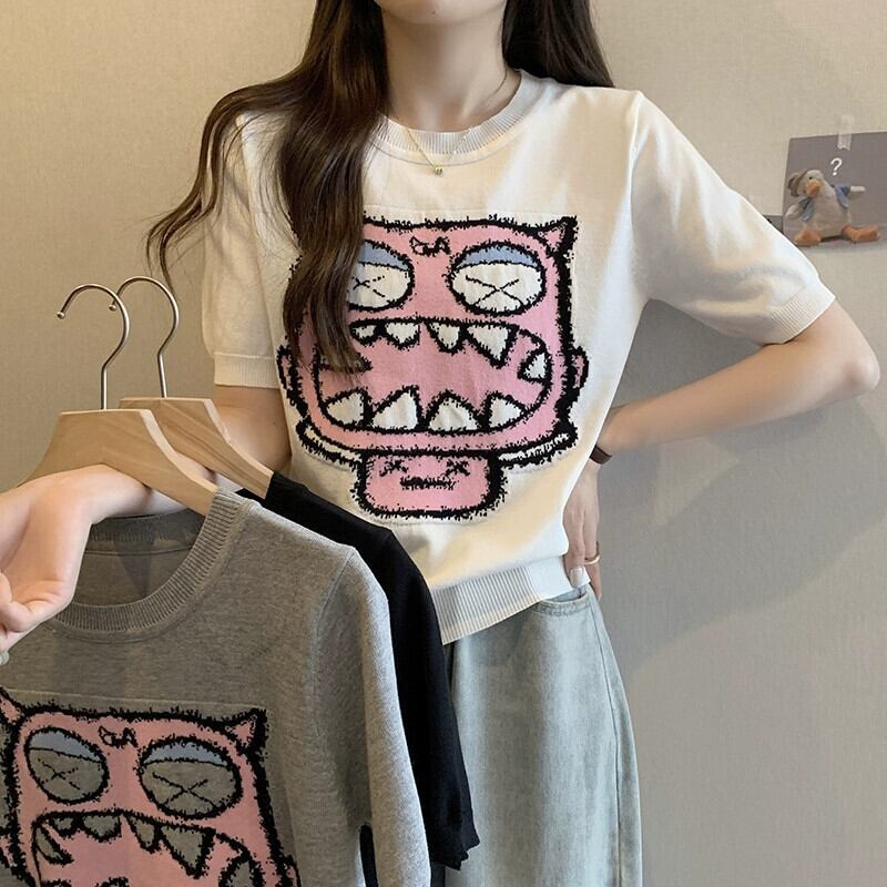 プラスサイズの婦人服 2023 ファットシスター夏新オールマッチ薄いニット半袖 Tシャツラウンドネックジャカードアイスシルクトップ 大きめサイズ サマー 夏物 Oネック 8884187734678044