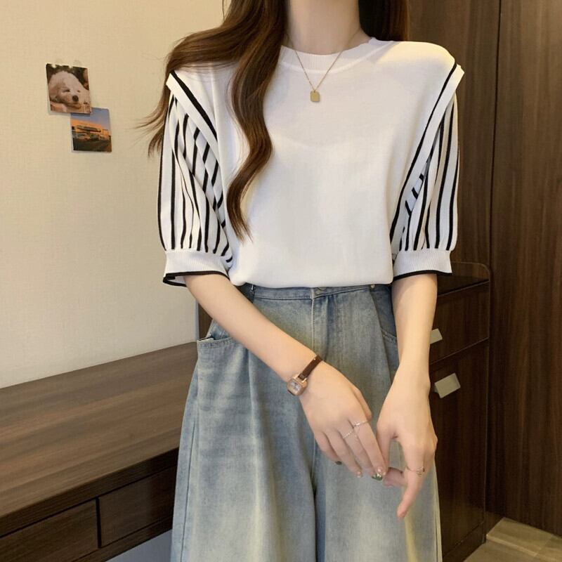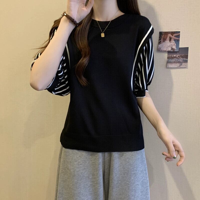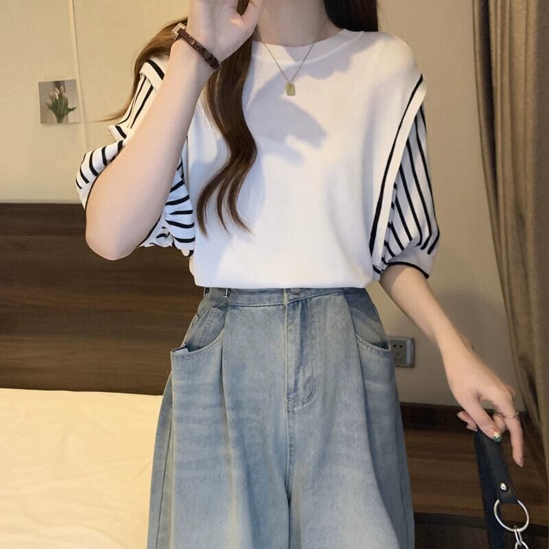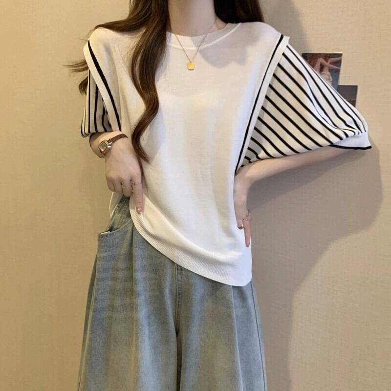 プラスサイズの婦人服 2023 夏服太った妹は痩せて見えるデザイン T シャツシックなスプライシングで肉の気質をカバーするストライプのトップ 大きめサイズ サマー 夏物 Tシャツ 8884174499073182