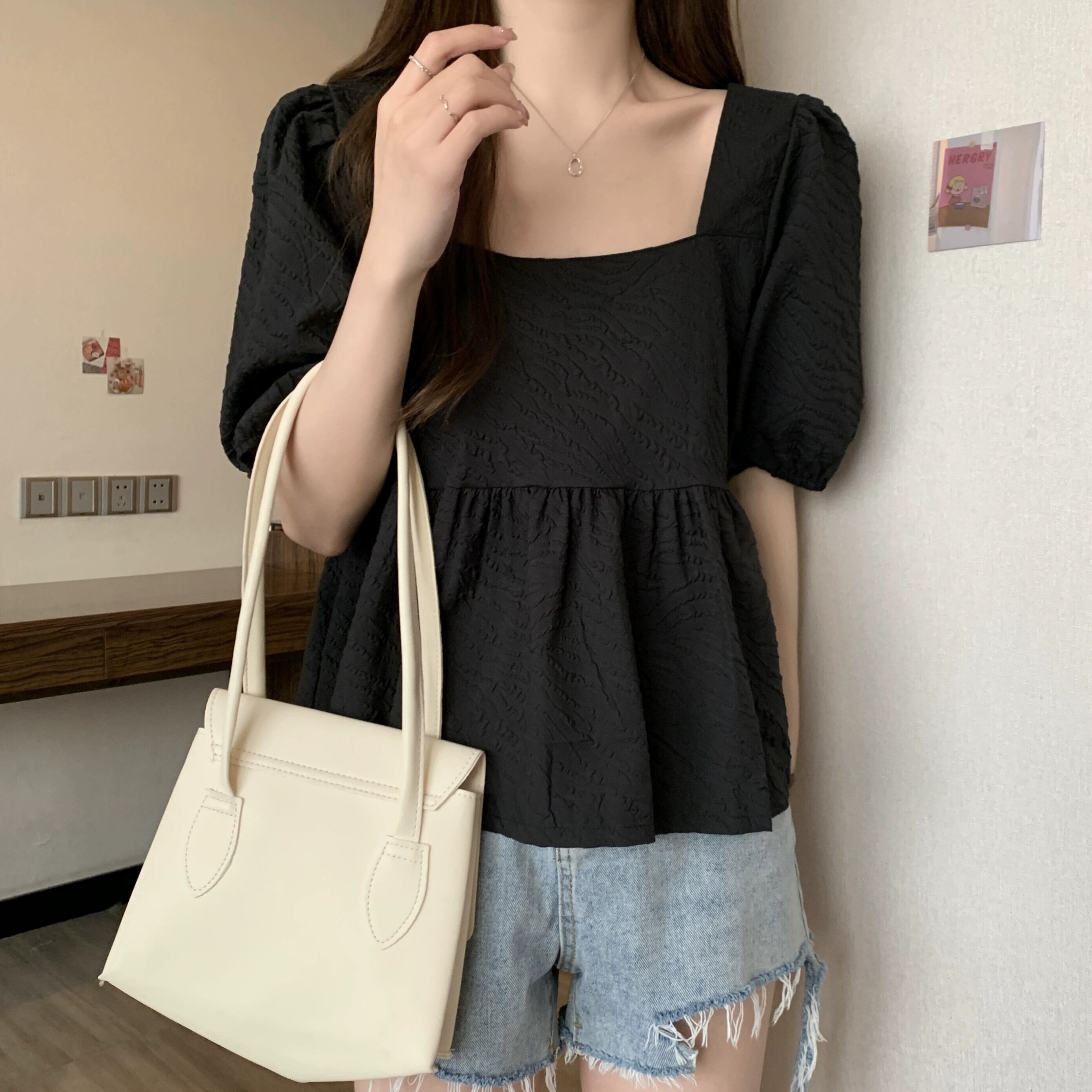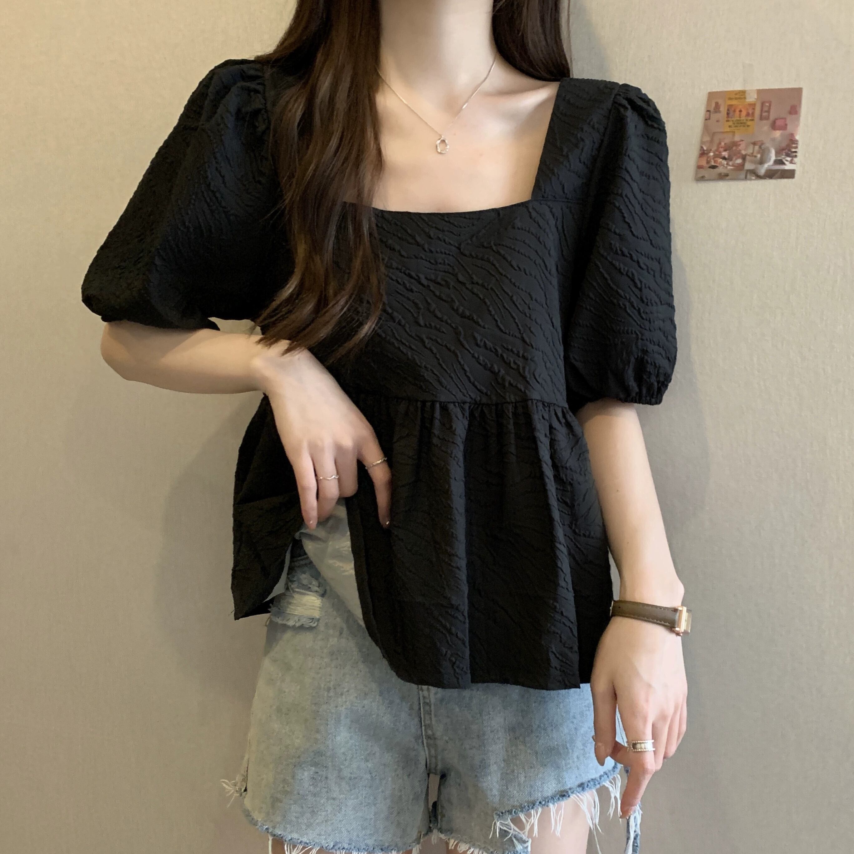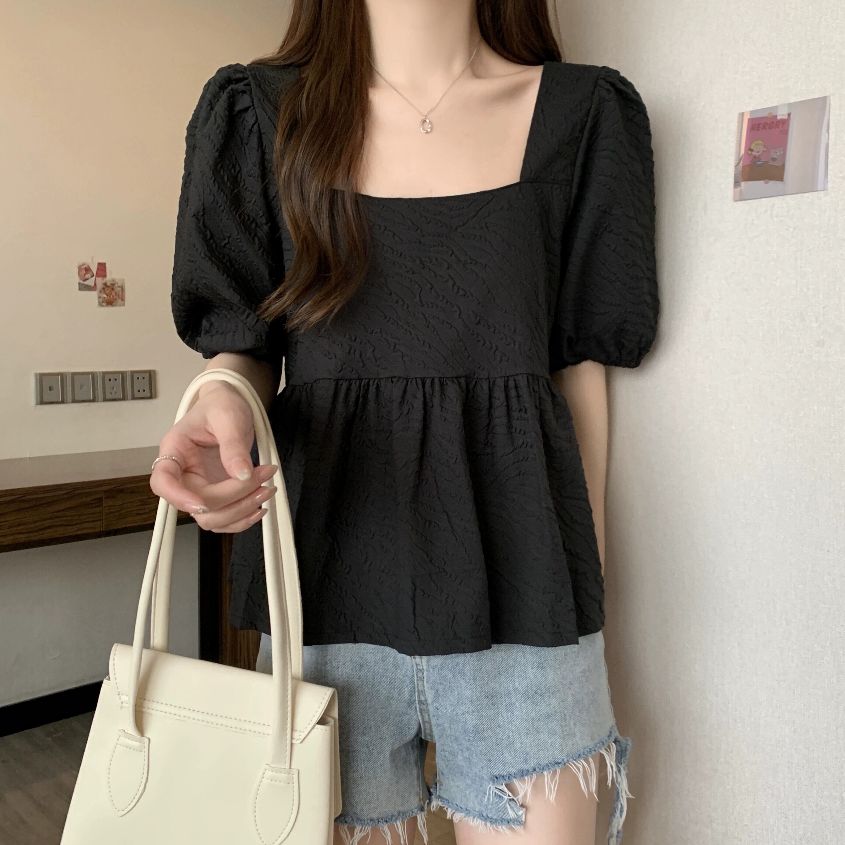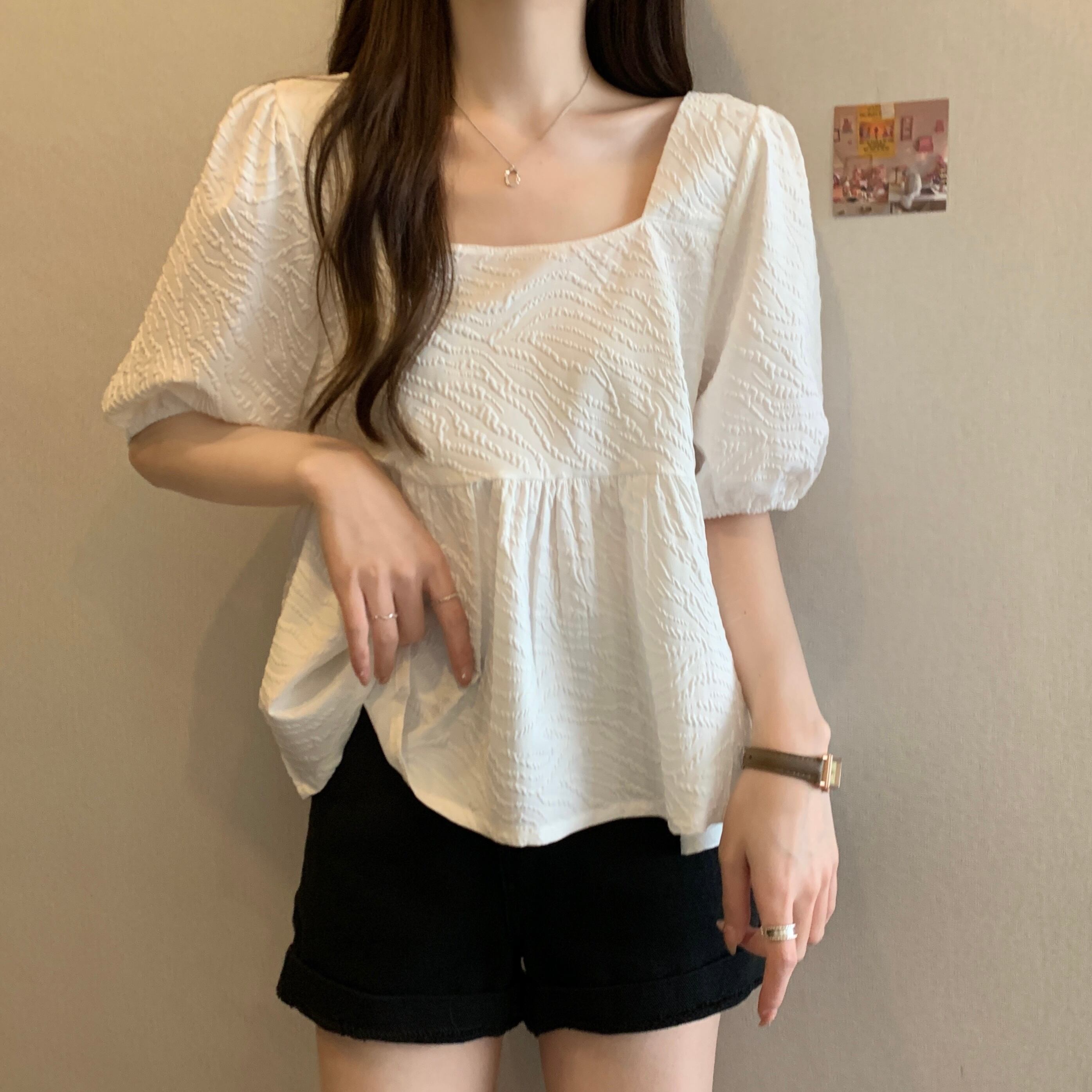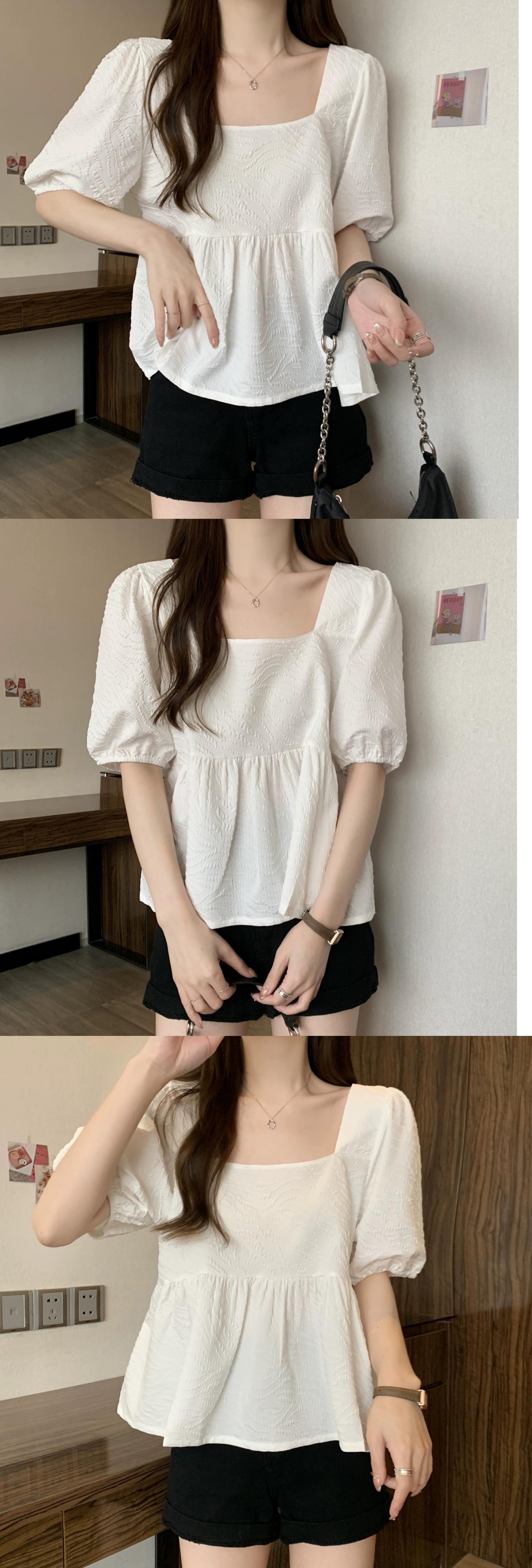 プラスサイズの婦人服 2023 ファットシスター夏の新しいスクエアカラーフレンチレトロな気質半袖シャツニッチトップ 大きめサイズ サマー 夏物 スクウェア 8884125894699578