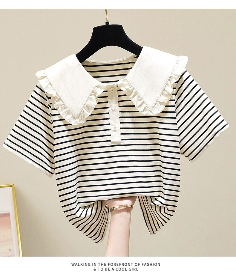 プラスサイズの婦人服 2023 夏の新ファッション脂肪姉妹薄い人形の襟ストライプ半袖 Tシャツルーズトップ 大きめサイズ サマー 夏物 8884119102013447