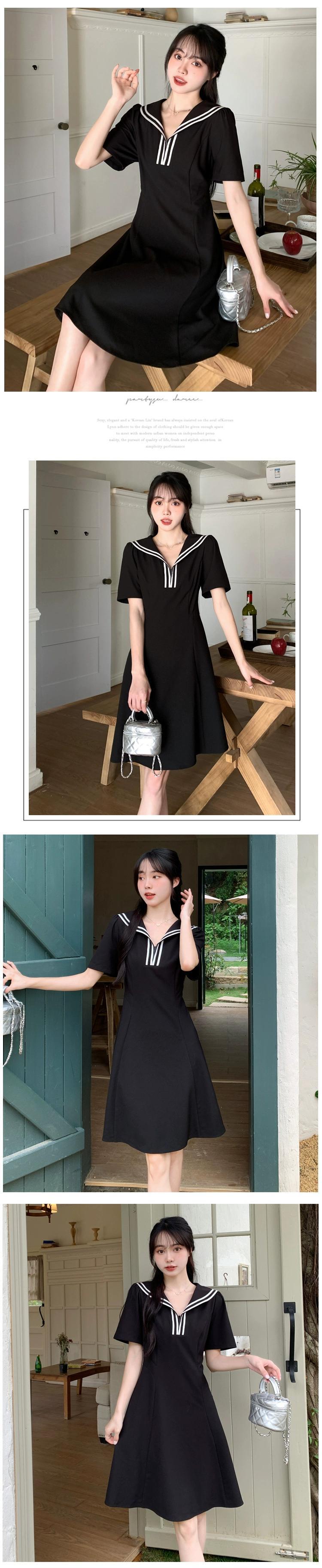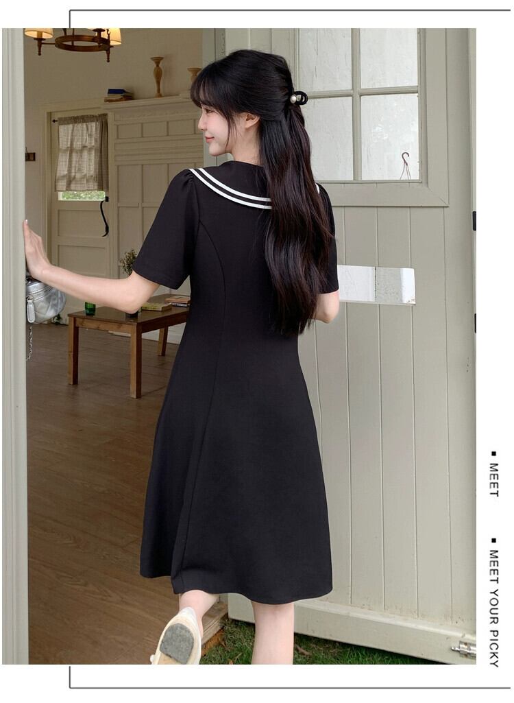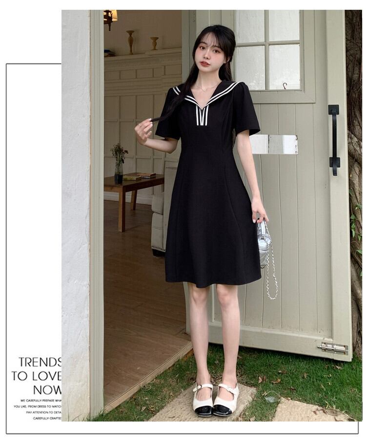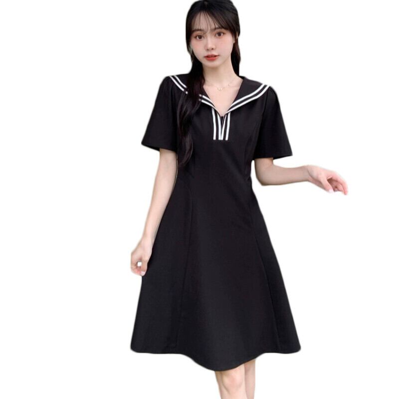 プラスサイズの婦人服 2023 夏服ファットシスターレトロネイビーカラードレスファッション肩が肉をカバーし、薄く見えるリトルブラックドレス 大きめサイズ サマー 夏物 8884139912366219
