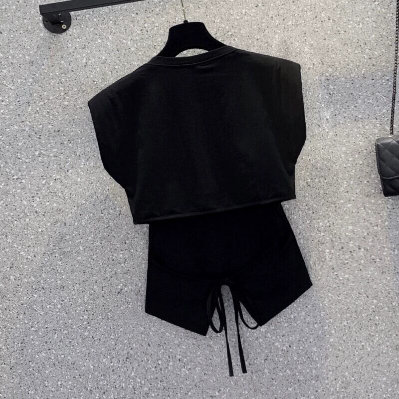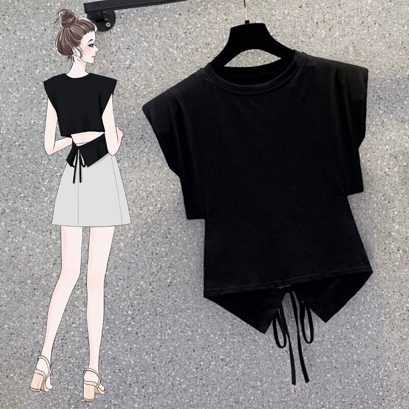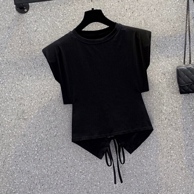 プラスサイズの女性のトレンディな夏服ファットシスターファッションオールマッチ肩パッド Tシャツアインスタイルストラップデザイントップ半袖 ショート ハーフスリーブ 大きめサイズ サマー 夏物 8884147727457440