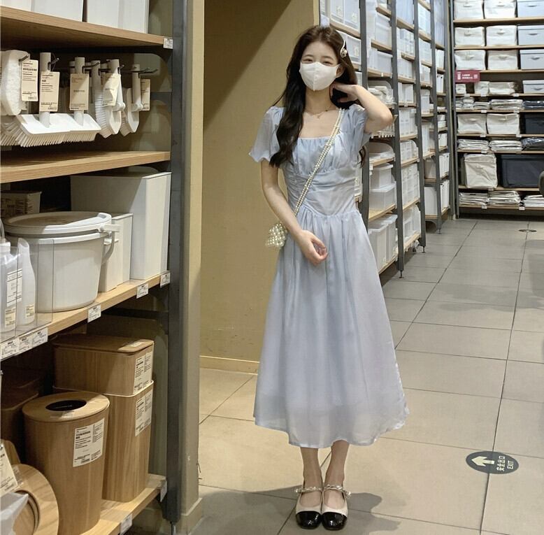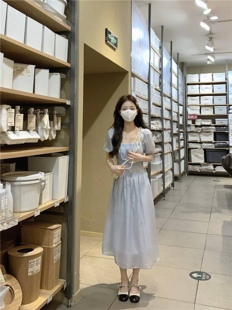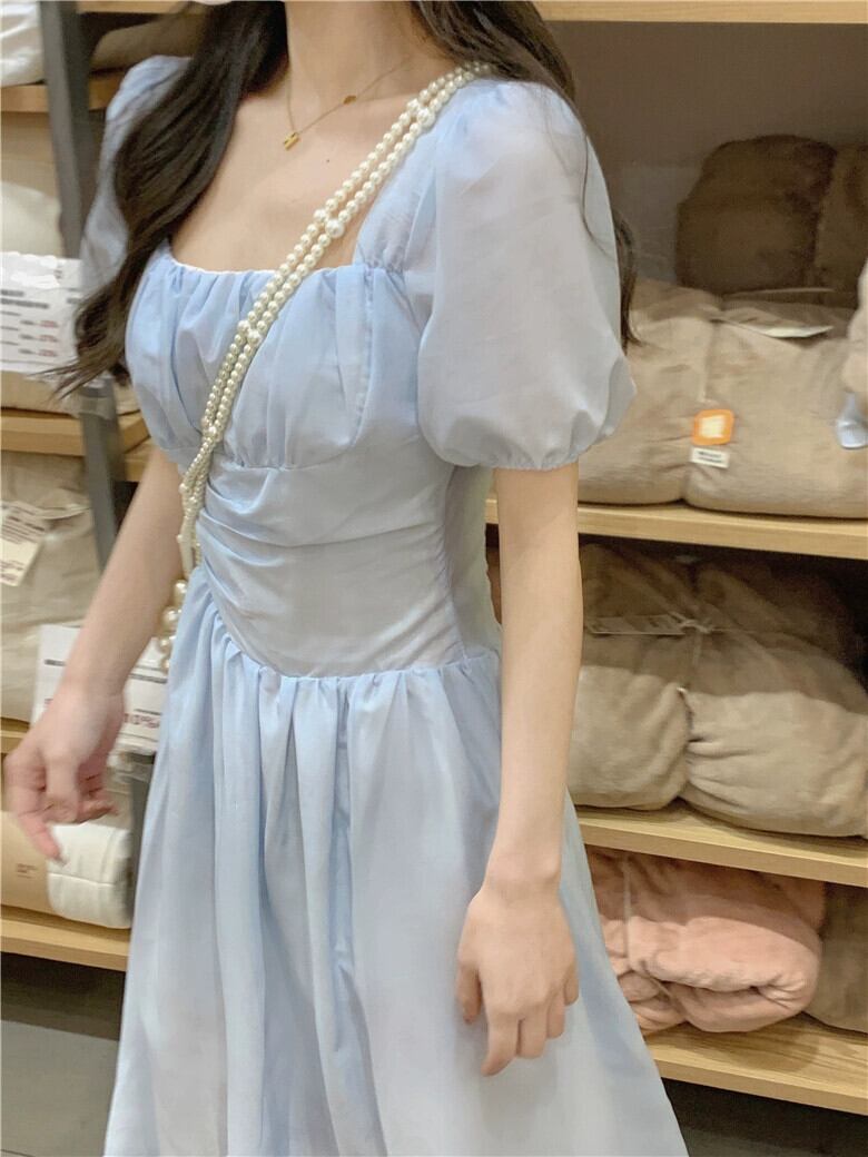 プラスサイズの婦人服 2023 夏服脂肪姉妹気質スクエアカラーフレンチ A ラインスカートスリムパフスリーブシックなドレス 大きめサイズ サマー 夏物 Aライン スクウェア 888413441808451