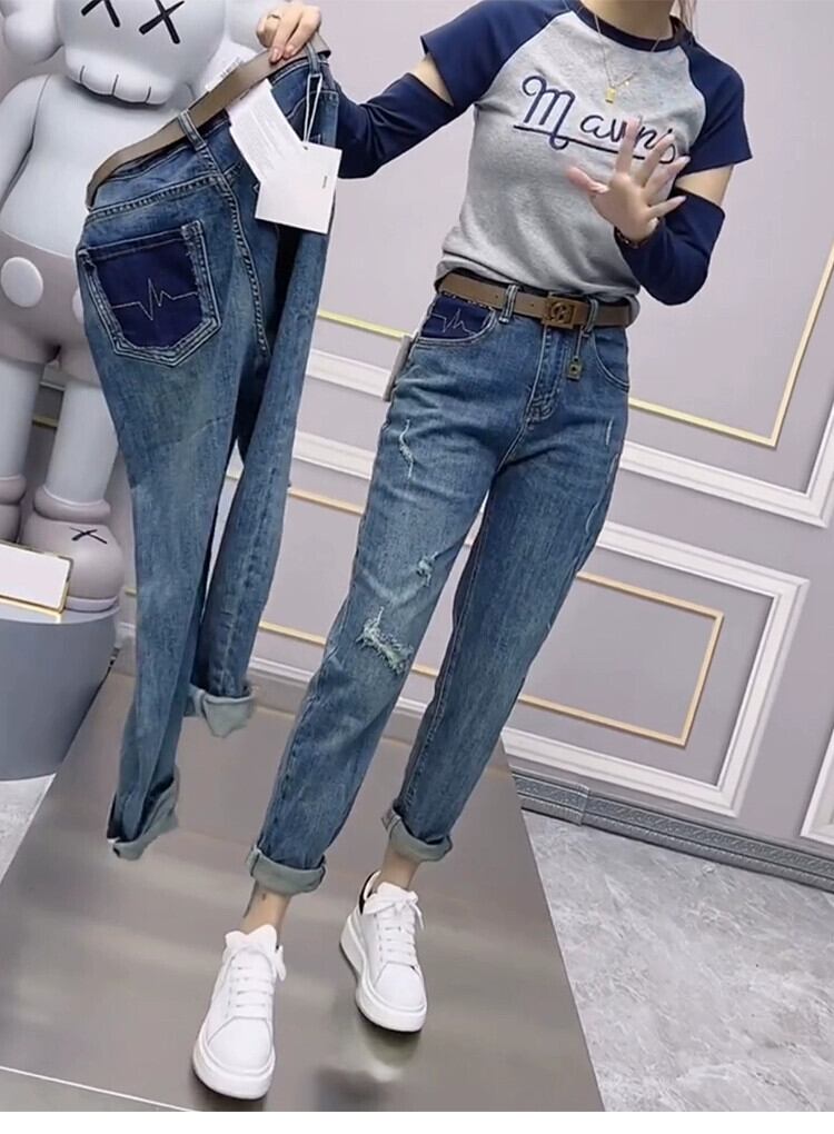 プラスサイズの婦人服 2023 春服ファットシスターズハイウエストカラーブロッキング穴ハーレムジーンズ弾性スリムパパパンツ エラスティック 伸縮 大きめサイズ スプリング 春物 8884180688603359