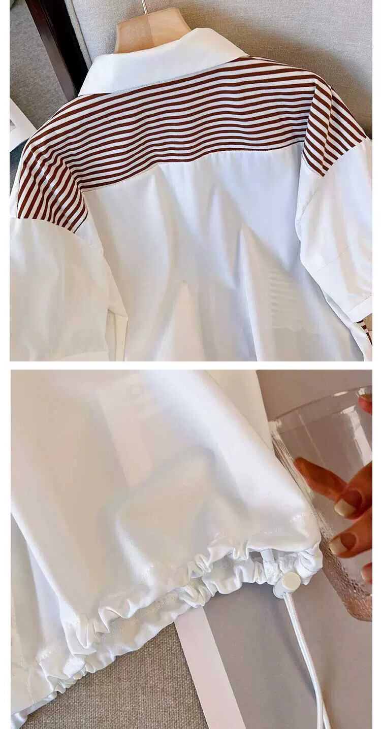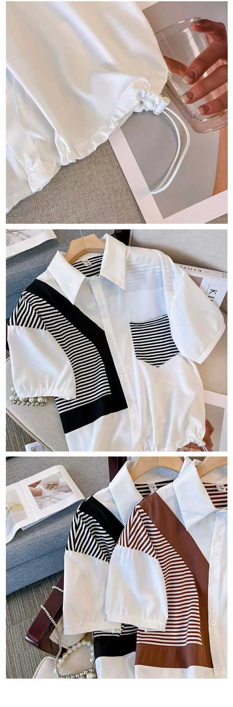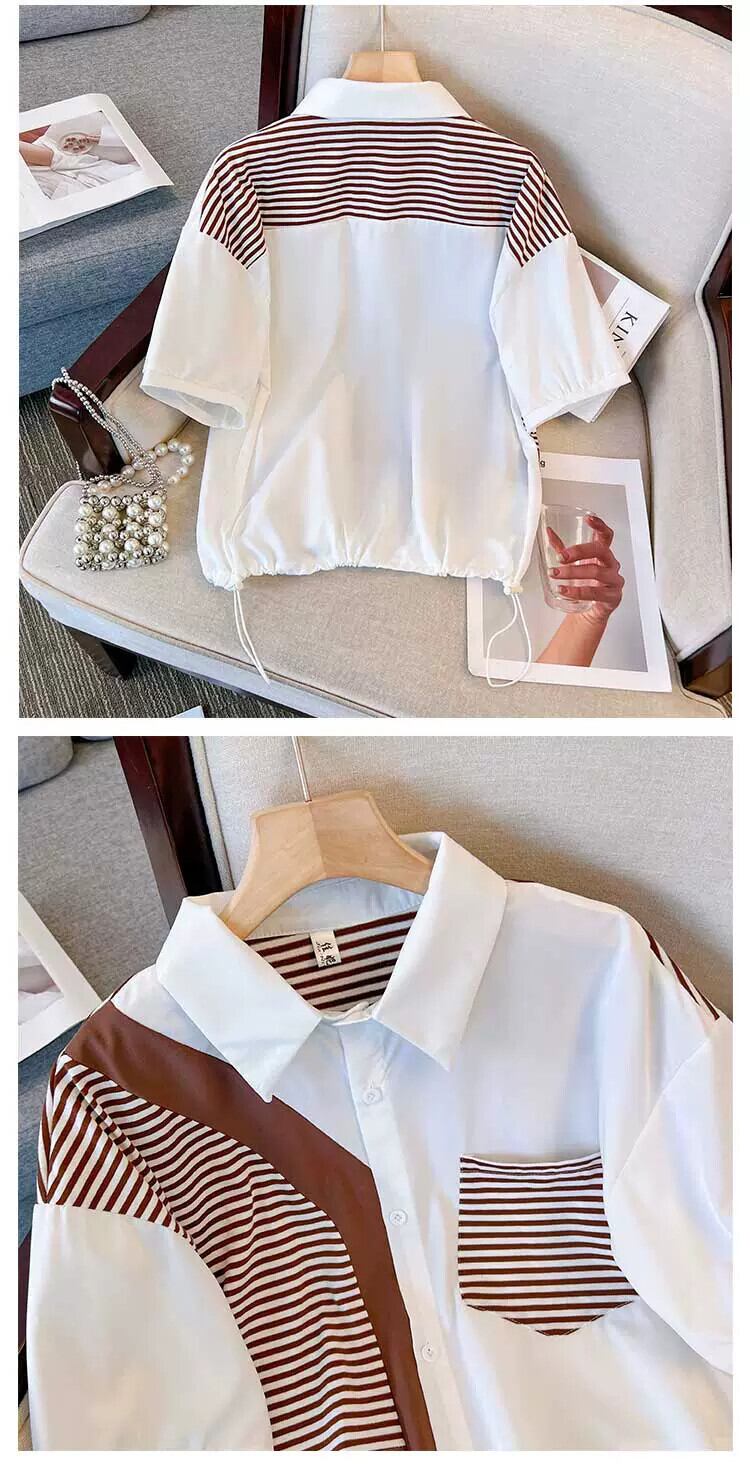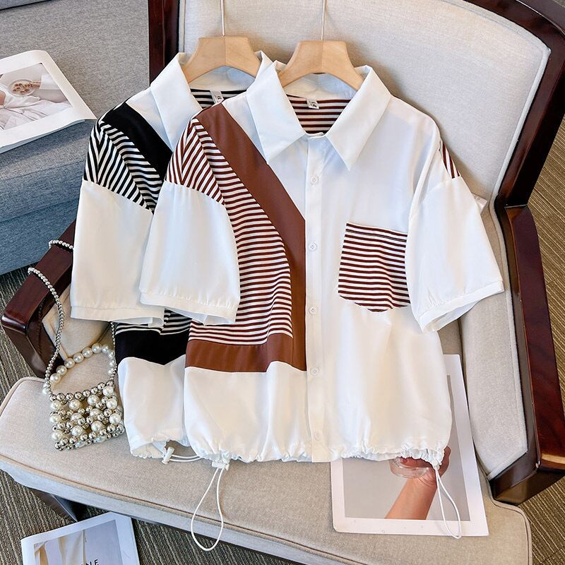 プラスサイズの婦人服 2023 夏服ファットオールマッチデザイントップススリムステッチストライプカジュアル気質シャツ 大きめサイズ サマー 夏物 8884164300322665