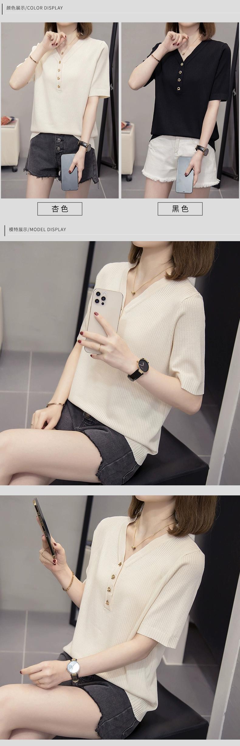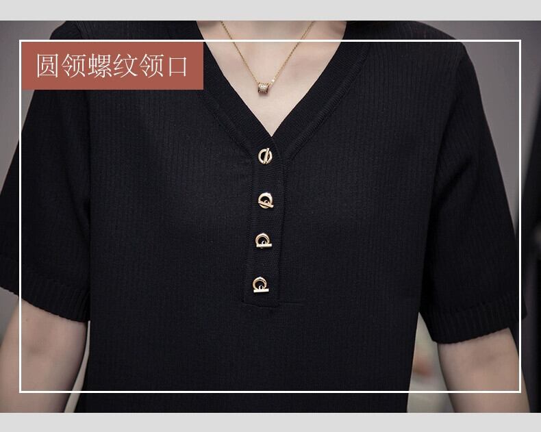 大きいサイズの婦人服 2023 ファットシスター夏新シンプルなピットストリップ V ネックアイスシルクセータールーズ半袖 Tシャツトップ 大きめサイズ サマー 夏物 Vネック 8884133440188654