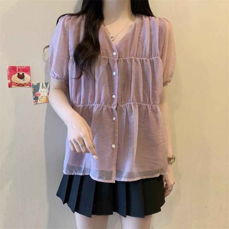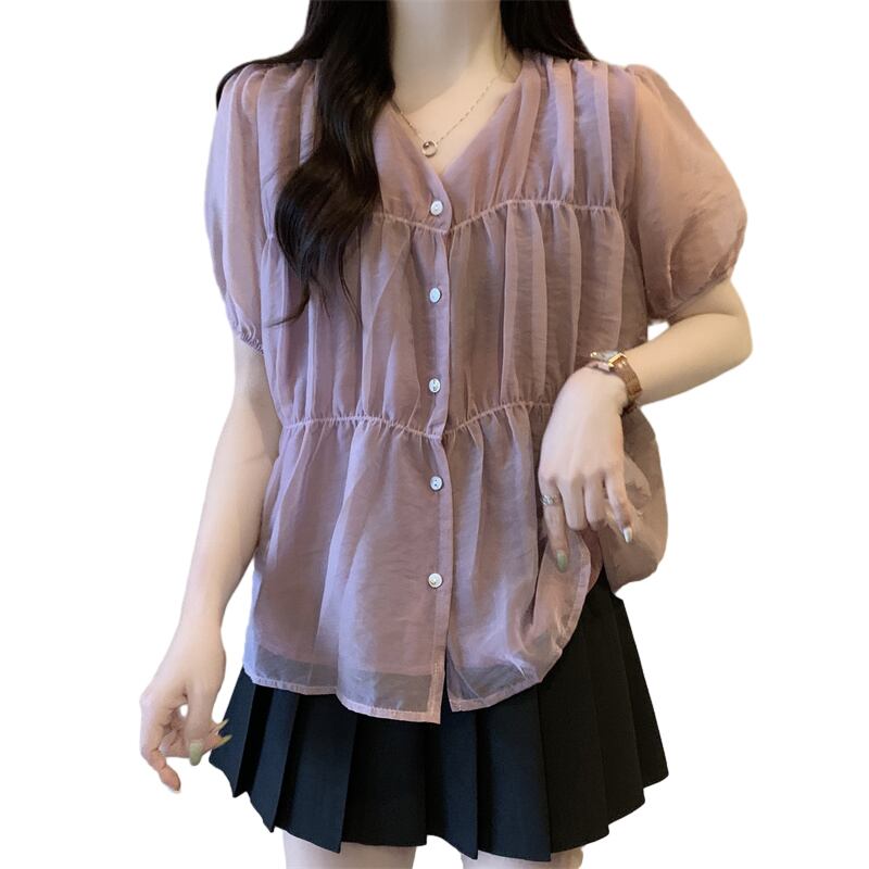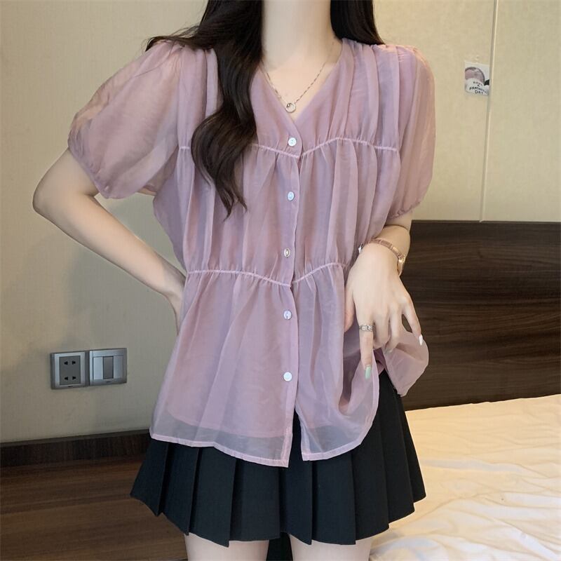 プラスサイズの婦人服 2023 トレンディな夏の新しい脂肪姉妹は薄い V ネックパフスリーブ Tシャツファッション気質無地シフォンシャツ 大きめサイズ サマー 夏物 Vネック ソリッドカラー 8884153592699597