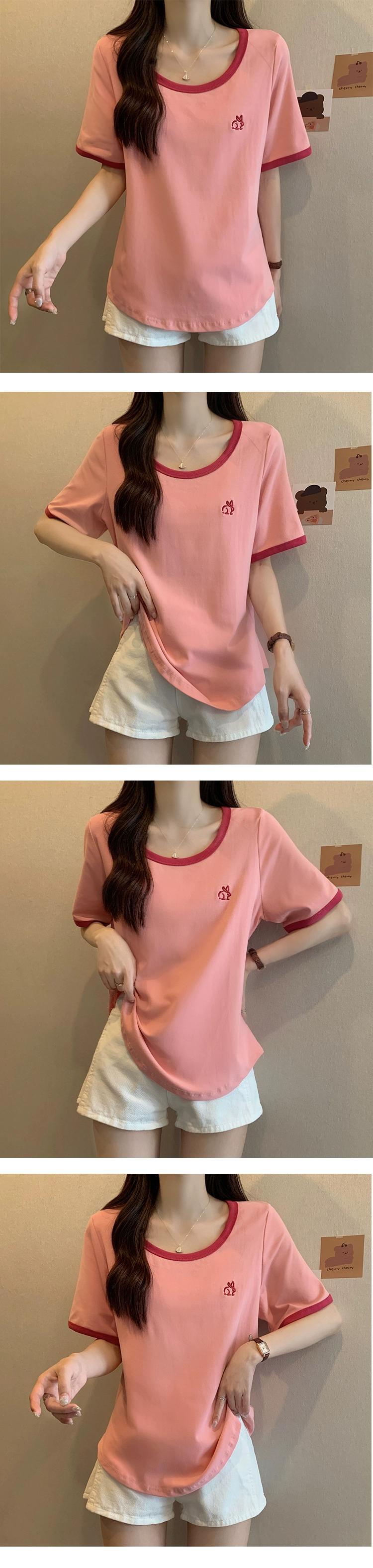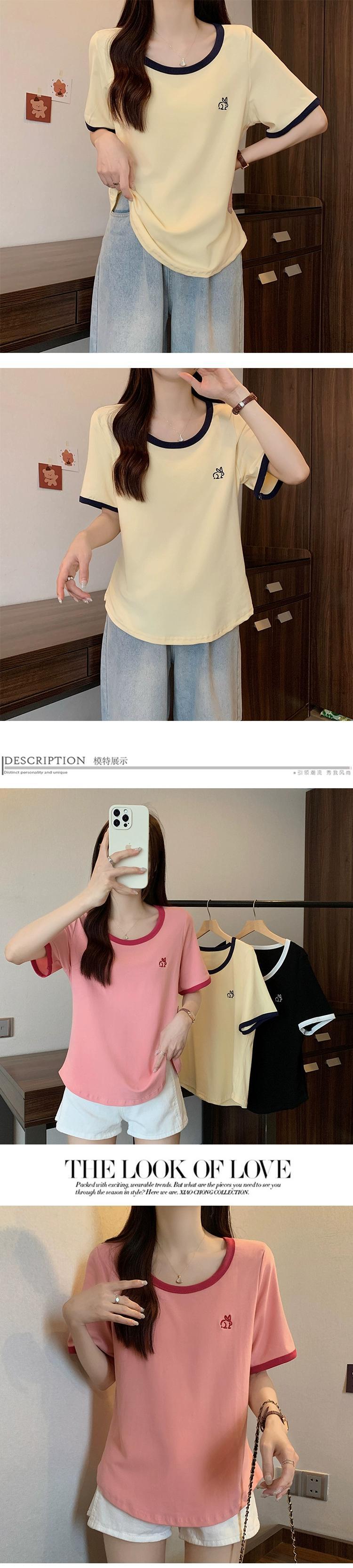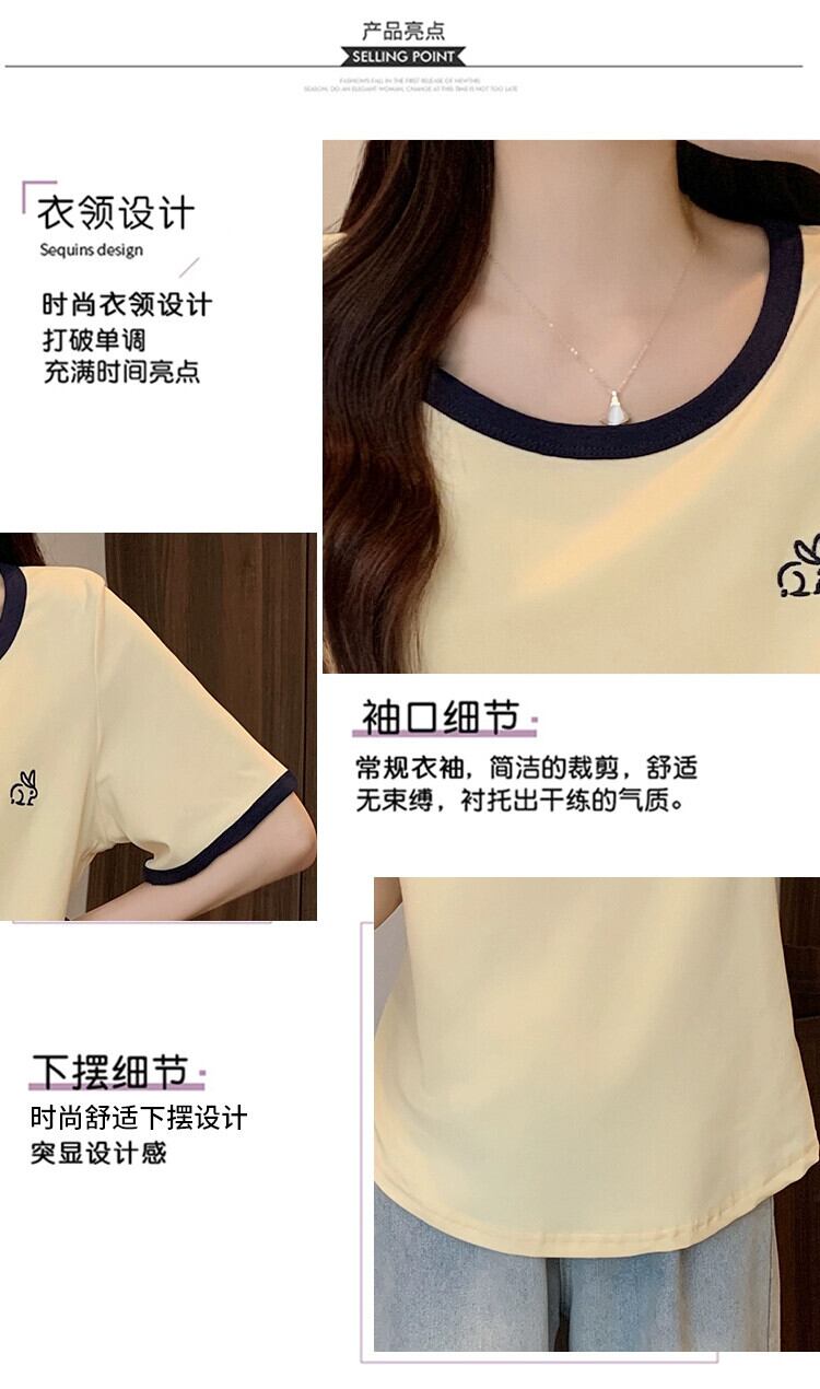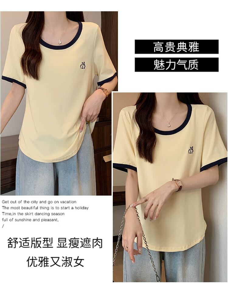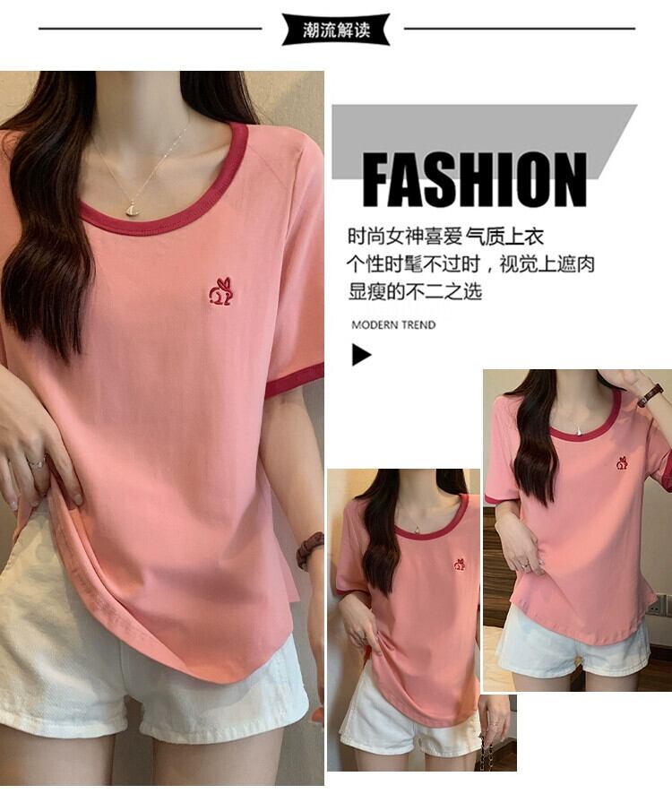 プラスサイズの婦人服 2023 ファットシスター夏の新しいカジュアルオールマッチコントラストカラーラウンドネックルーズスリム半袖 Tシャツトップ 大きめサイズ サマー 夏物 Oネック 8884140475738306