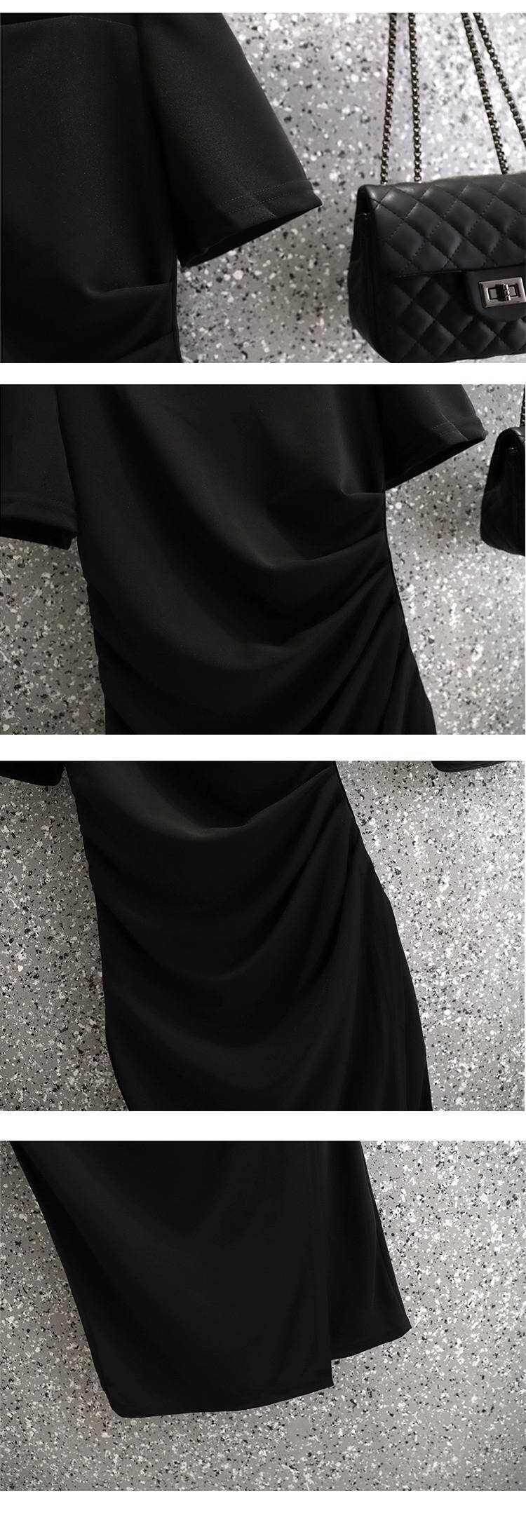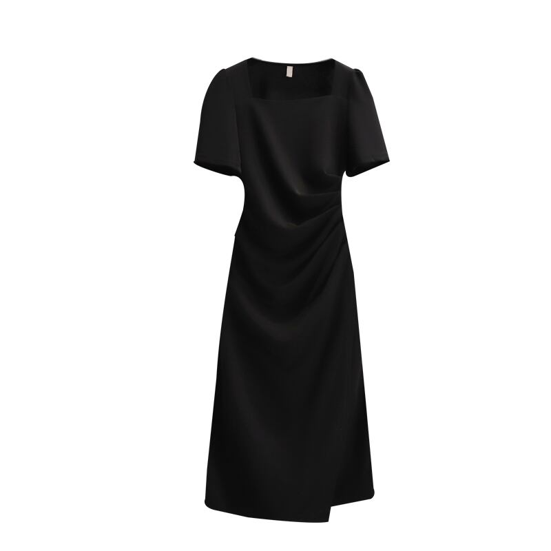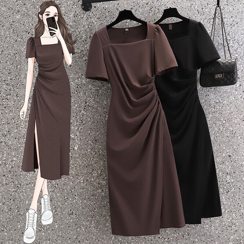 プラスサイズの婦人服 2023 夏服ファットシスター無地スクエアカラー半袖ドレススリット気質ハイウエスト薄いスカート ハイウェスト 大きめサイズ サマー 夏物 ソリッドカラー スクウェア 8884174732836403