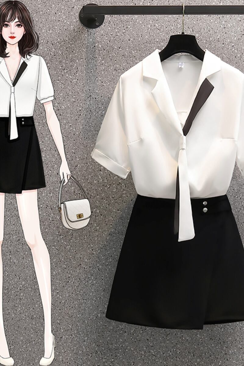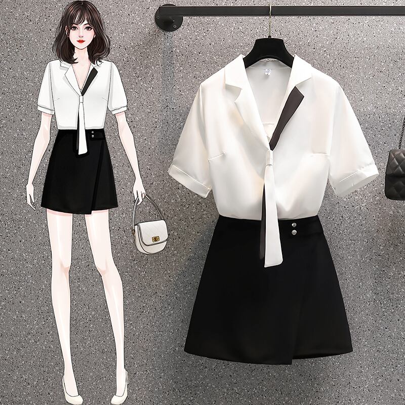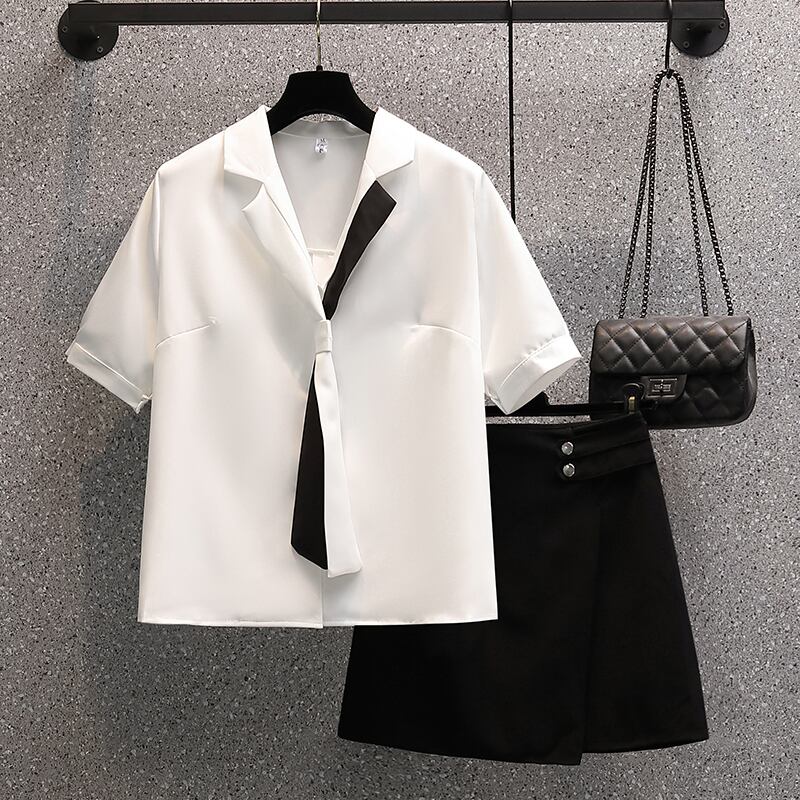 プラスサイズの婦人服 2023 脂肪姉妹夏の新しいスタイルのスーツシフォンシャツハイウエストショートスカート痩身ツーピーススーツ ハイウェスト 大きめサイズ サマー 夏物 888415955878340