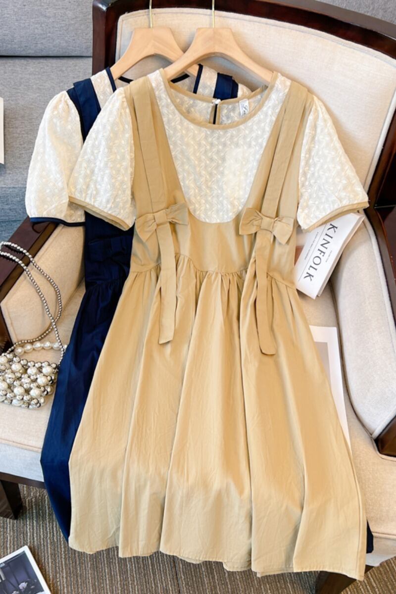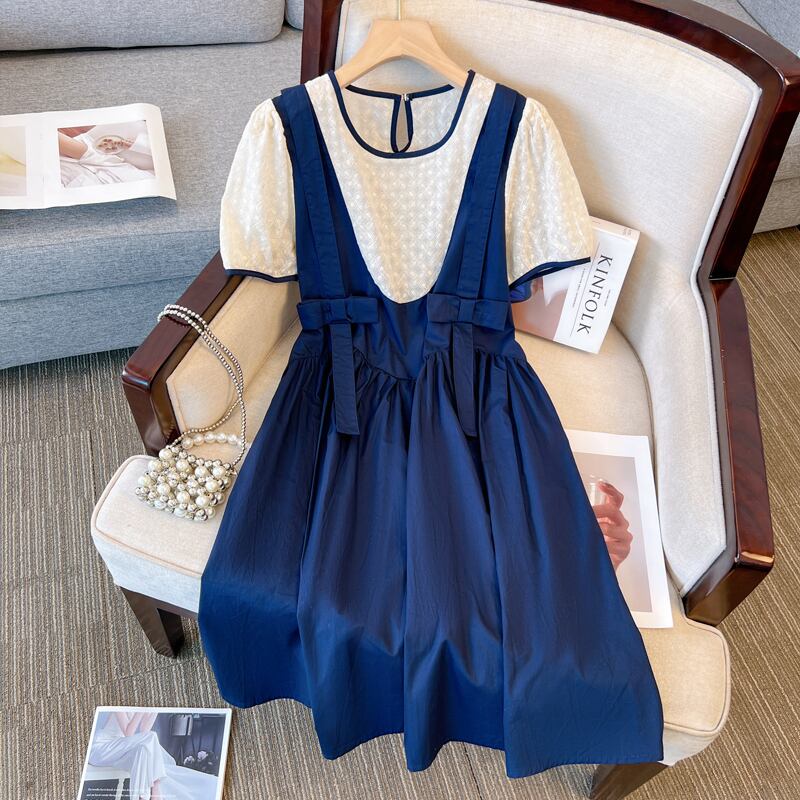 プラスサイズの婦人服 2023 夏服脂肪姉妹デザインちょう結び A ラインスカートスプライシング偽ツーピースサスペンダードレス リボン 大きめサイズ サマー 夏物 Aライン 8884130426917185
