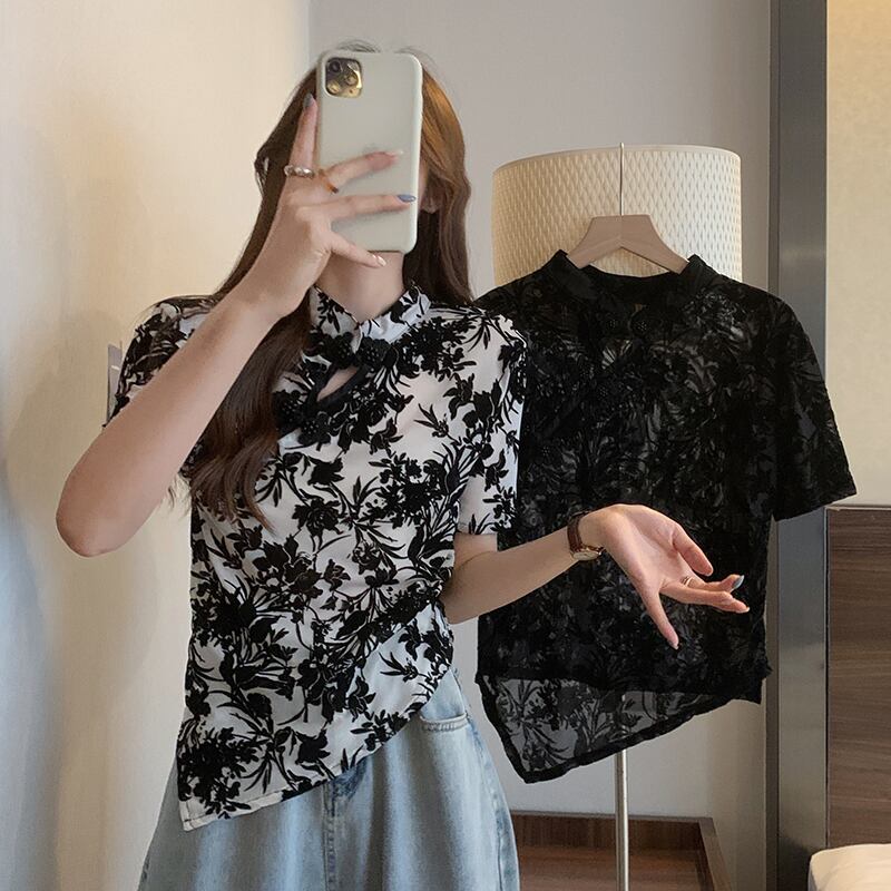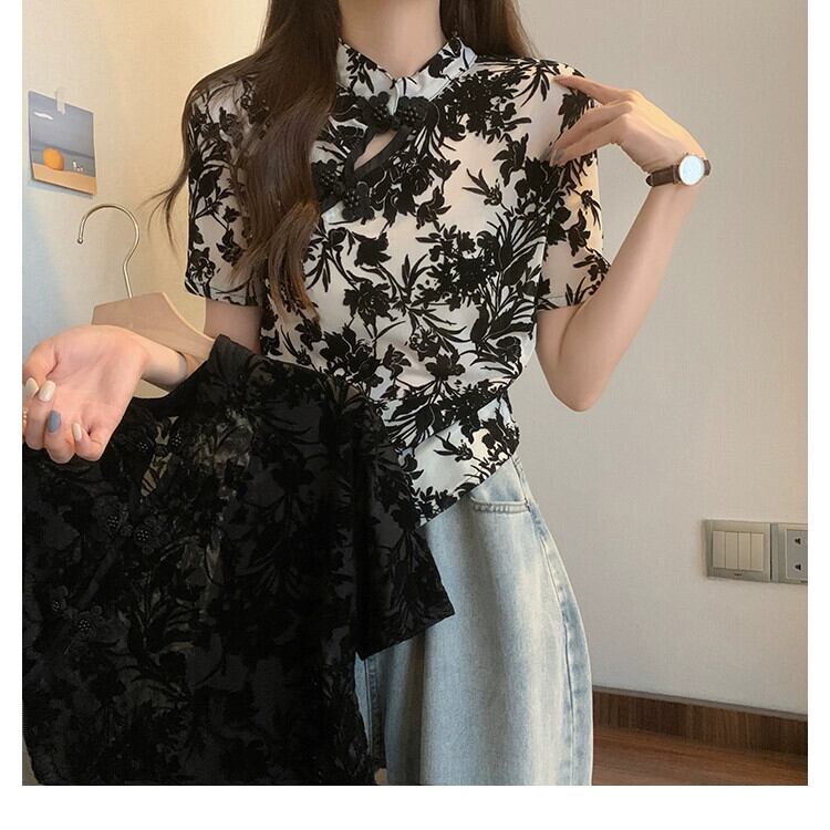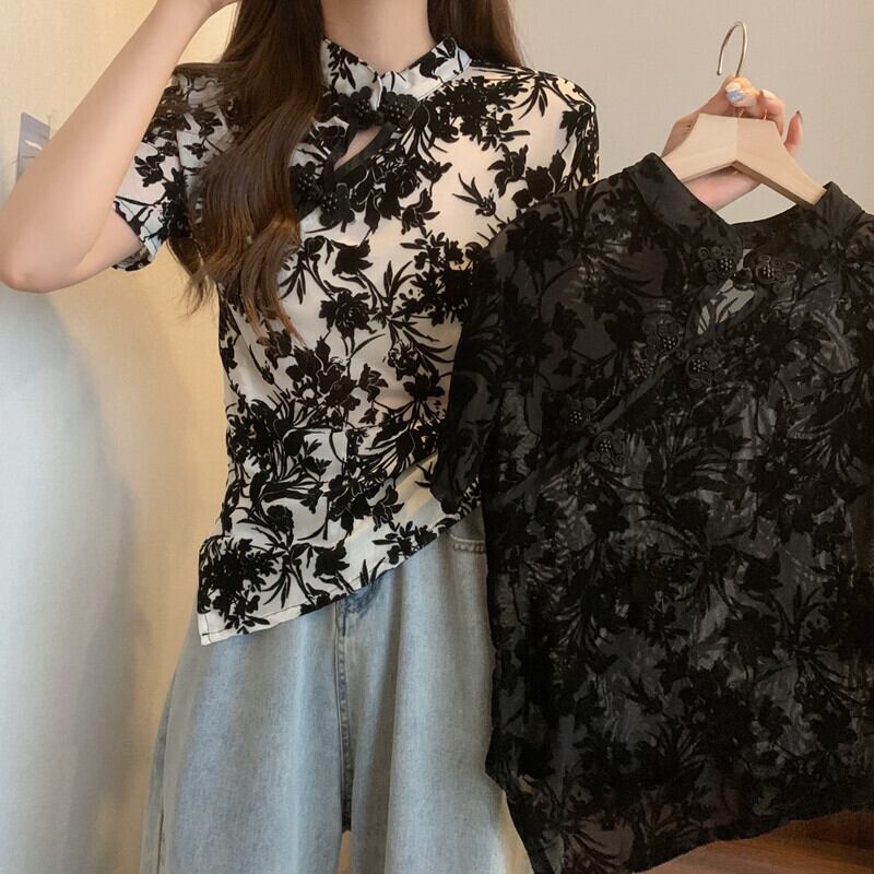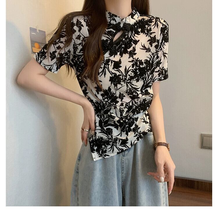 プラスサイズの婦人服 2023 ファットシスター夏新中国風国民風バックル不規則な植毛花柄 Tシャツ 大きめサイズ サマー 夏物 8884152468745817