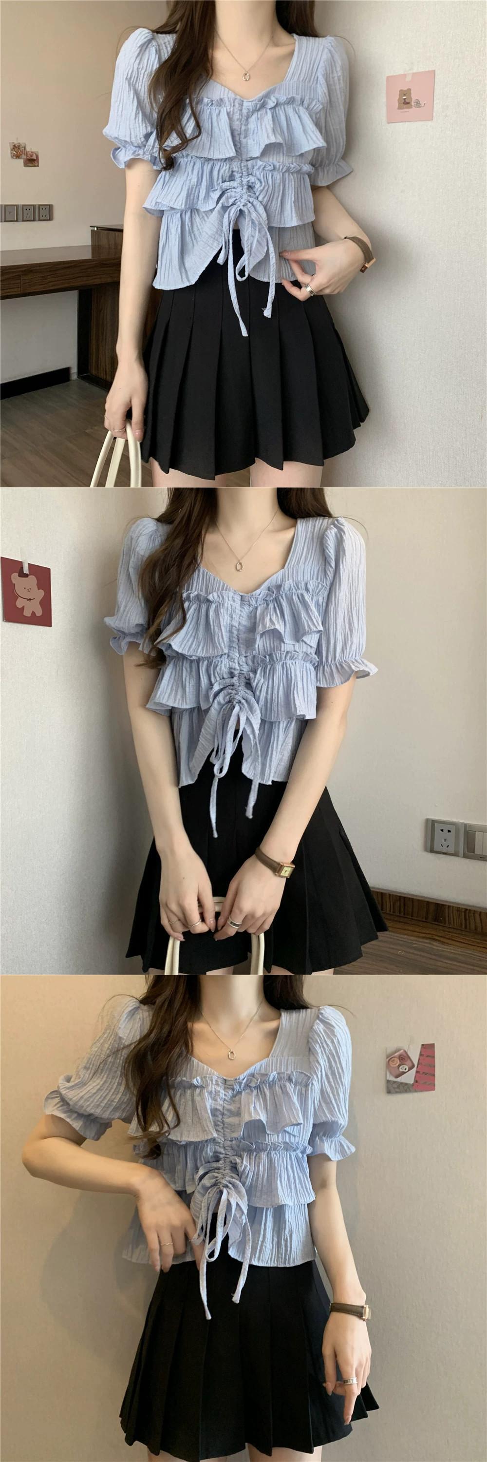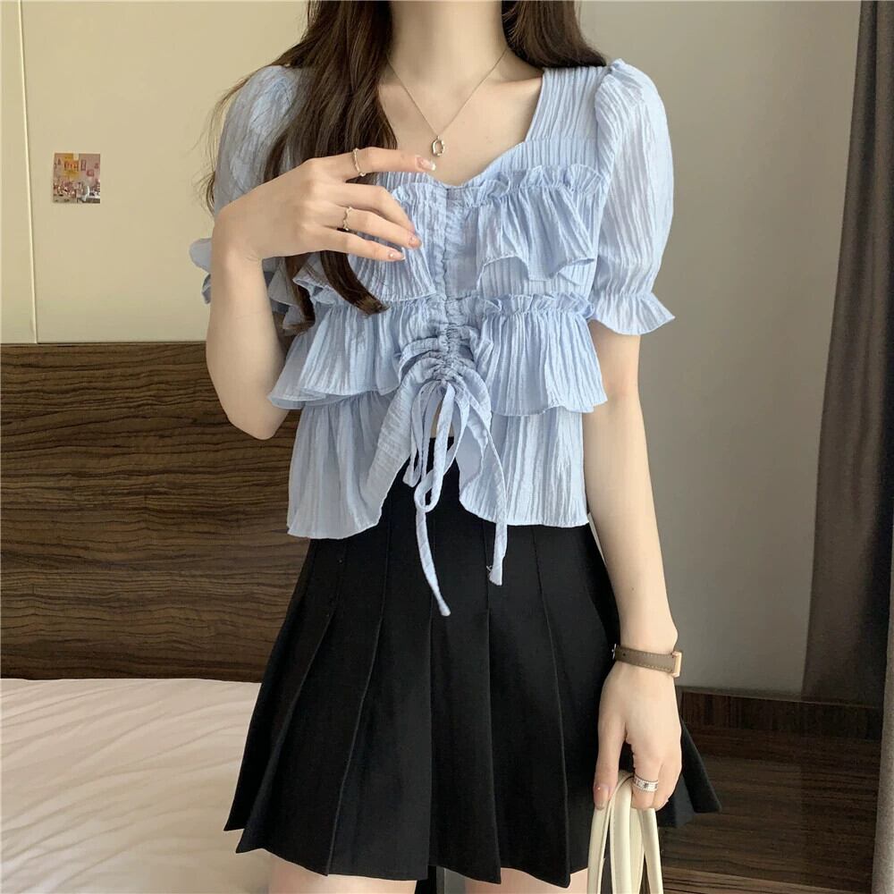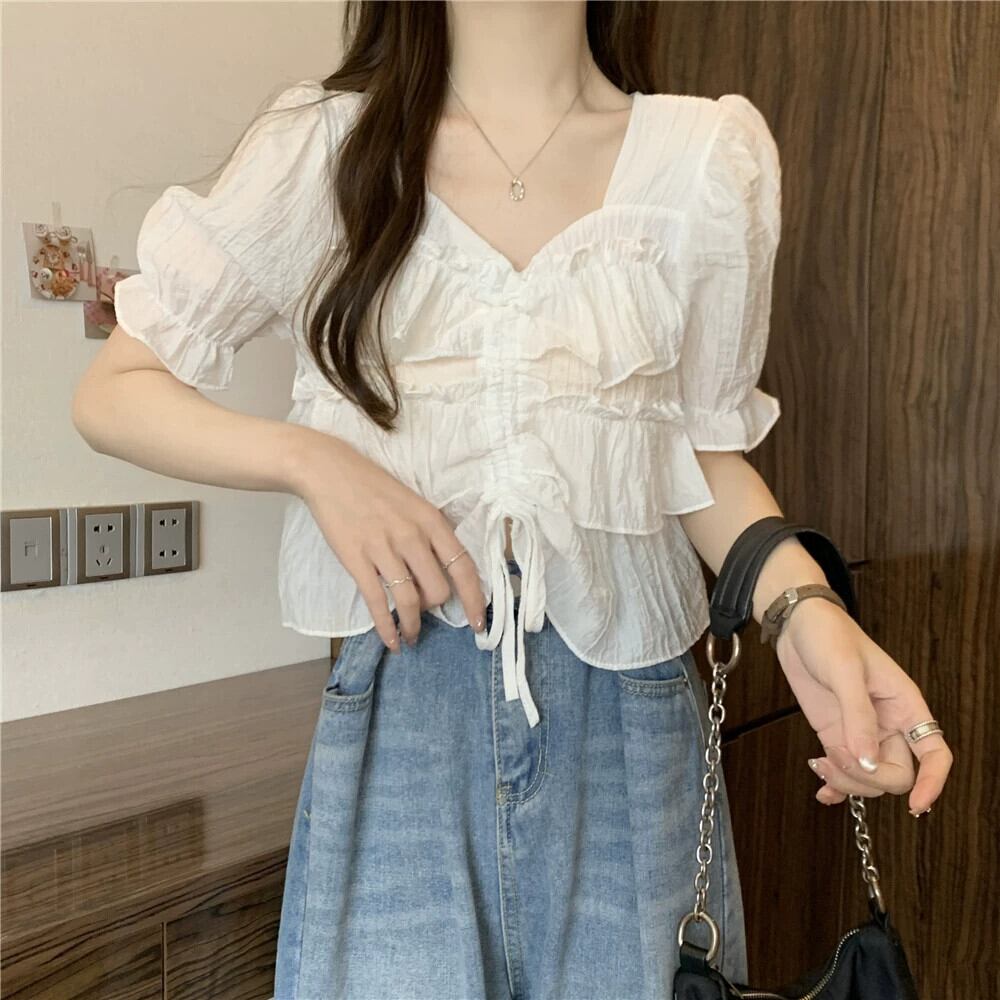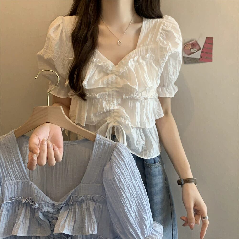 プラスサイズの婦人服 2023 ファットシスター夏新フレンチスクエアカラーパフスリーブフリルプリーツシャツ半袖トップ 大きめサイズ サマー 夏物 スクウェア 8884165182682309