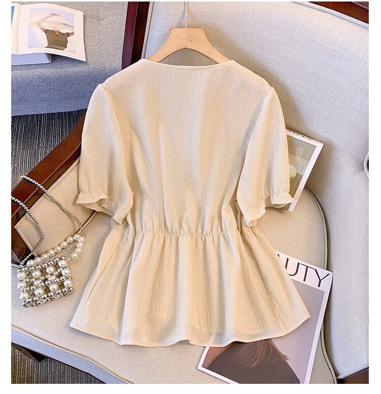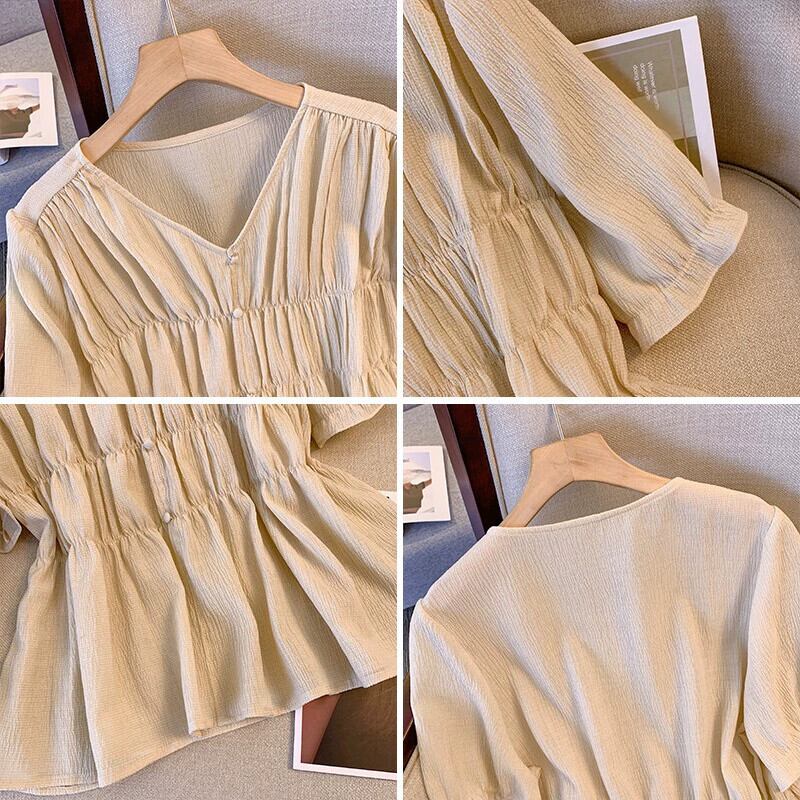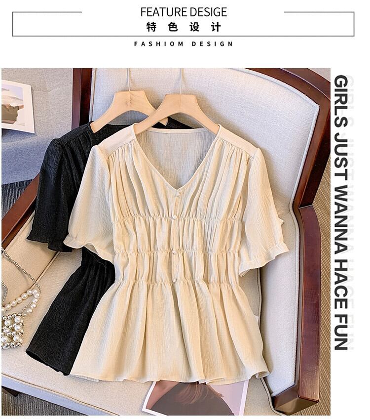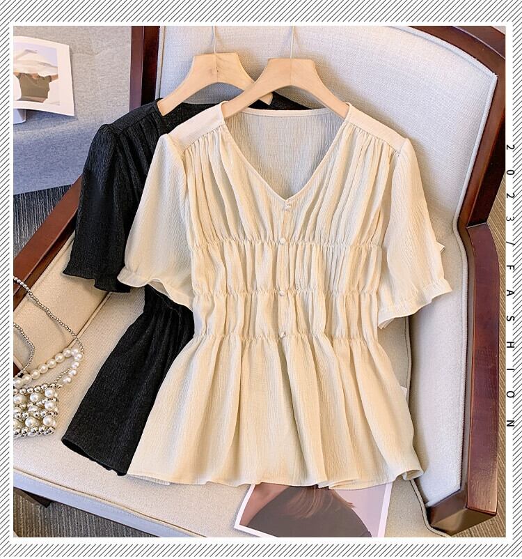 プラスサイズの婦人服 2023 トレンディな夏の新しいファットシスター半袖フレンチ V ネックシフォンシャツスリムフィットシックなシックなトップ 大きめサイズ サマー 夏物 Vネック 8884136298169020